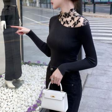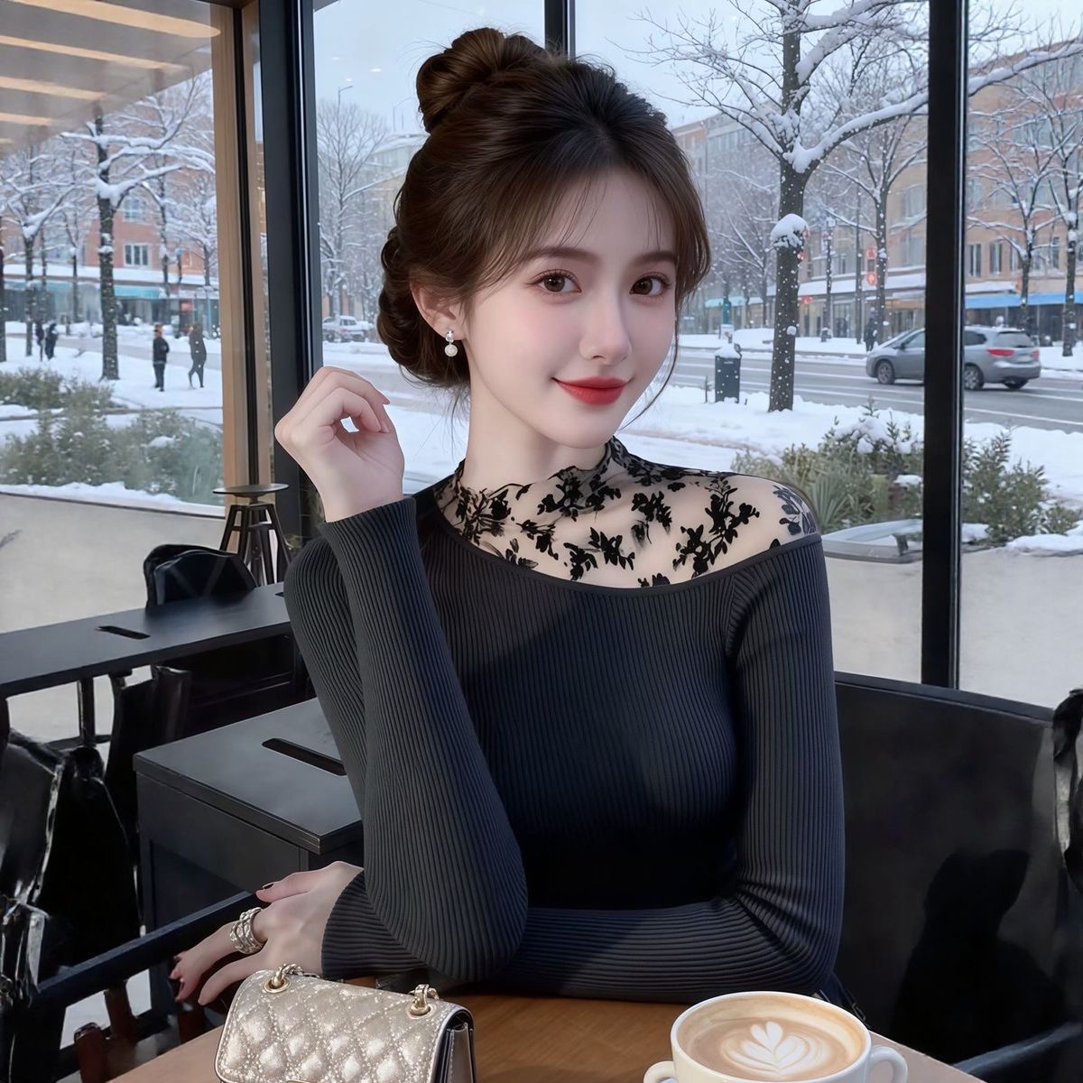 FA49693# 秋冬新款巨好看轻熟上衣高级感独特别致漂亮蕾丝拼接显瘦打底衫女