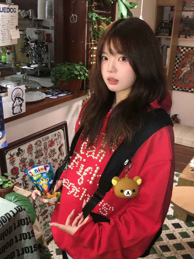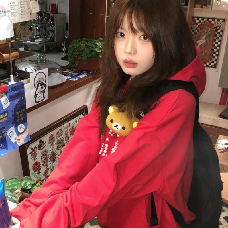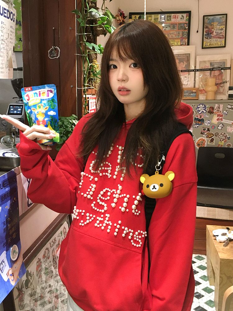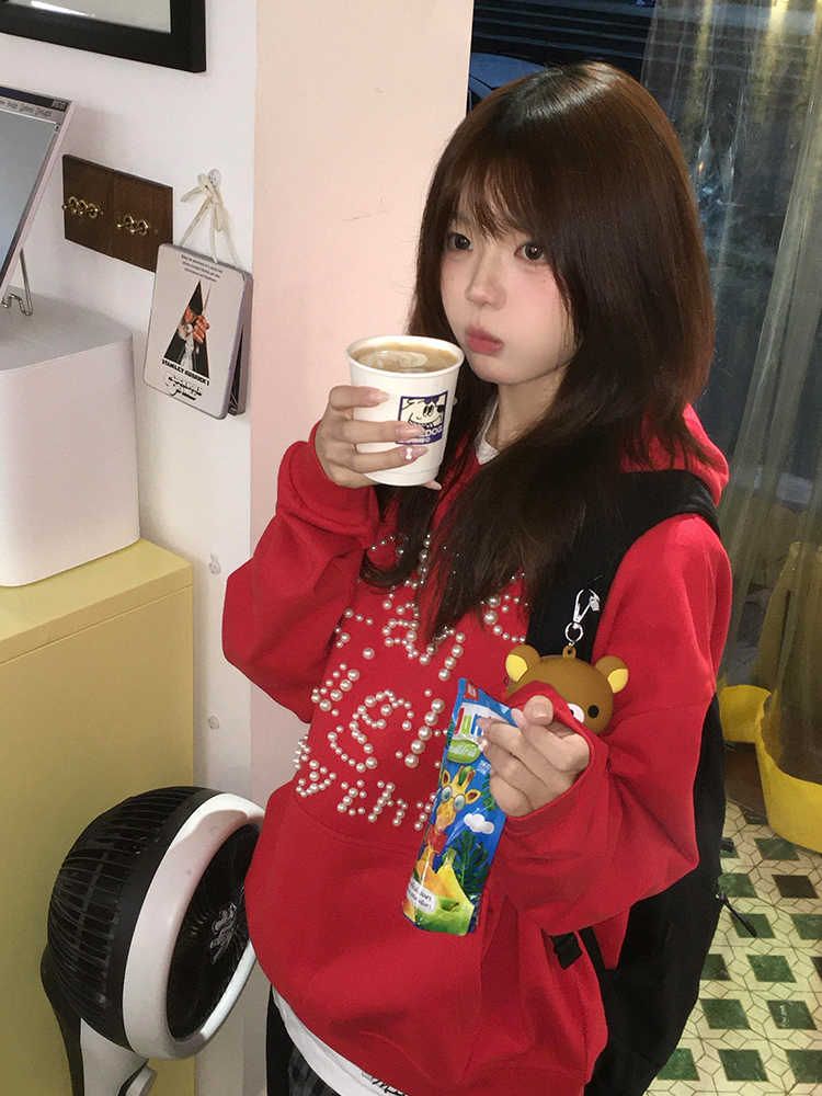 FA49700# 红色连帽卫衣女秋冬字母钉珠大码女装宽松显瘦情侣外套上衣