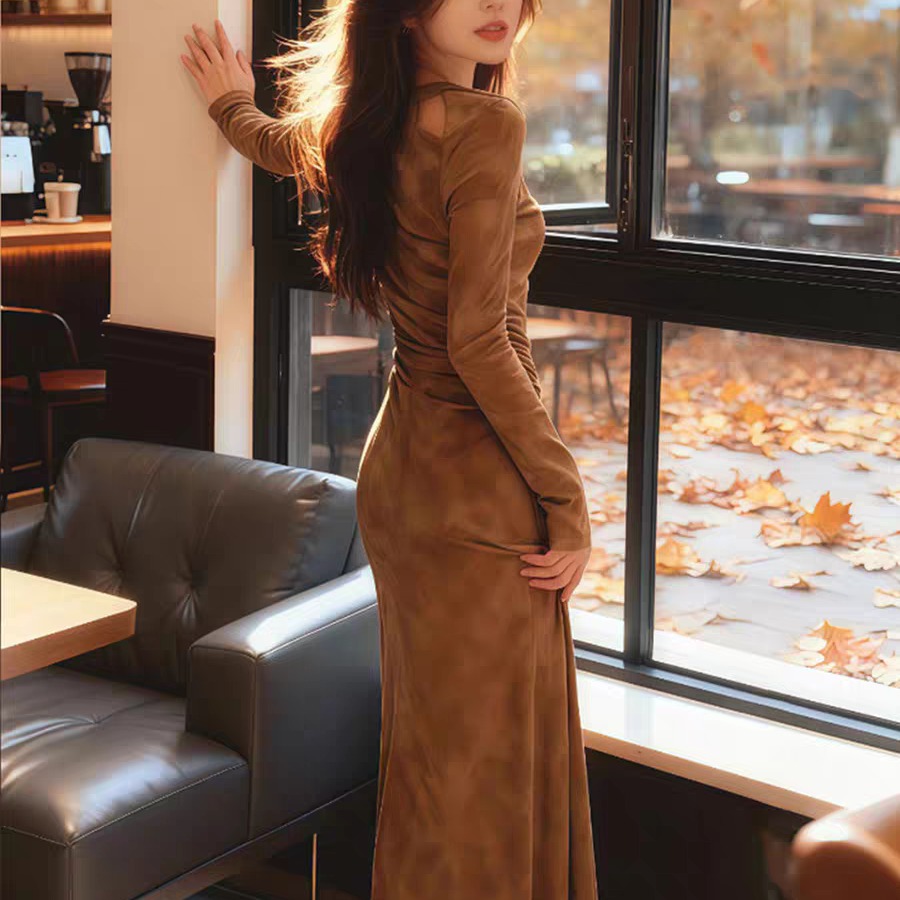 FA49741# 秋冬新款法式高级轻奢名媛连衣裙女装时尚收腰打底包臀长裙子