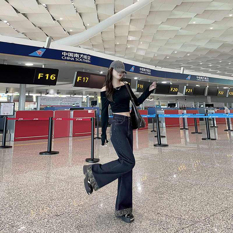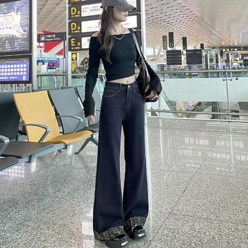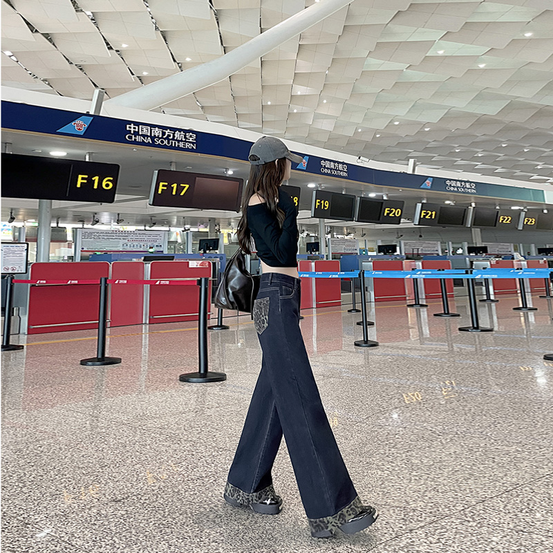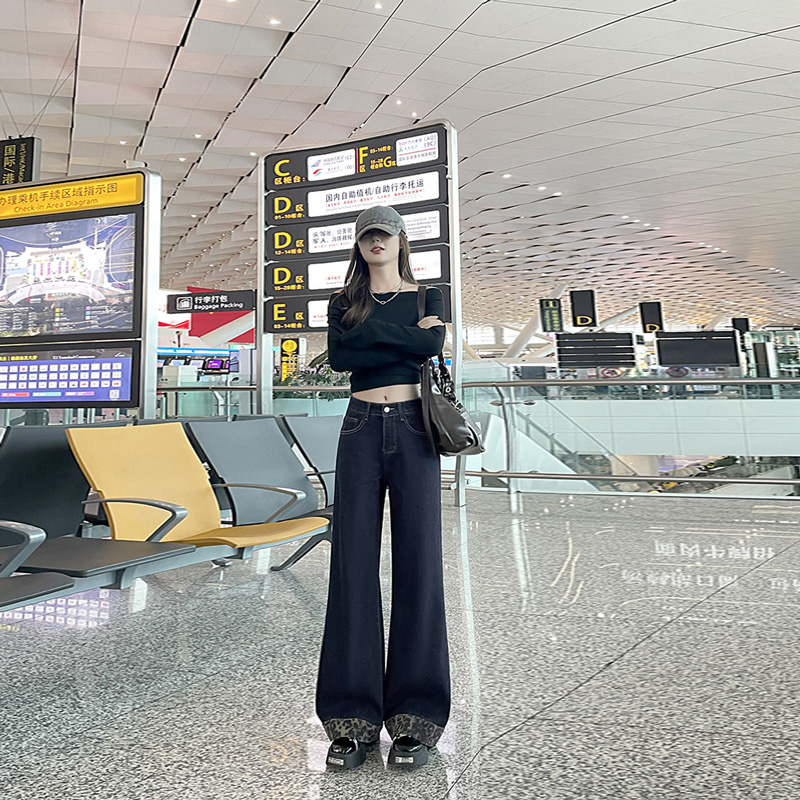 FA49752# -高腰大码款胖mm拼接豹纹阔腿牛仔裤女直筒卷边拖地长裤子 服裝批發女裝批發服飾貨源