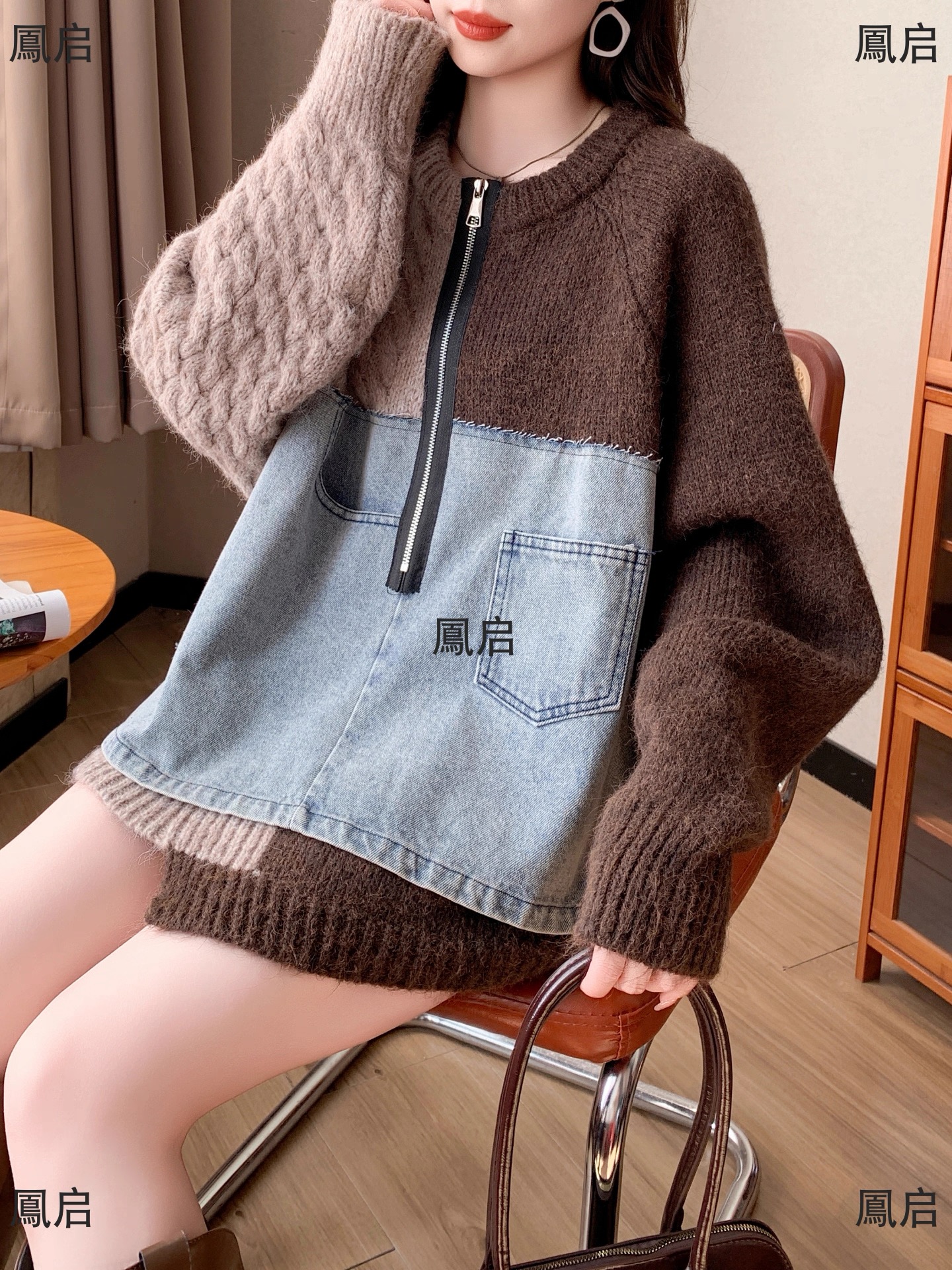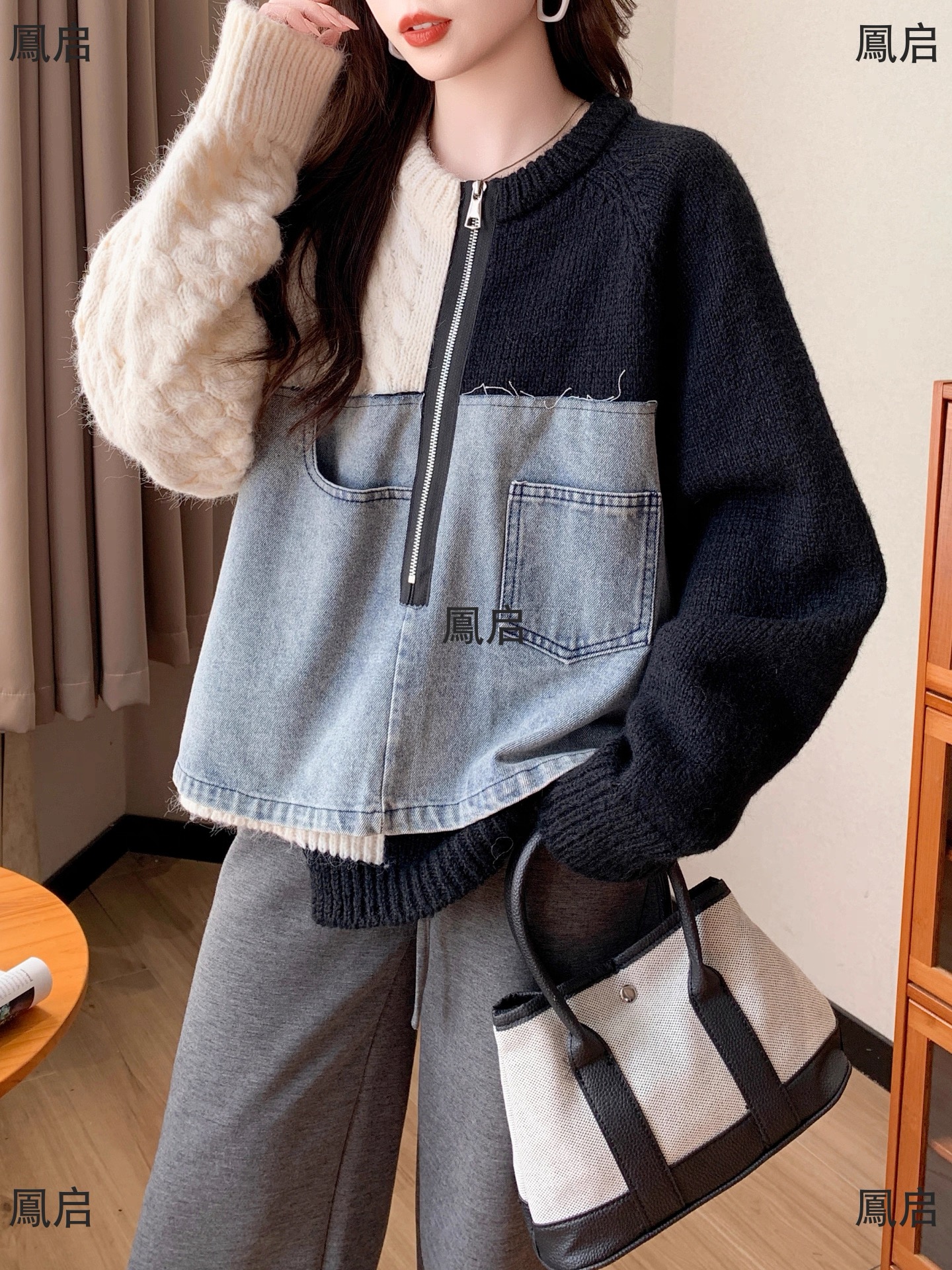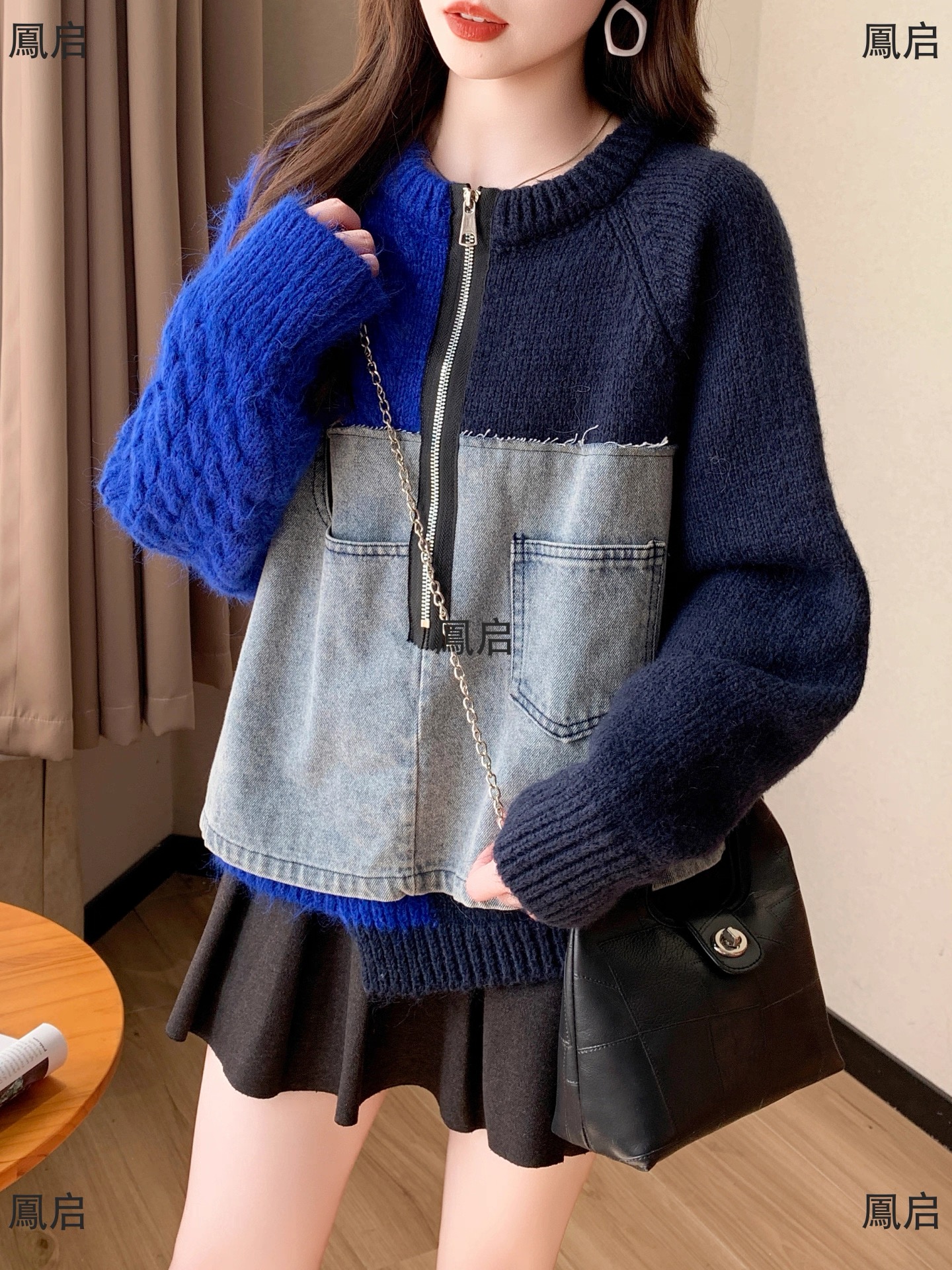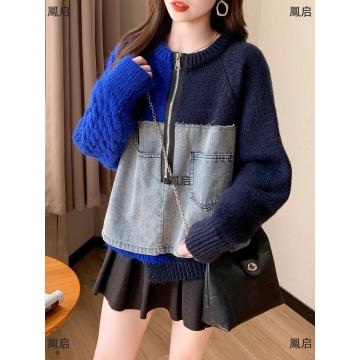 FA50623# 秋冬新款韩版牛仔拼接针织毛衣女原创设计感短款小众显瘦上衣 服裝批發女裝批發服飾貨源