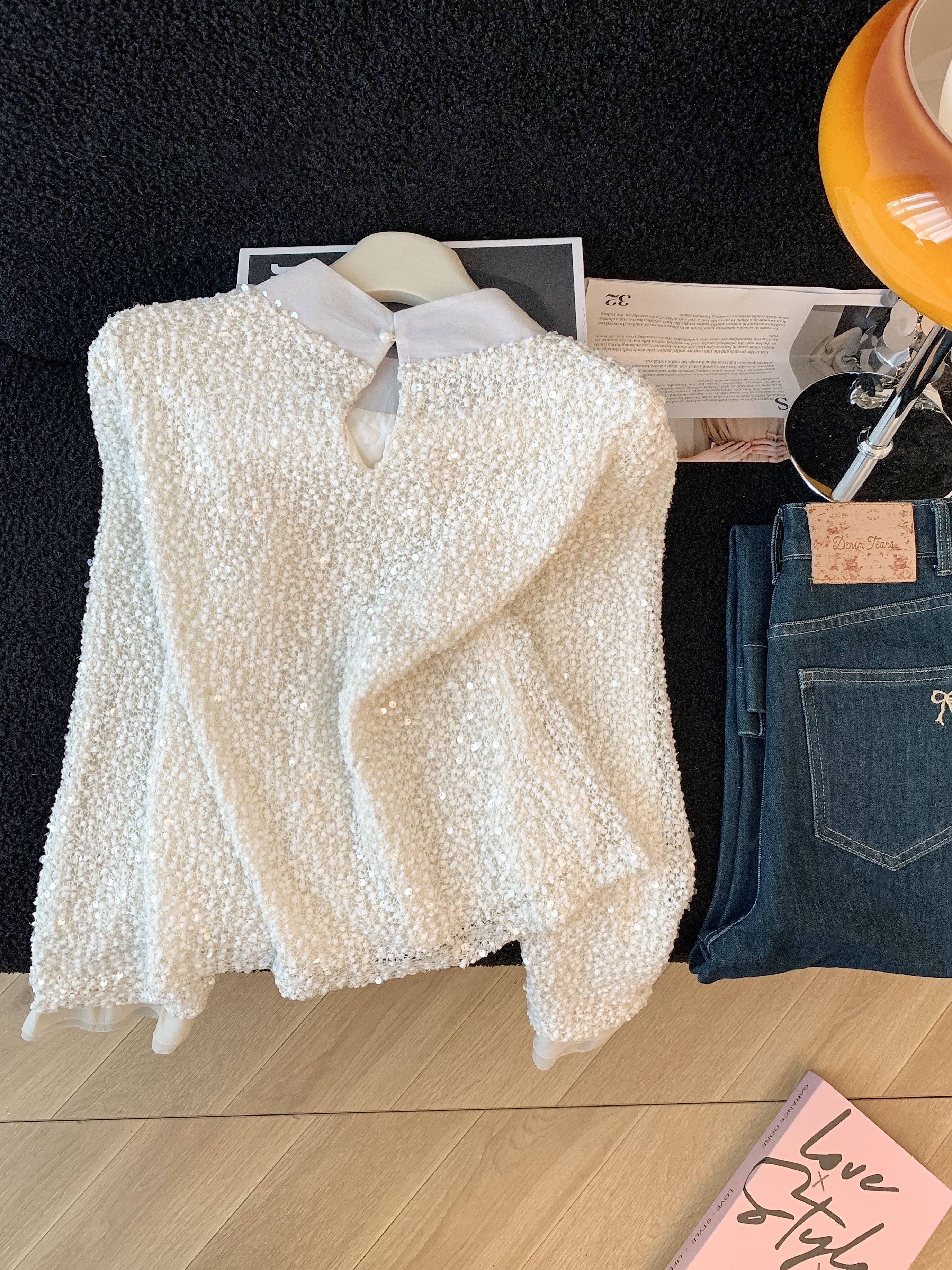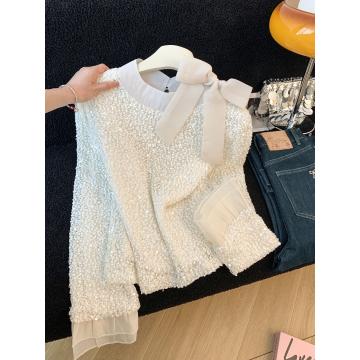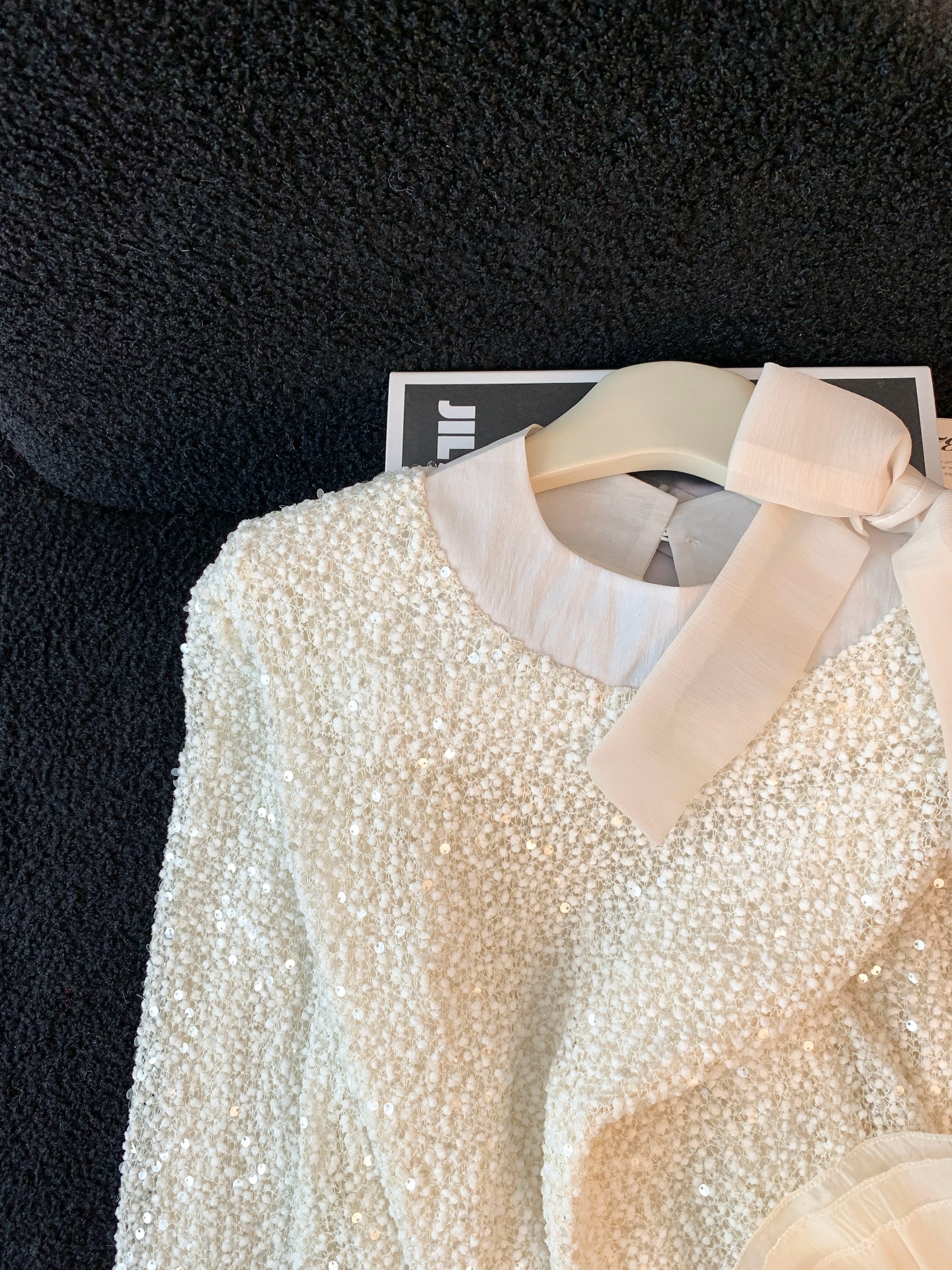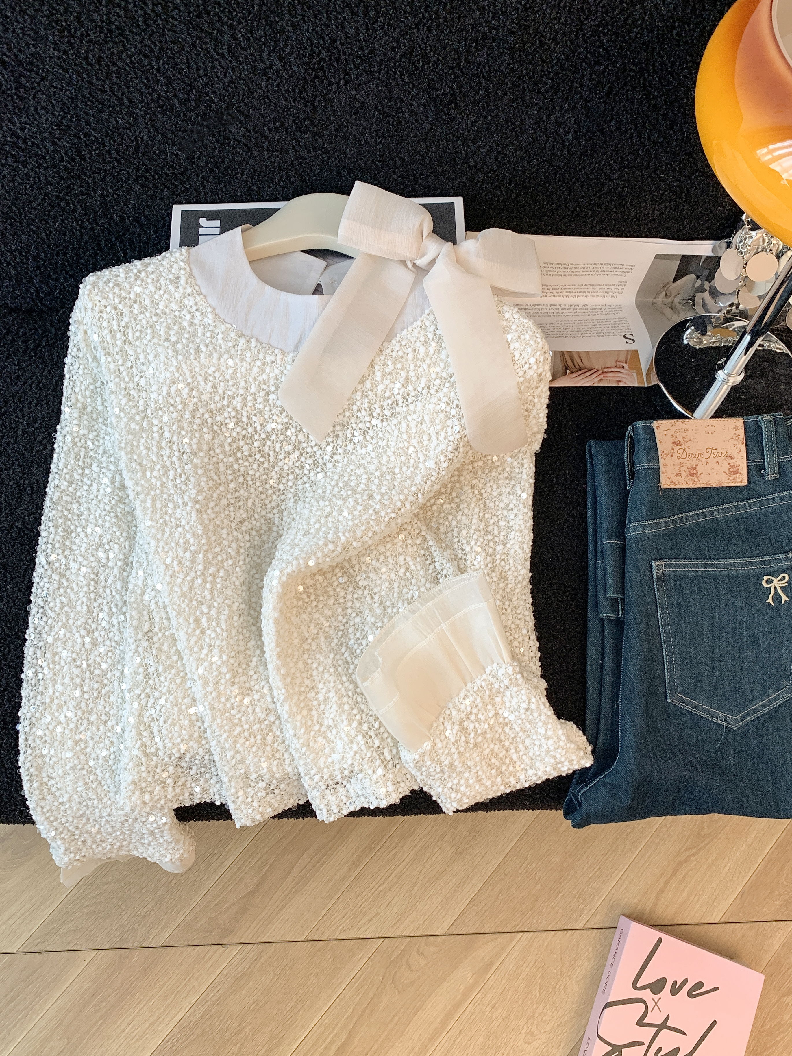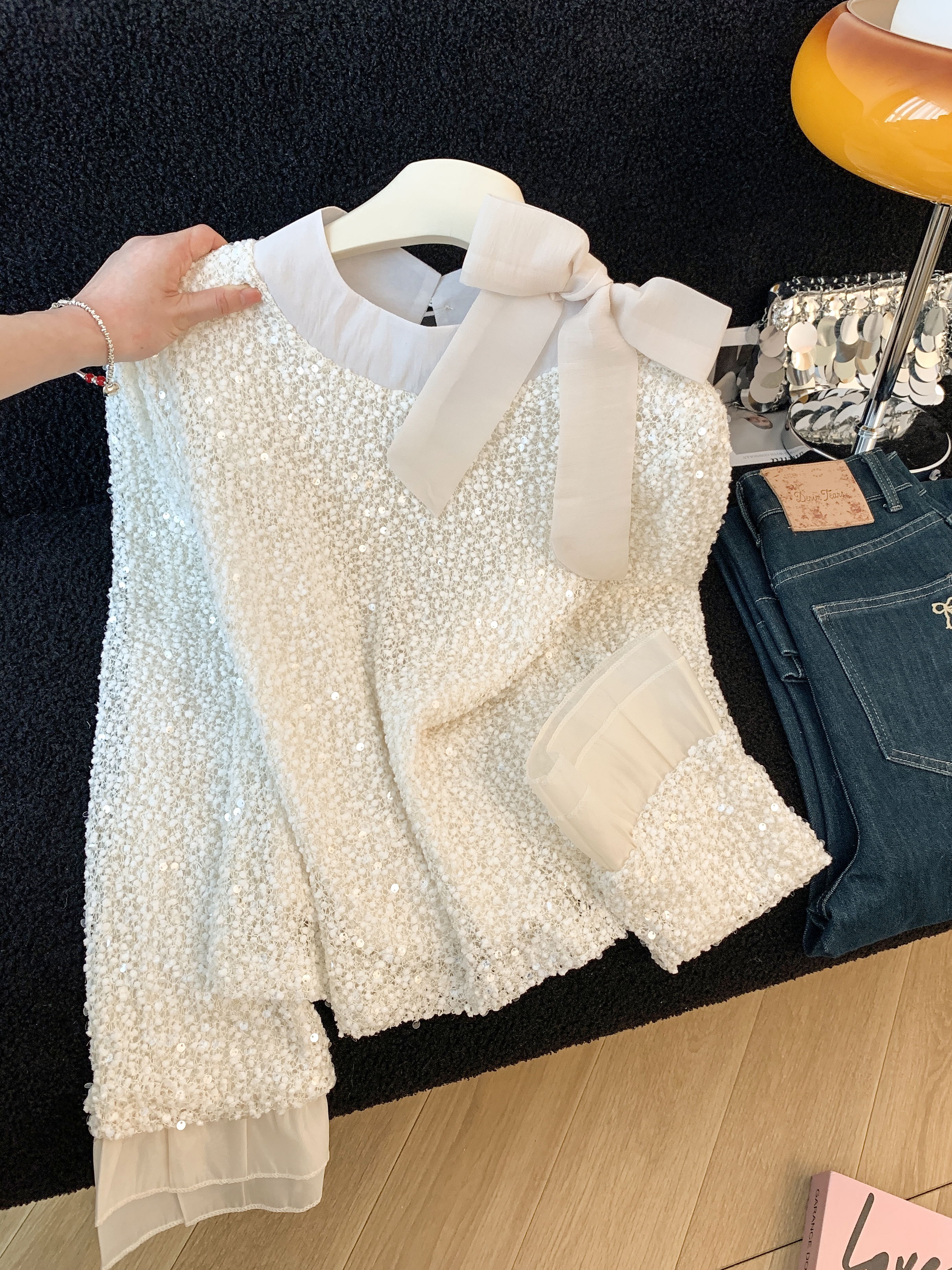 FA51520# ~名媛重工亮片蝴蝶结衬衫女新款别致喇叭长袖打底上衣 服裝批發女裝批發服飾貨源
