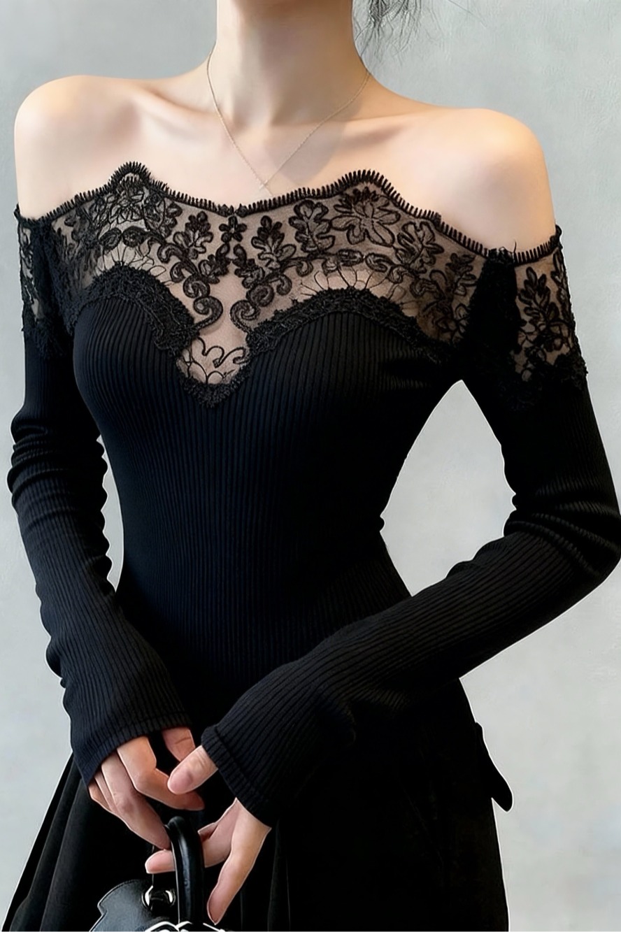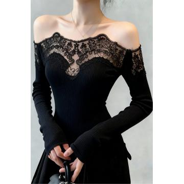 Home > 长袖T恤 > FA51742# 性感甜辣妹蕾丝拼接一字肩锁骨黑色打底衫女内搭露肩长袖上衣 服裝批發女裝批發服飾貨源