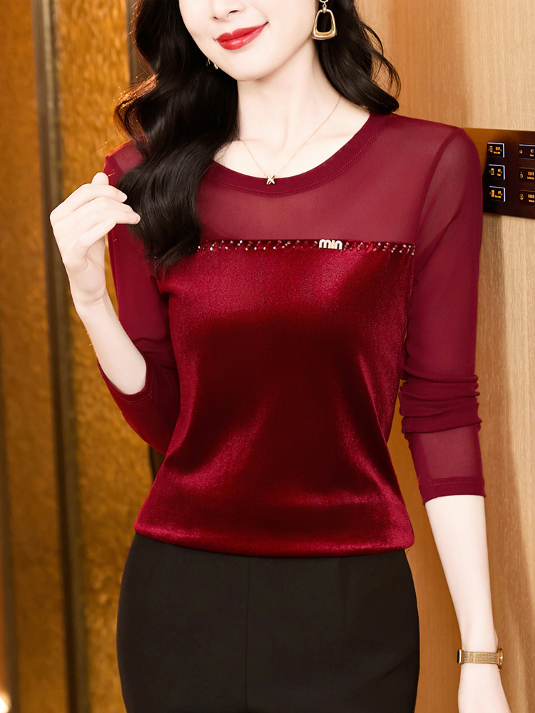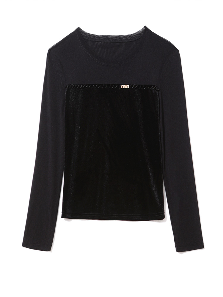 FA52169# 新款时尚百搭圆领丝绒钉珠拼接网纱长袖打底衫女 服裝批發女裝批發服飾貨源