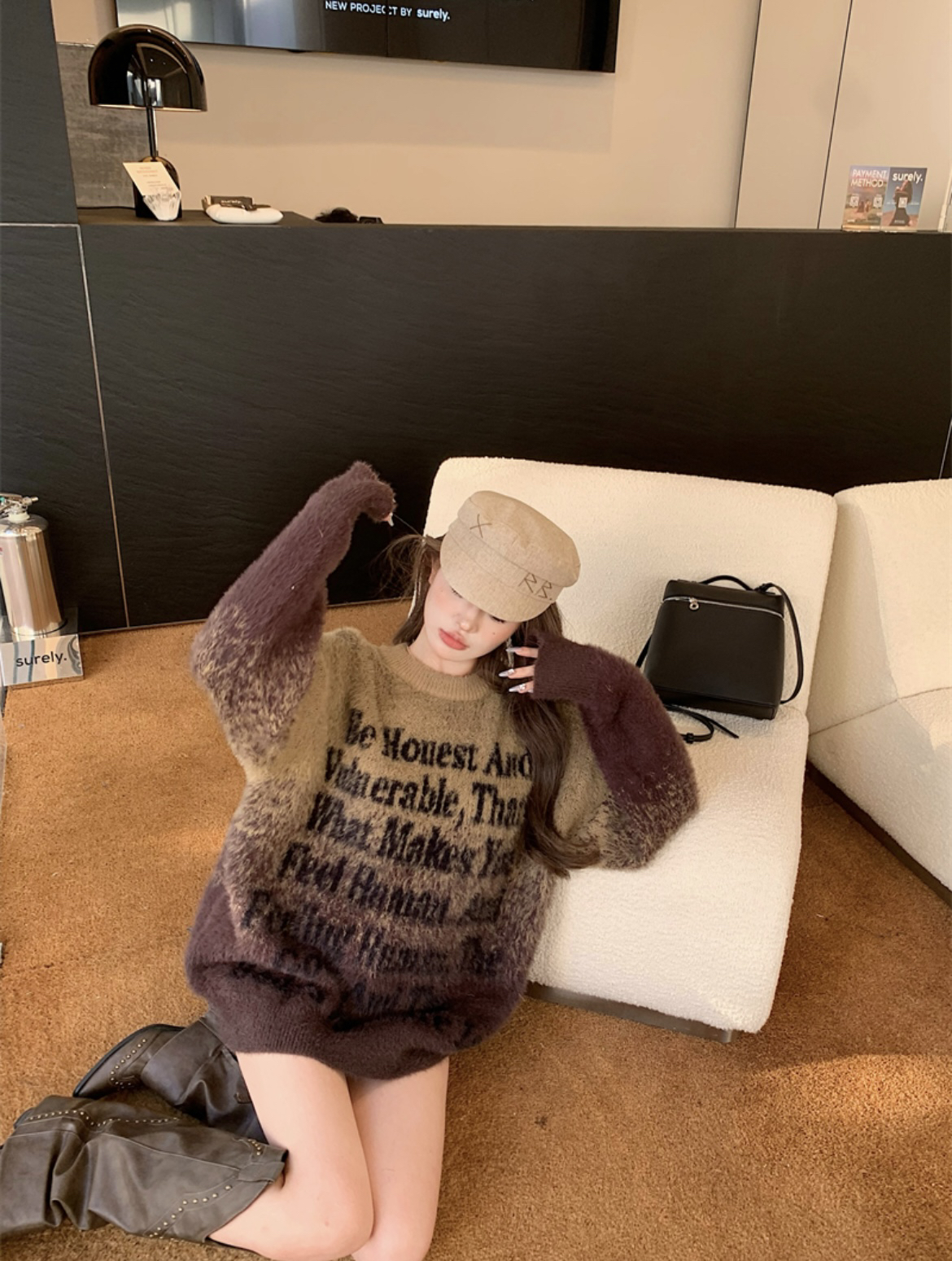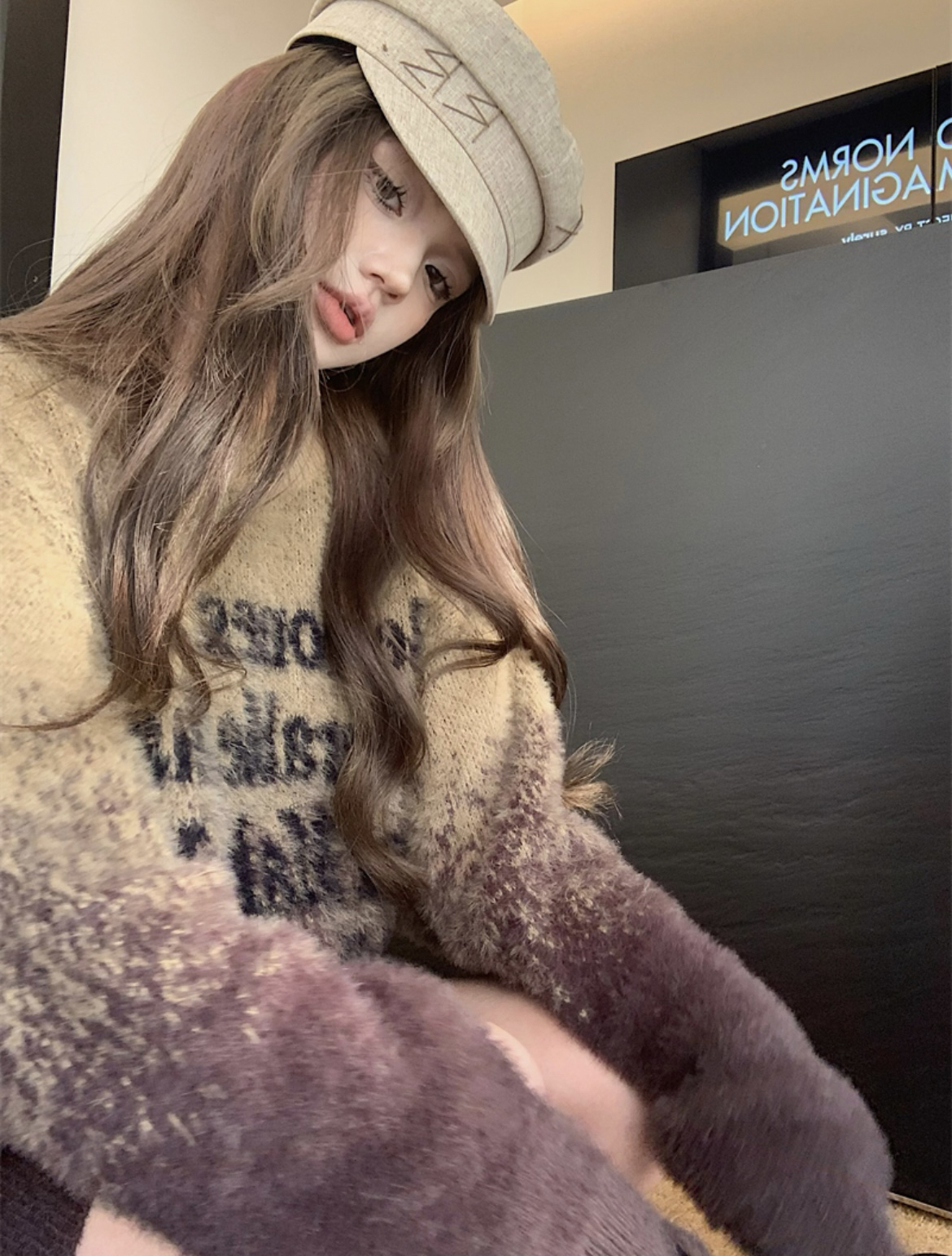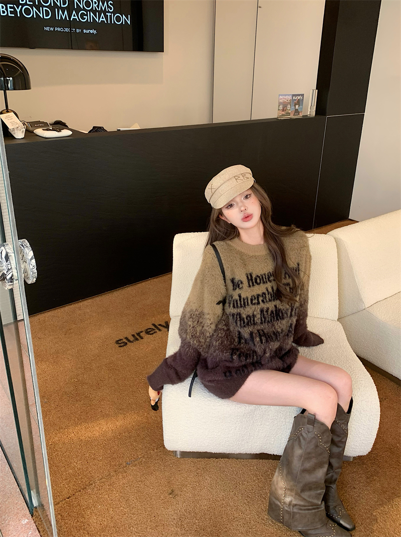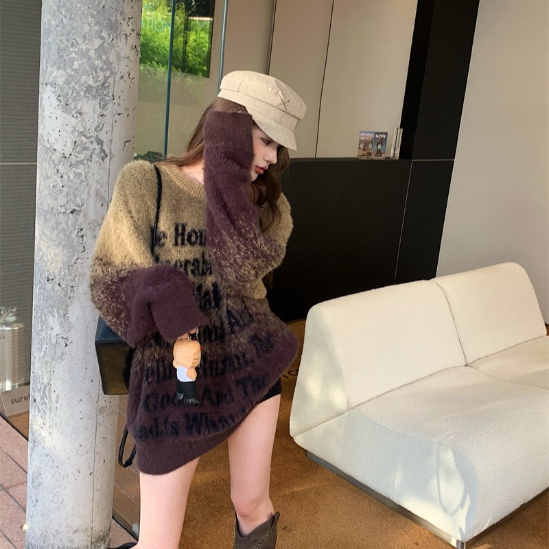 FA52180# 美拉德美式复古风水貂绒渐变字母宽松休闲圆领毛衣 服裝批發女裝批發服飾貨源
