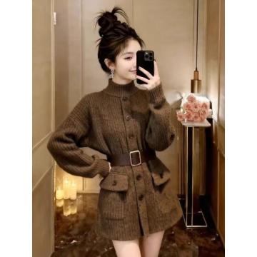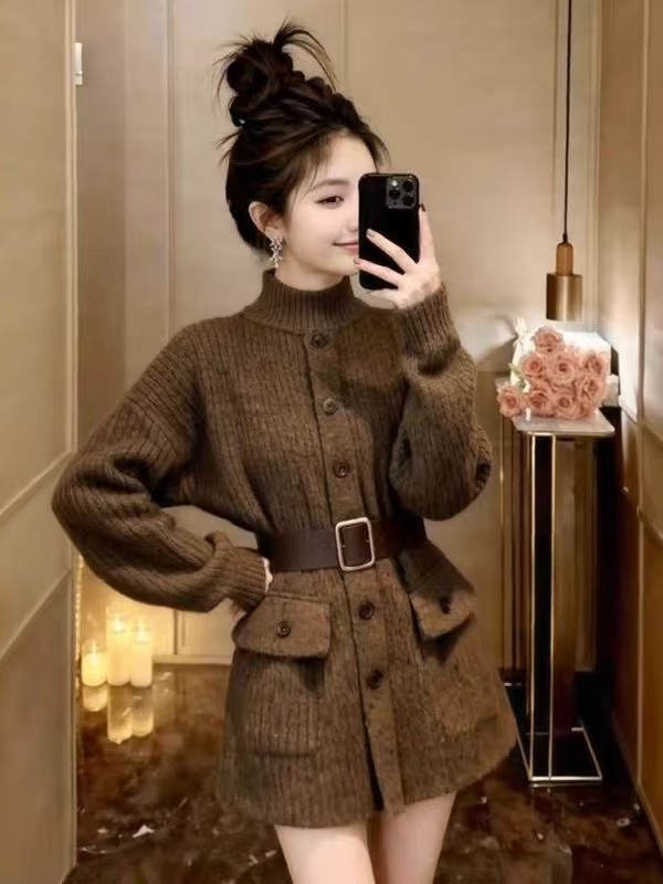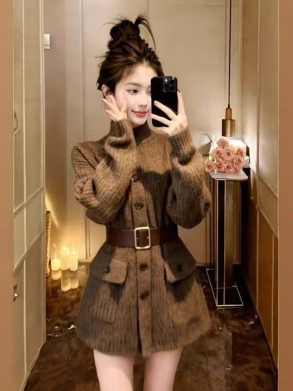 FA52190# 美拉德风棕色立领针织连衣裙女秋冬季收腰高级感气质毛衣裙子 服裝批發女裝批發服飾貨源