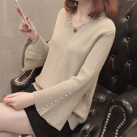 FA52193# V领毛衣女春秋新款短款喇叭袖打底衫长袖百搭时尚大码针织衫 服裝批發女裝批發服飾貨源