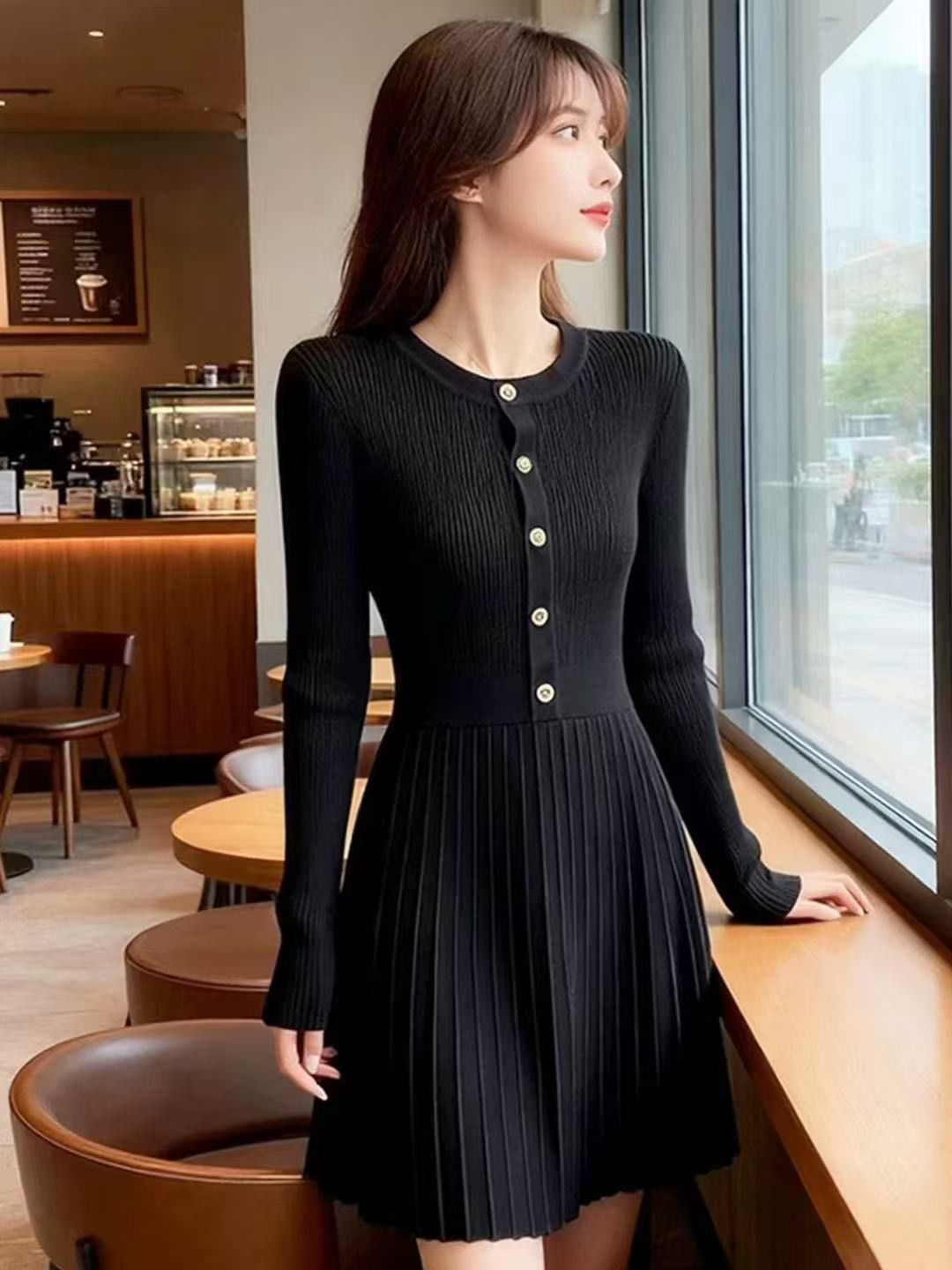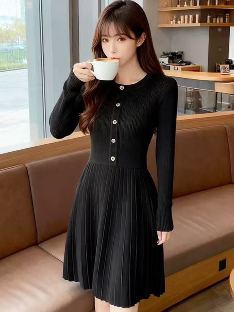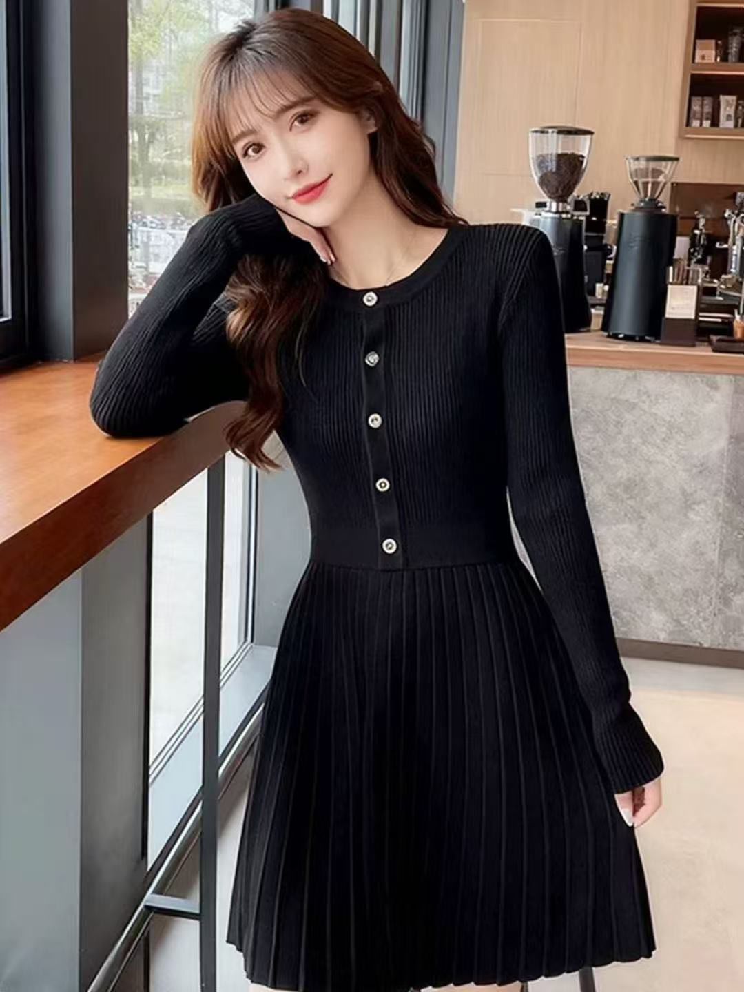 FA52208# 秋冬季外穿气质内搭长袖黑色针织连衣裙收腰A字裙配大衣的毛衣裙 服裝批發女裝批發服飾貨源