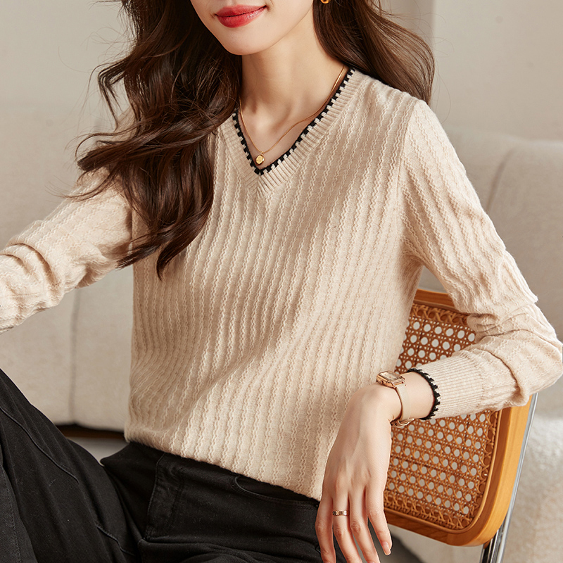 FA53048# 春季长袖t恤女打底衫新款洋气减龄宽松上衣v领针织衫 服裝批發女裝批發服飾貨源