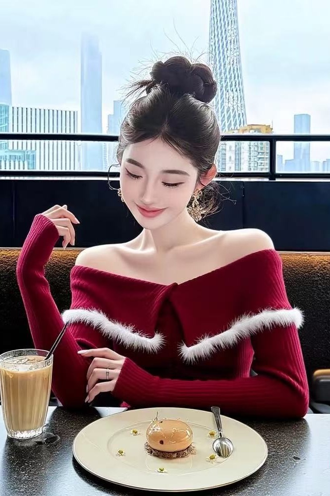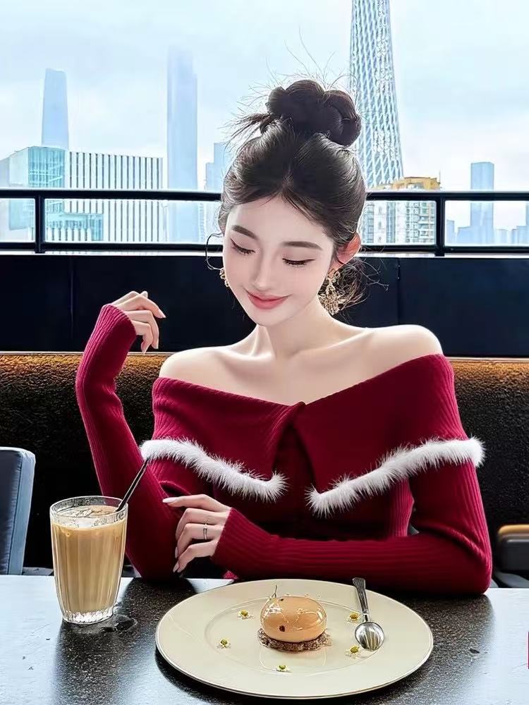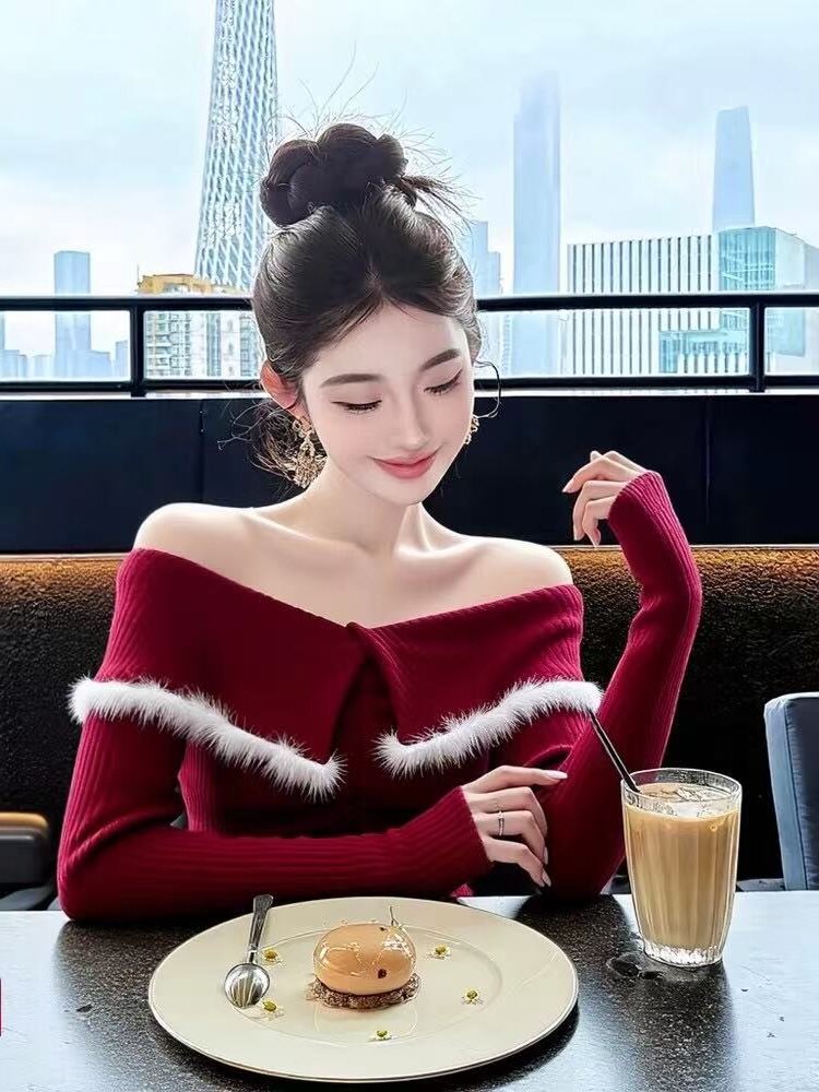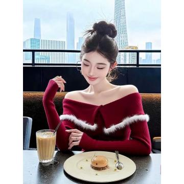 FA53061# 新年穿搭洋气独特别致修身打底衫女秋冬新款红色一字肩长袖上衣女 服裝批發女裝批發服飾貨源