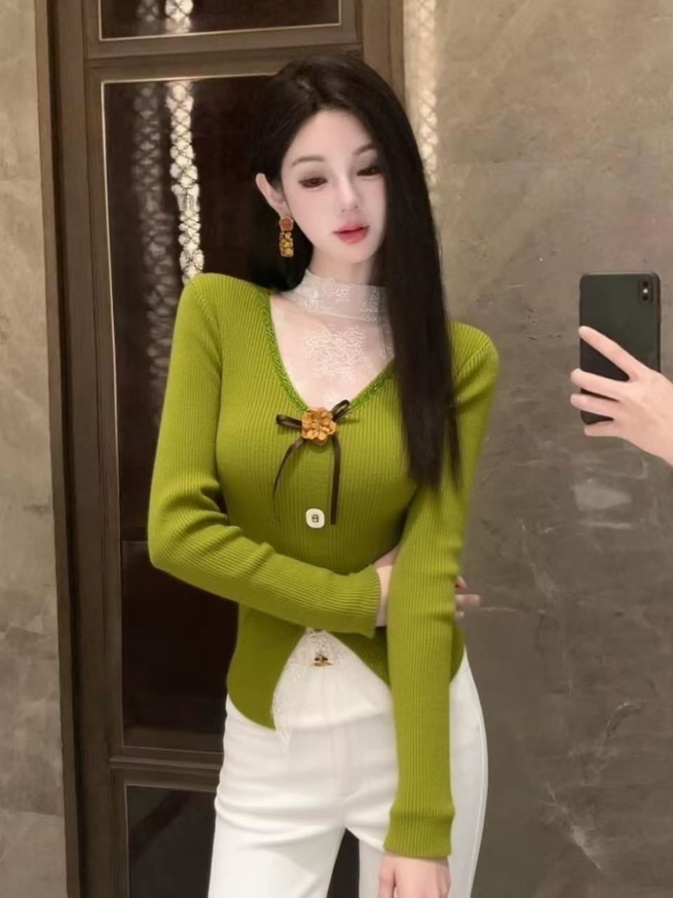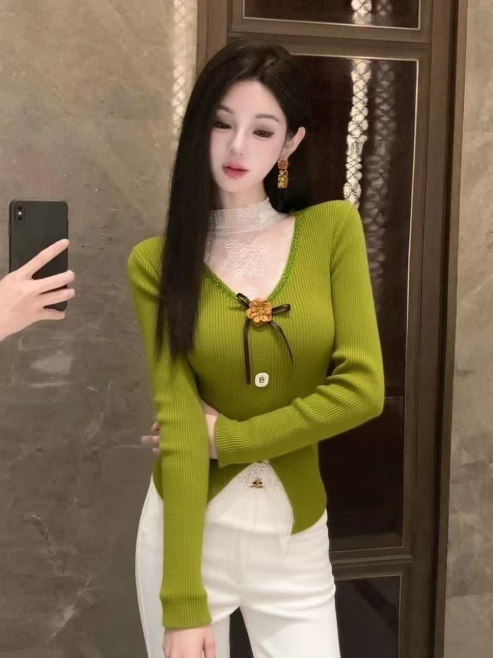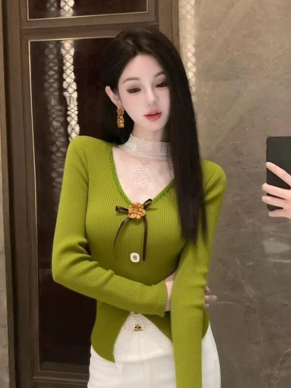 FA53062# 独特漂亮绿色拼接针织衫女冬季新款立体花朵修身显瘦内搭毛衣 服裝批發女裝批發服飾貨源
