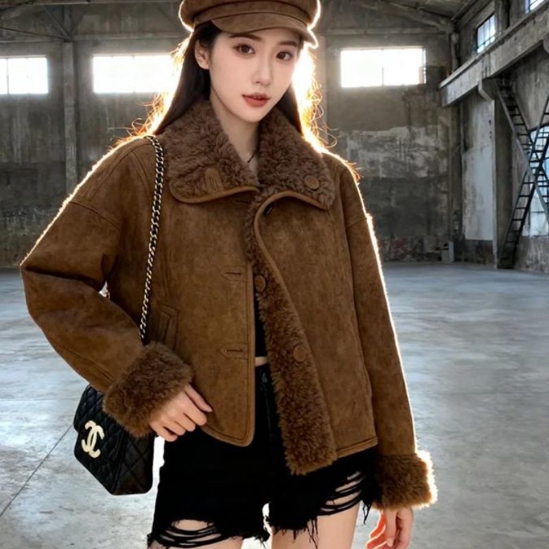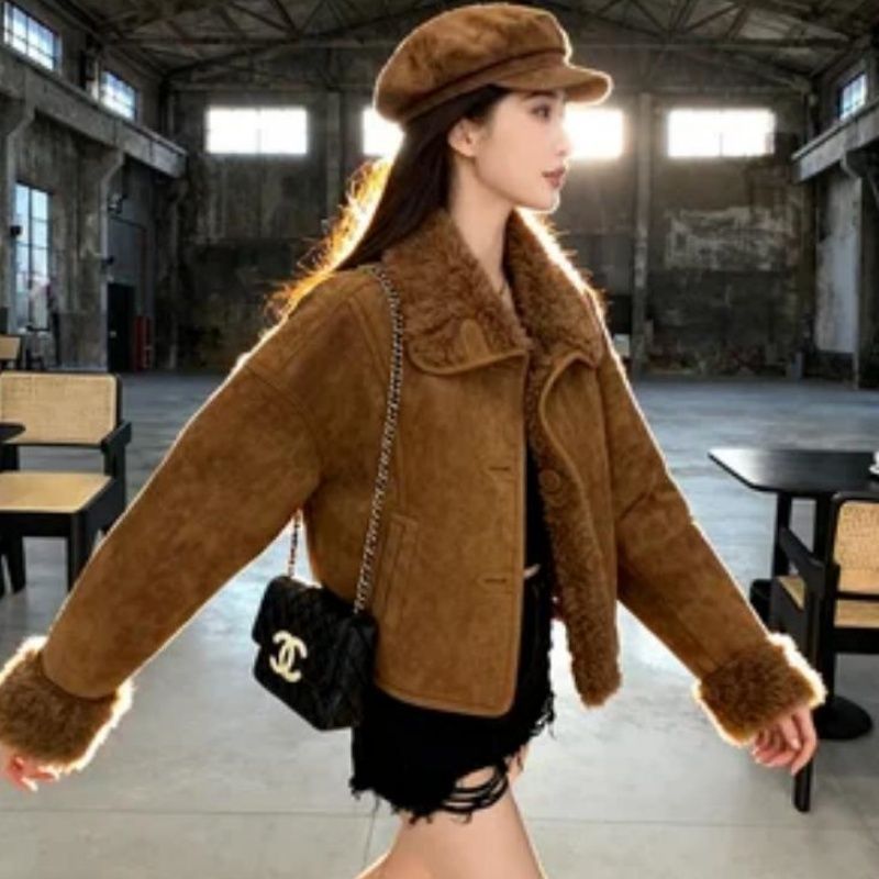 FA53068# 咖色羊羔外套皮毛一体新款复古拉德保暖上衣小个子毛毛短款外套 服裝批發女裝批發服飾貨源
