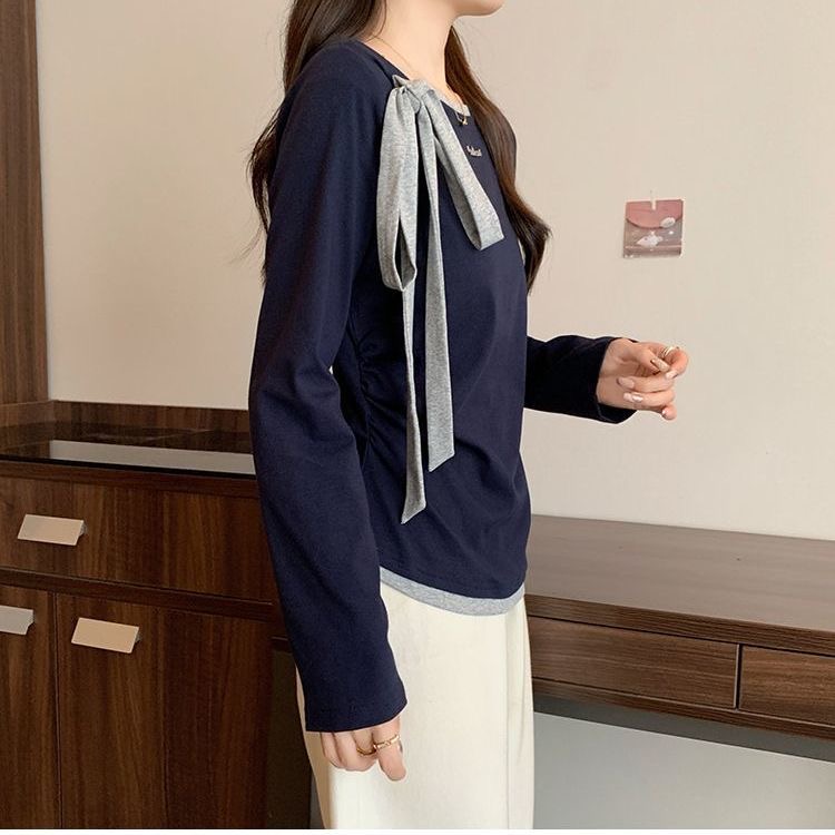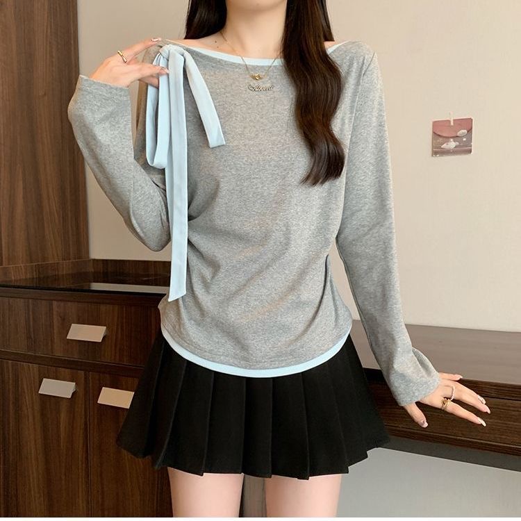 FA53091# 早春新款独特撞色一字肩长袖t恤大码女装蝴蝶结绑带设计上衣 服裝批發女裝批發服飾貨源