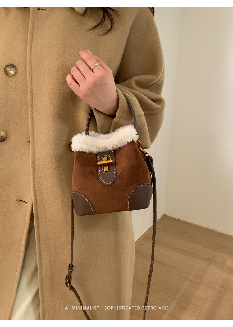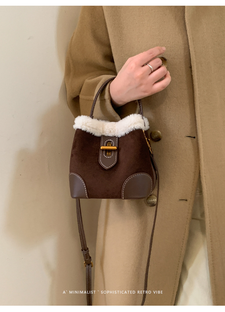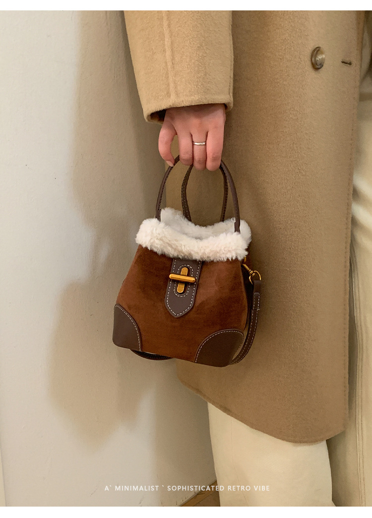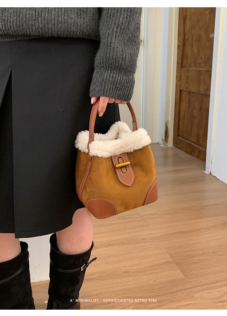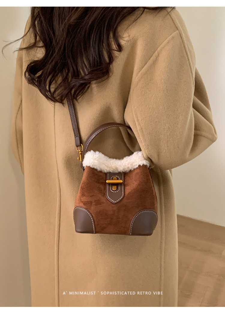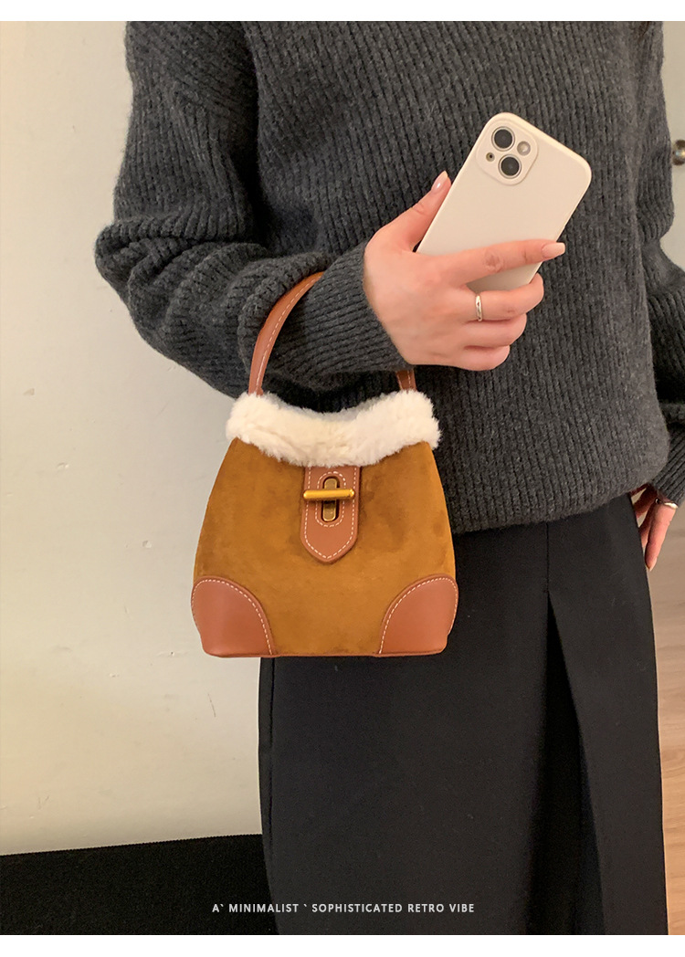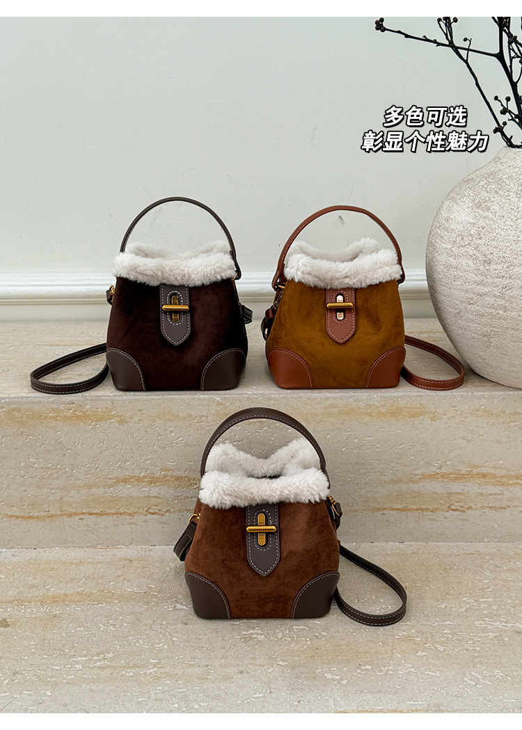 TJ2234# 2025秋冬新款时尚毛毛迷你手提水桶包高级感美拉德绒面复古斜挎包