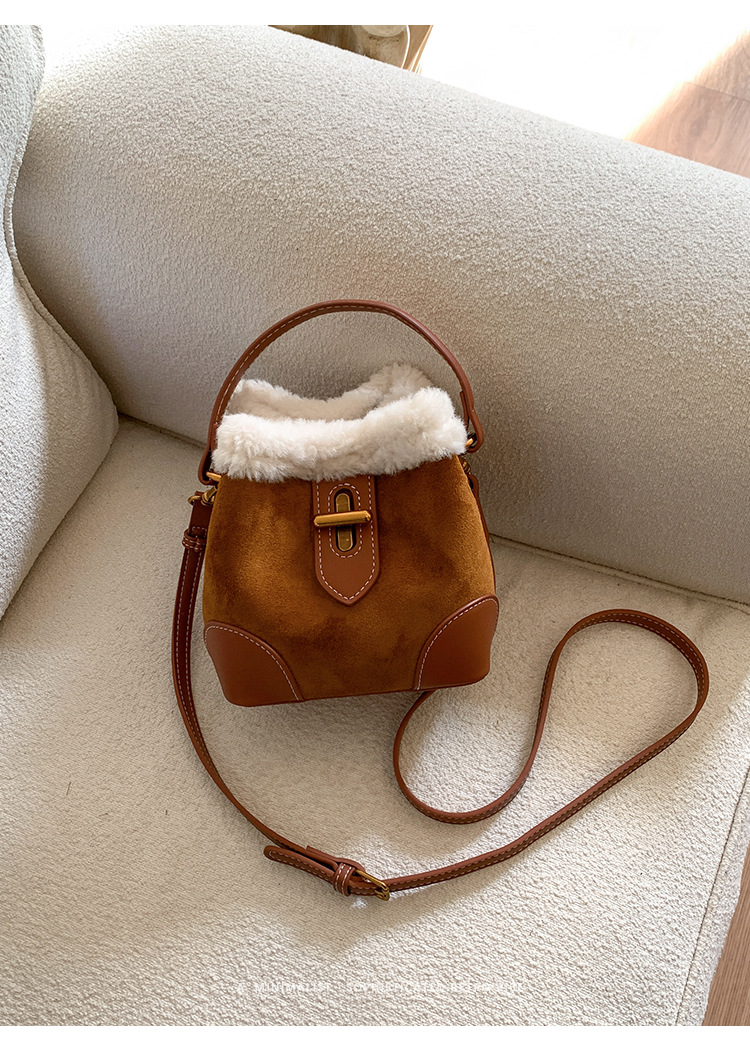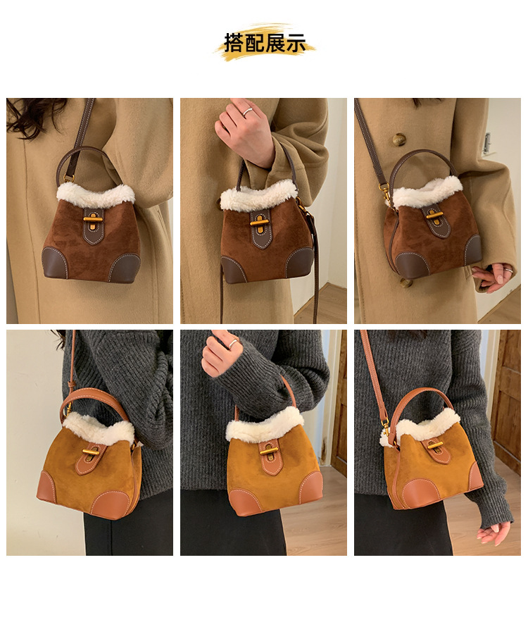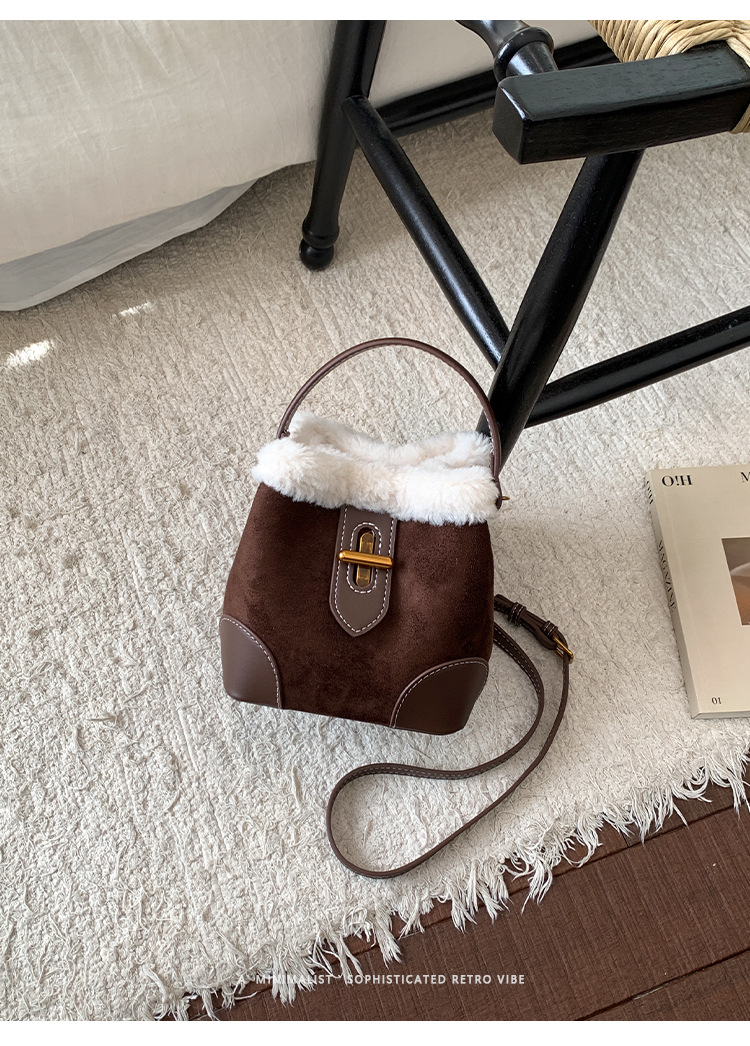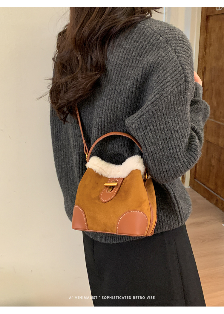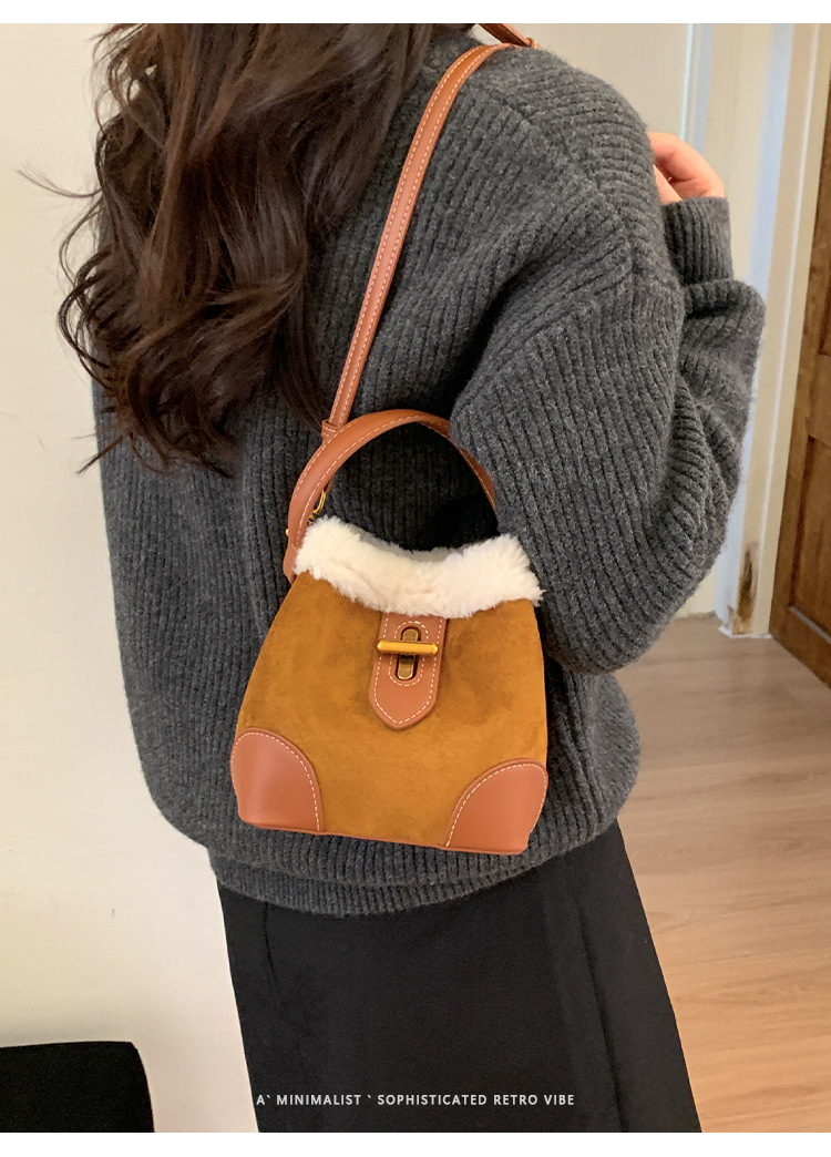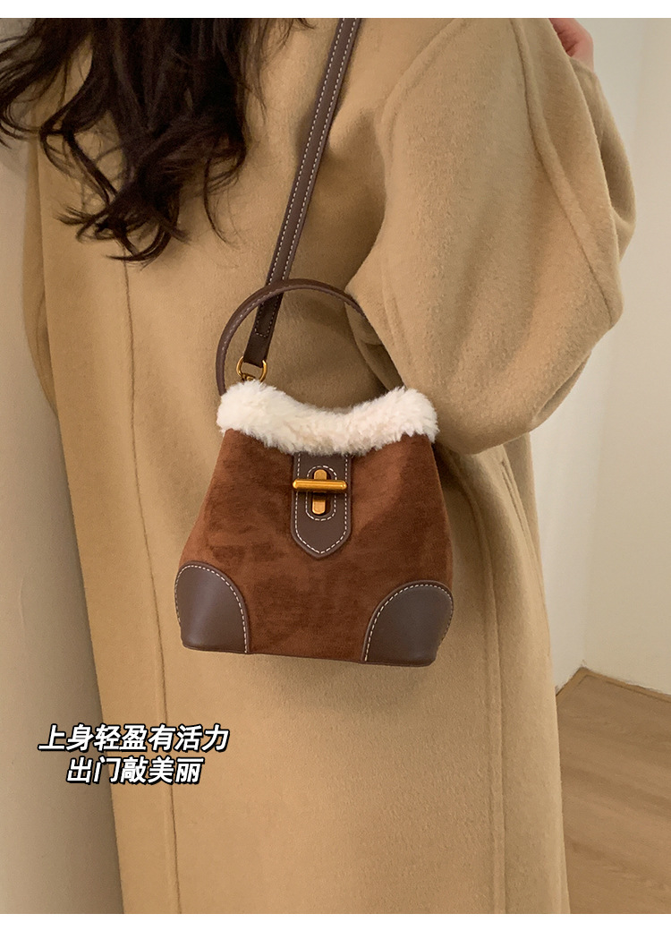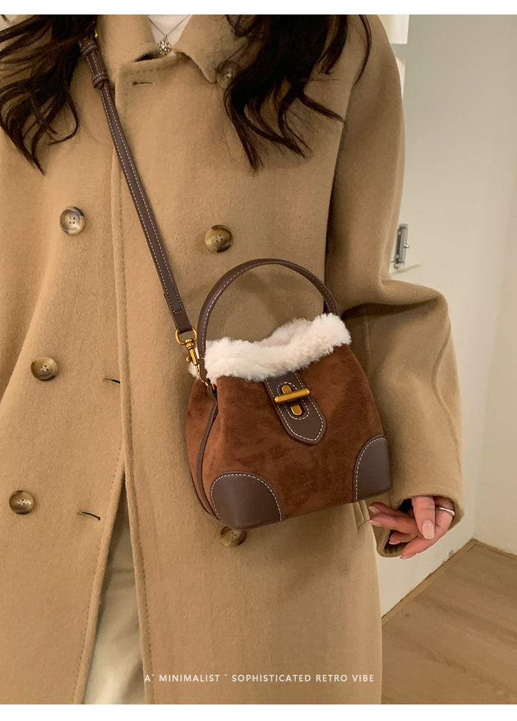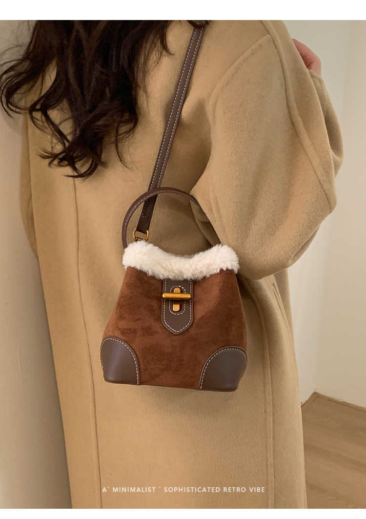 TJ2234# 2025秋冬新款时尚毛毛迷你手提水桶包高级感美拉德绒面复古斜挎包