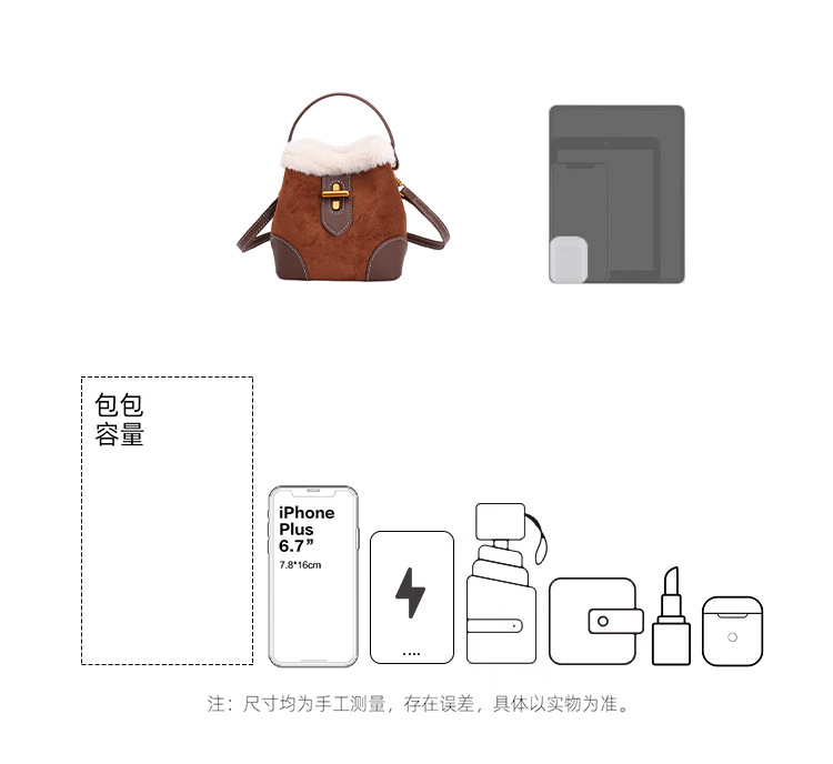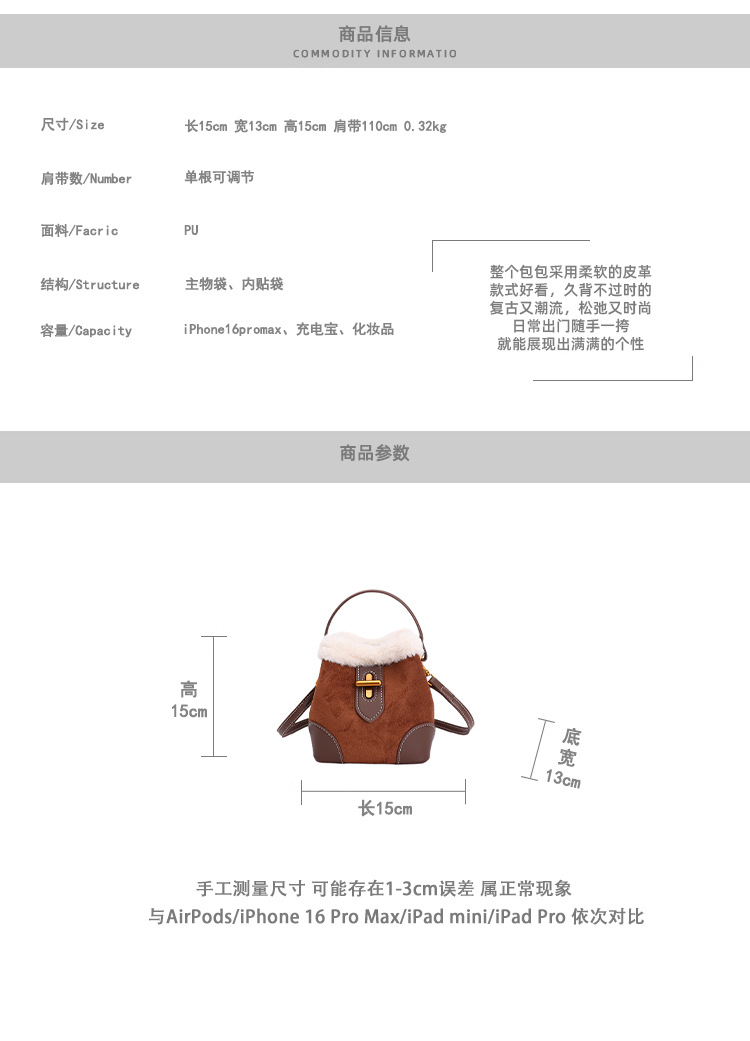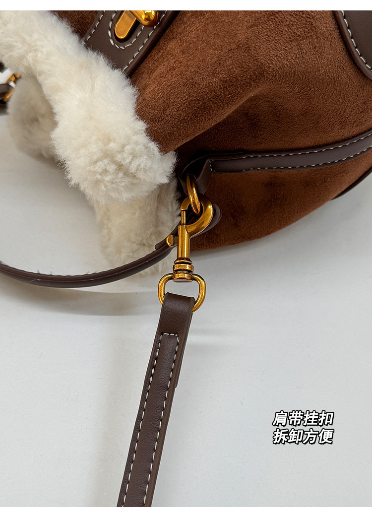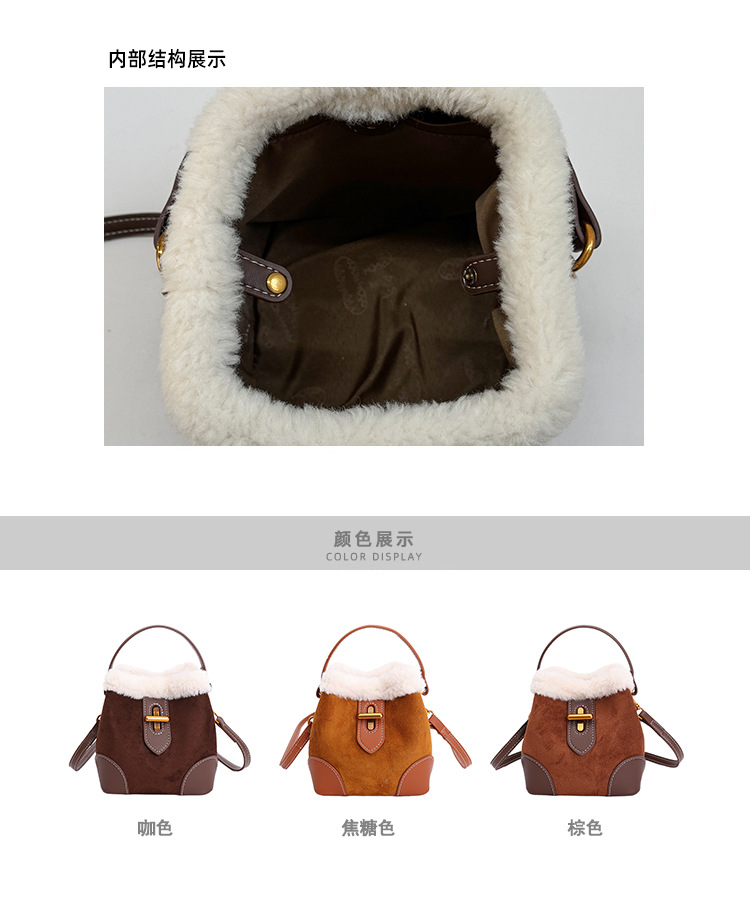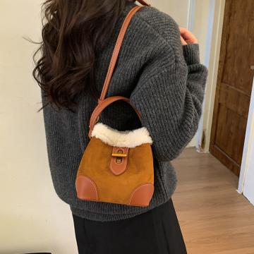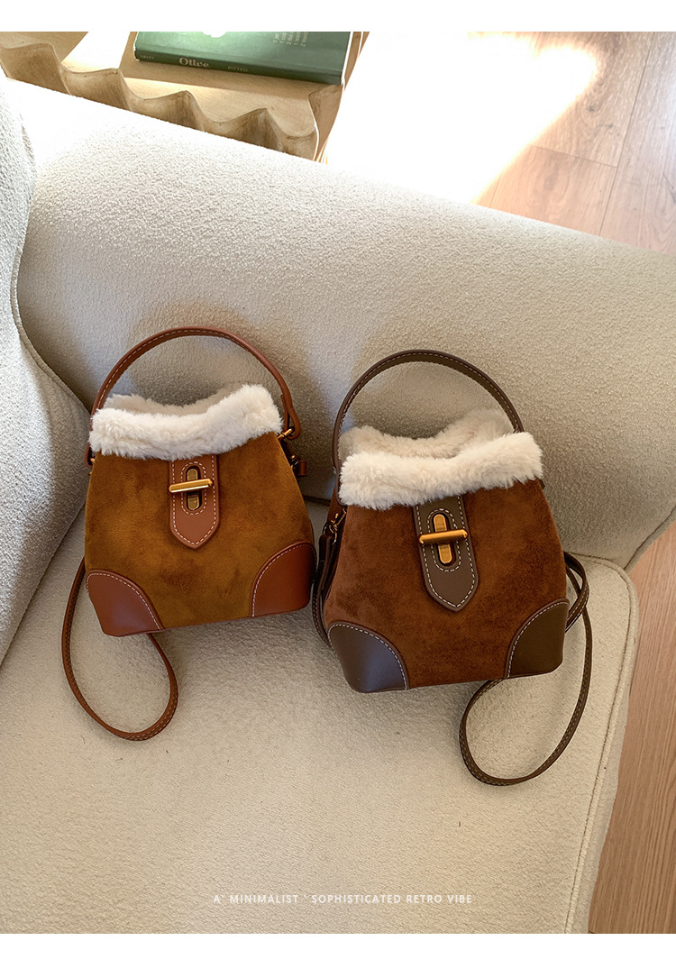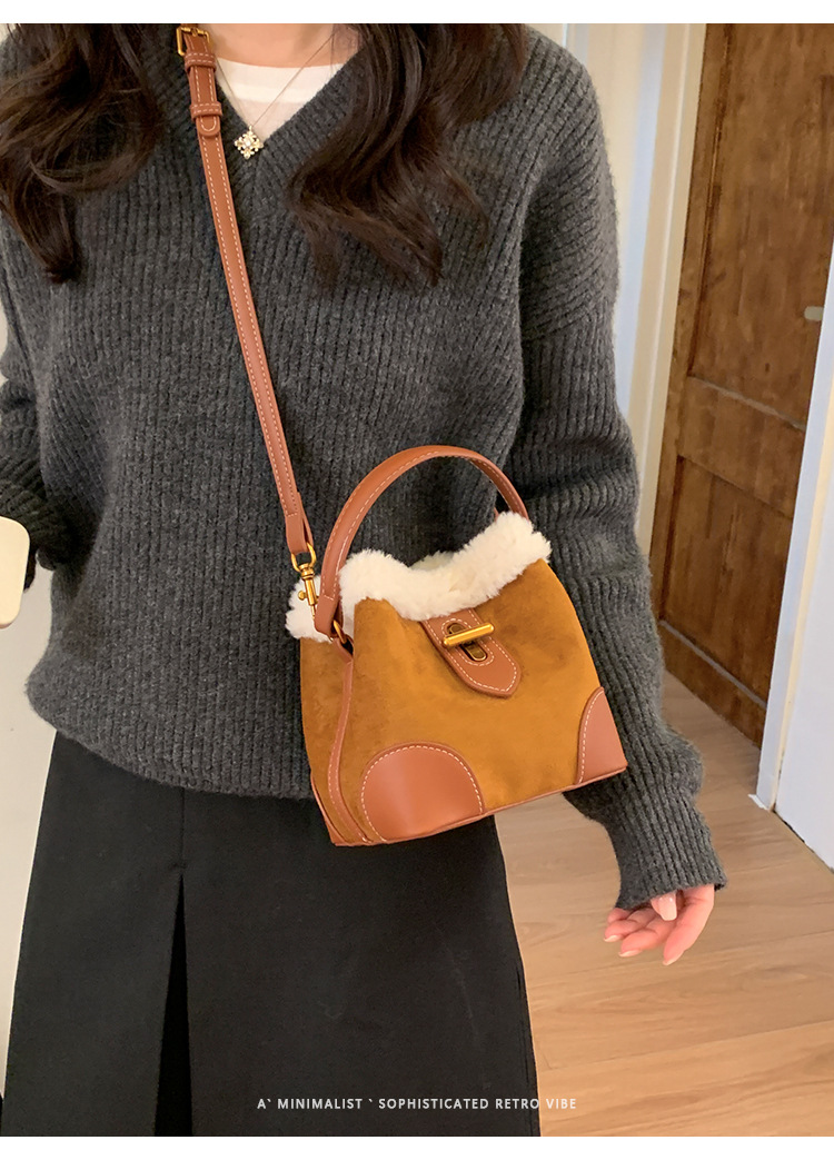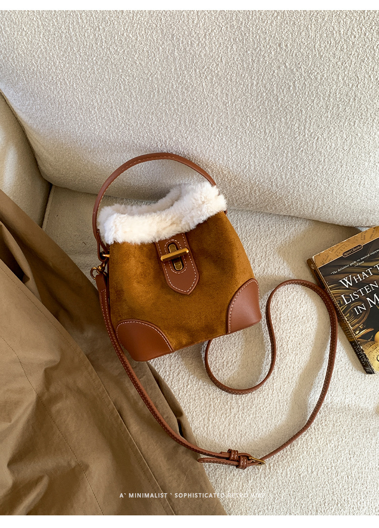 TJ2234# 2025秋冬新款时尚毛毛迷你手提水桶包高级感美拉德绒面复古斜挎包