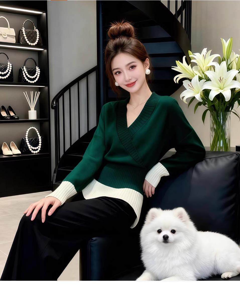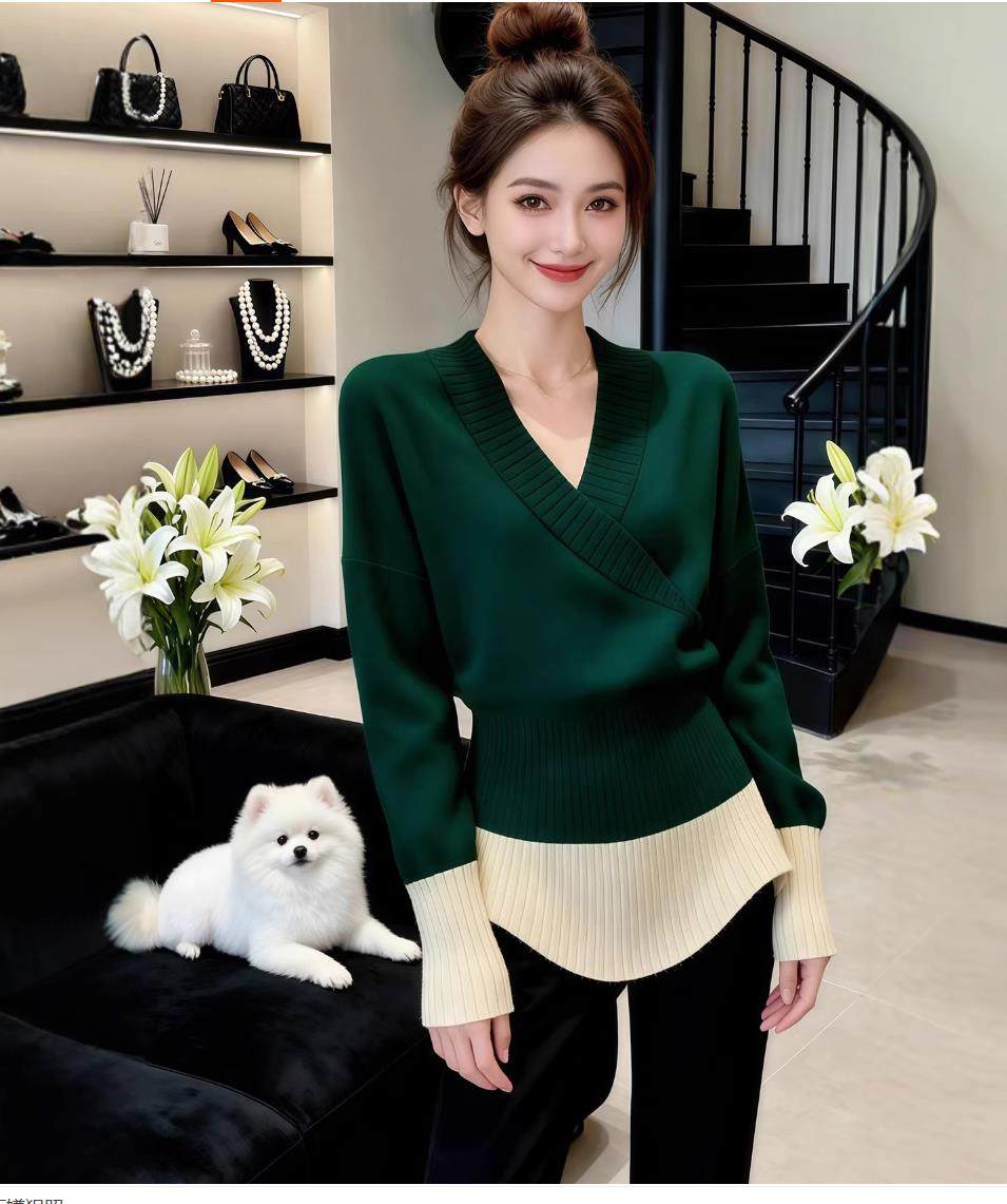 FA53152# 法式撞色V领长袖打底针织衫女秋冬内搭可外穿高级感收腰显瘦上衣 服裝批發女裝批發服飾貨源