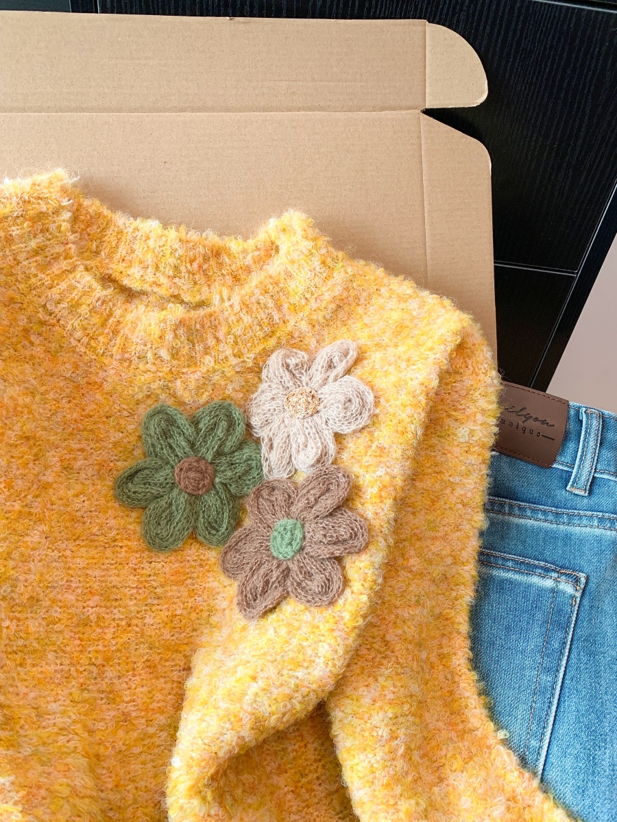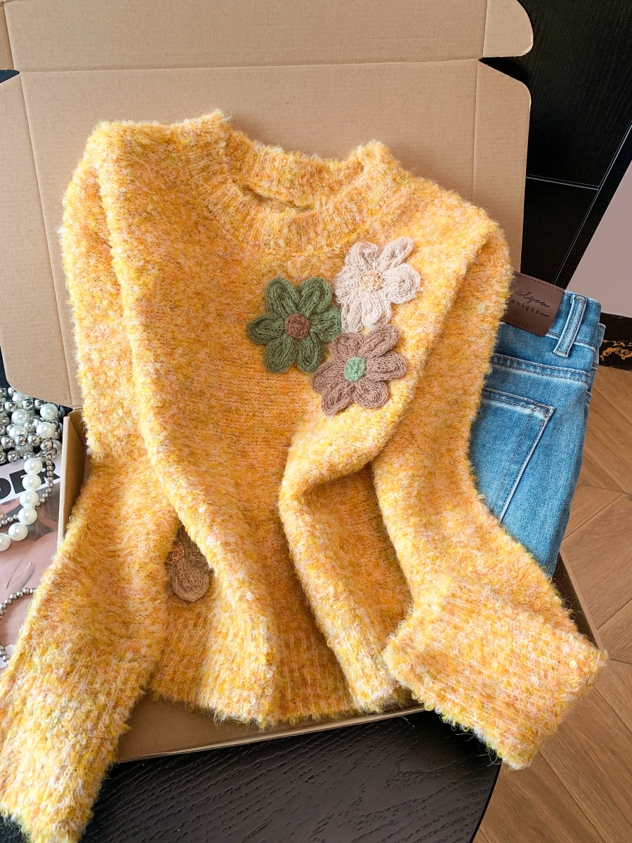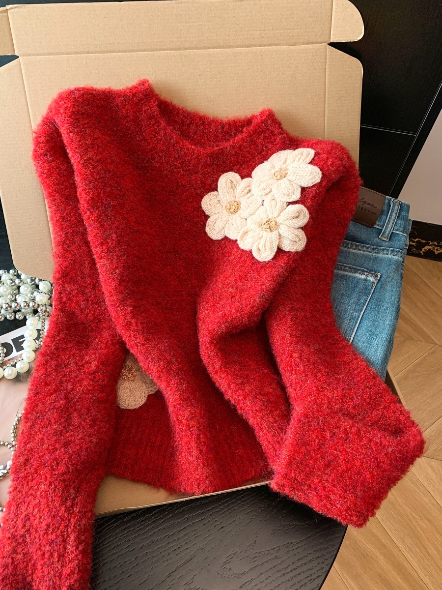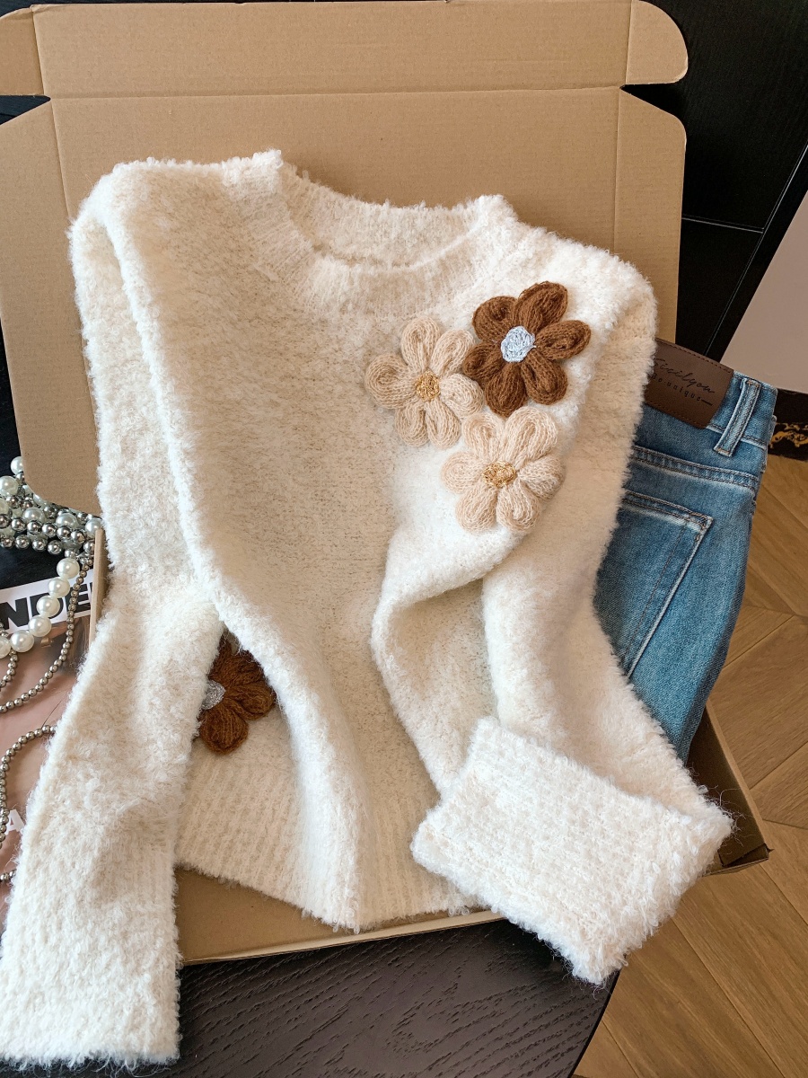 FA53189# 韩系立体花朵气质圆领毛衣女秋冬慵懒风宽松针织衫糖果色短款上衣 服裝批發女裝批發服飾貨源