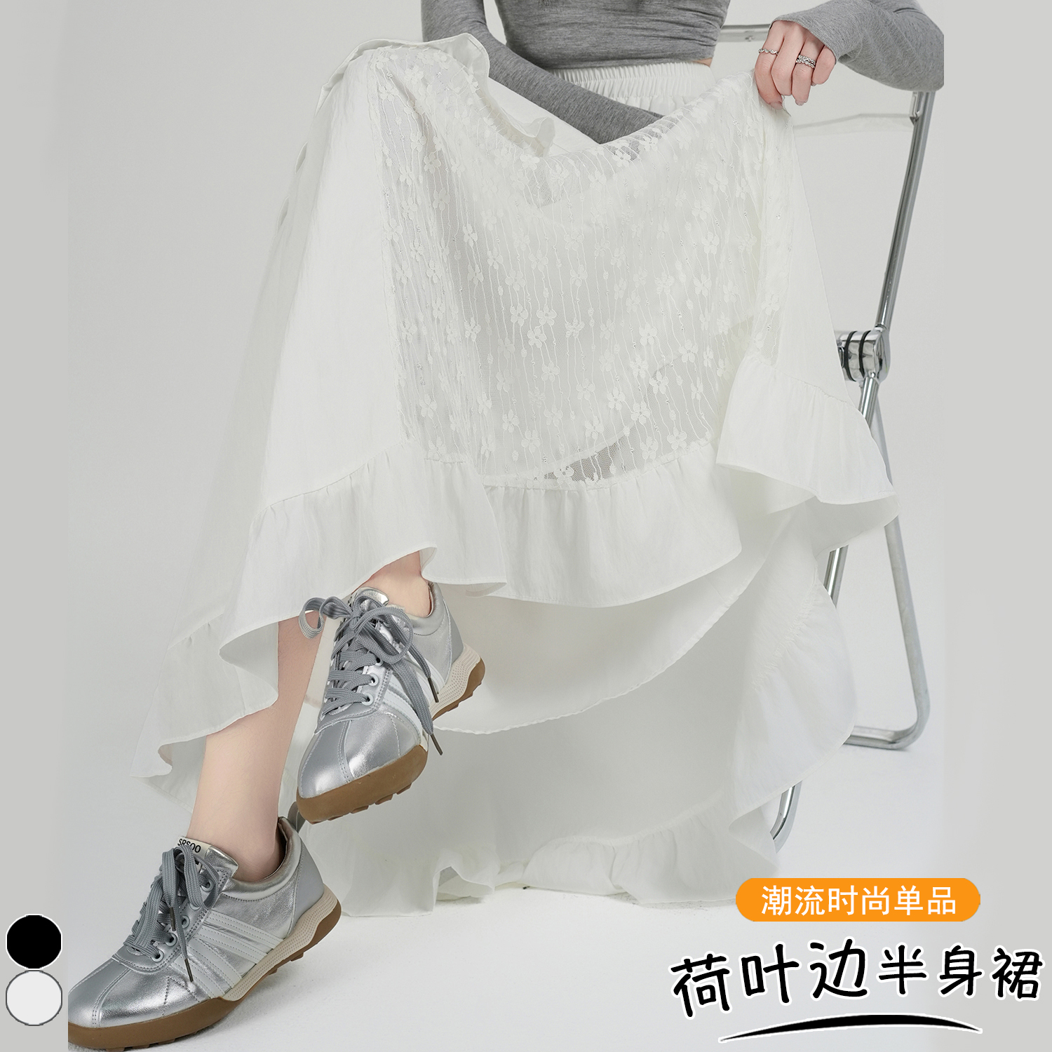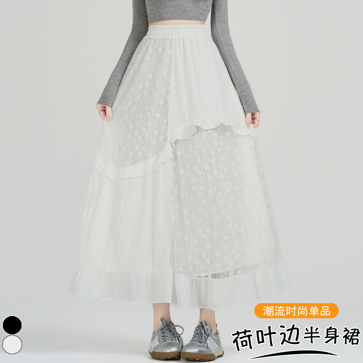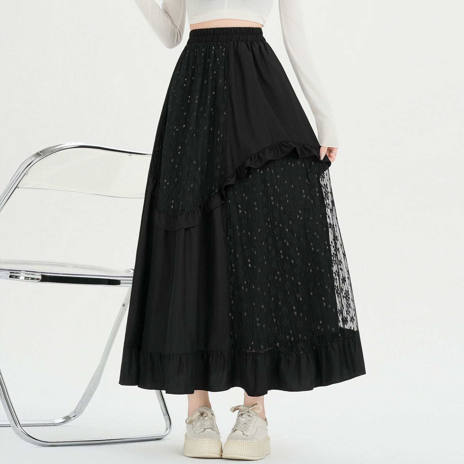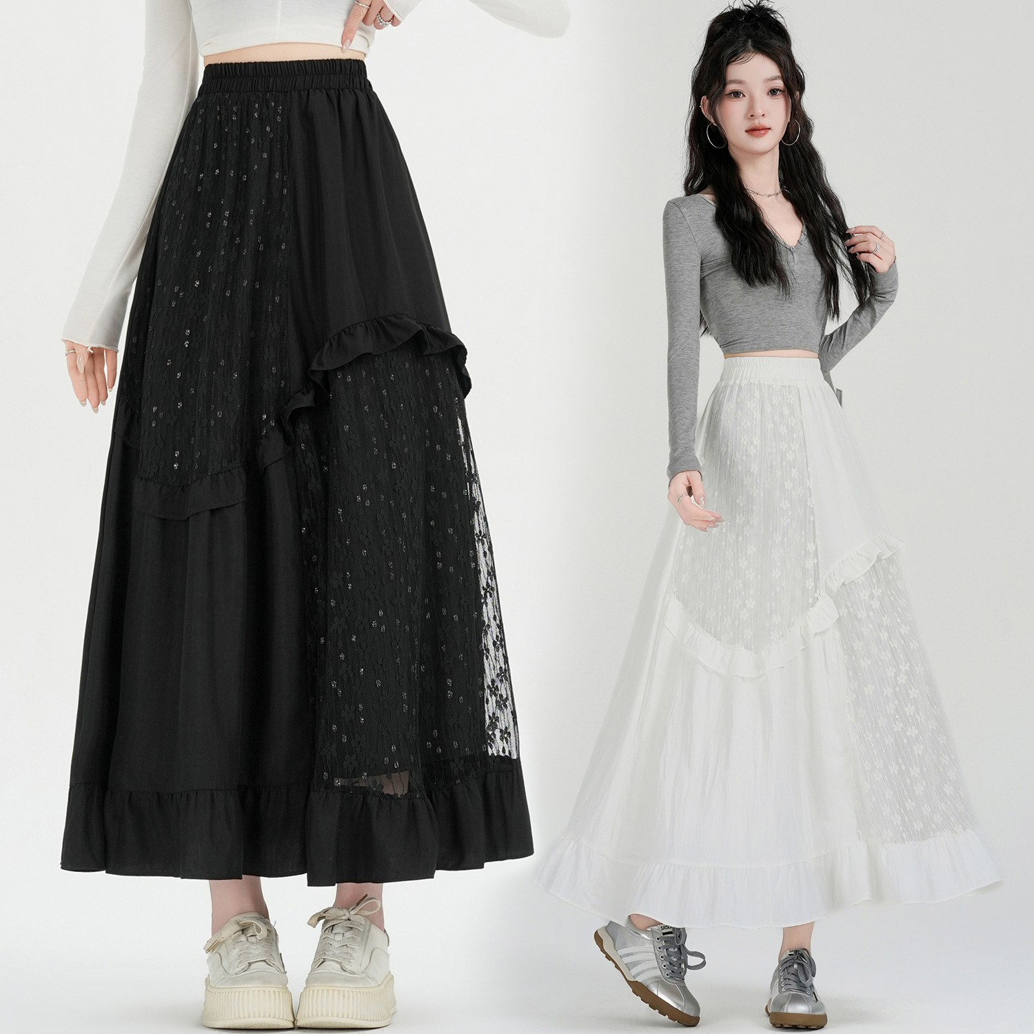 FA53485# 设计感法式拼接蕾丝花边伞裙早春新款减龄A字裙长裙