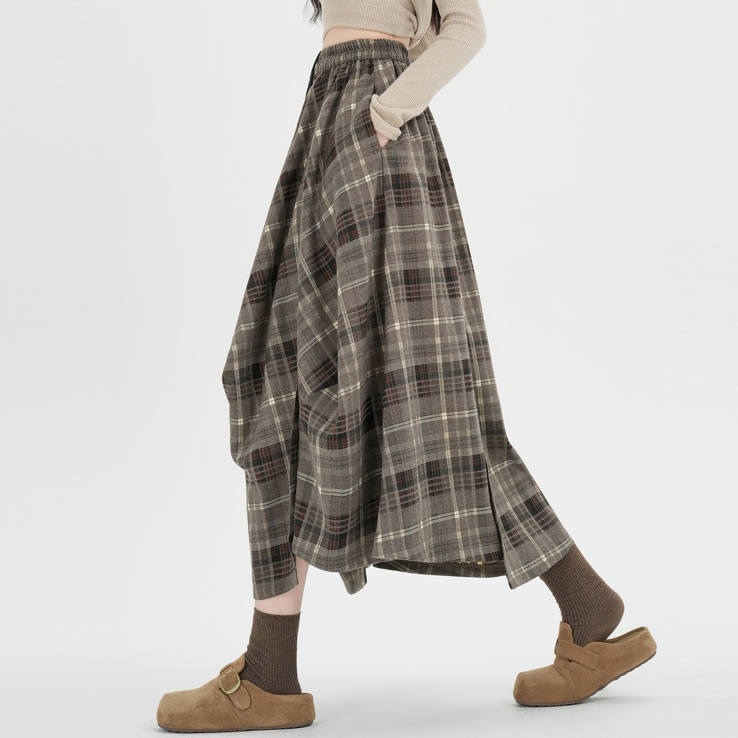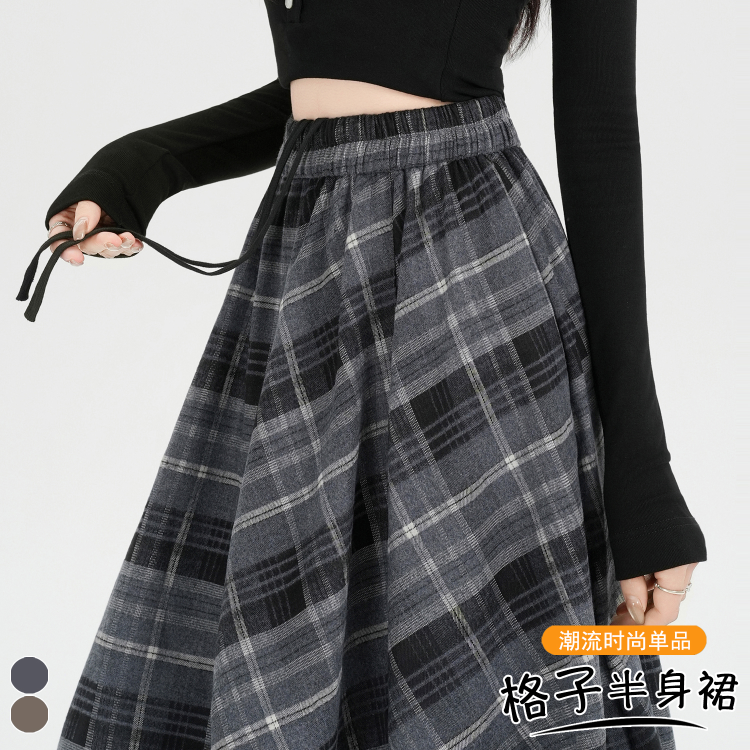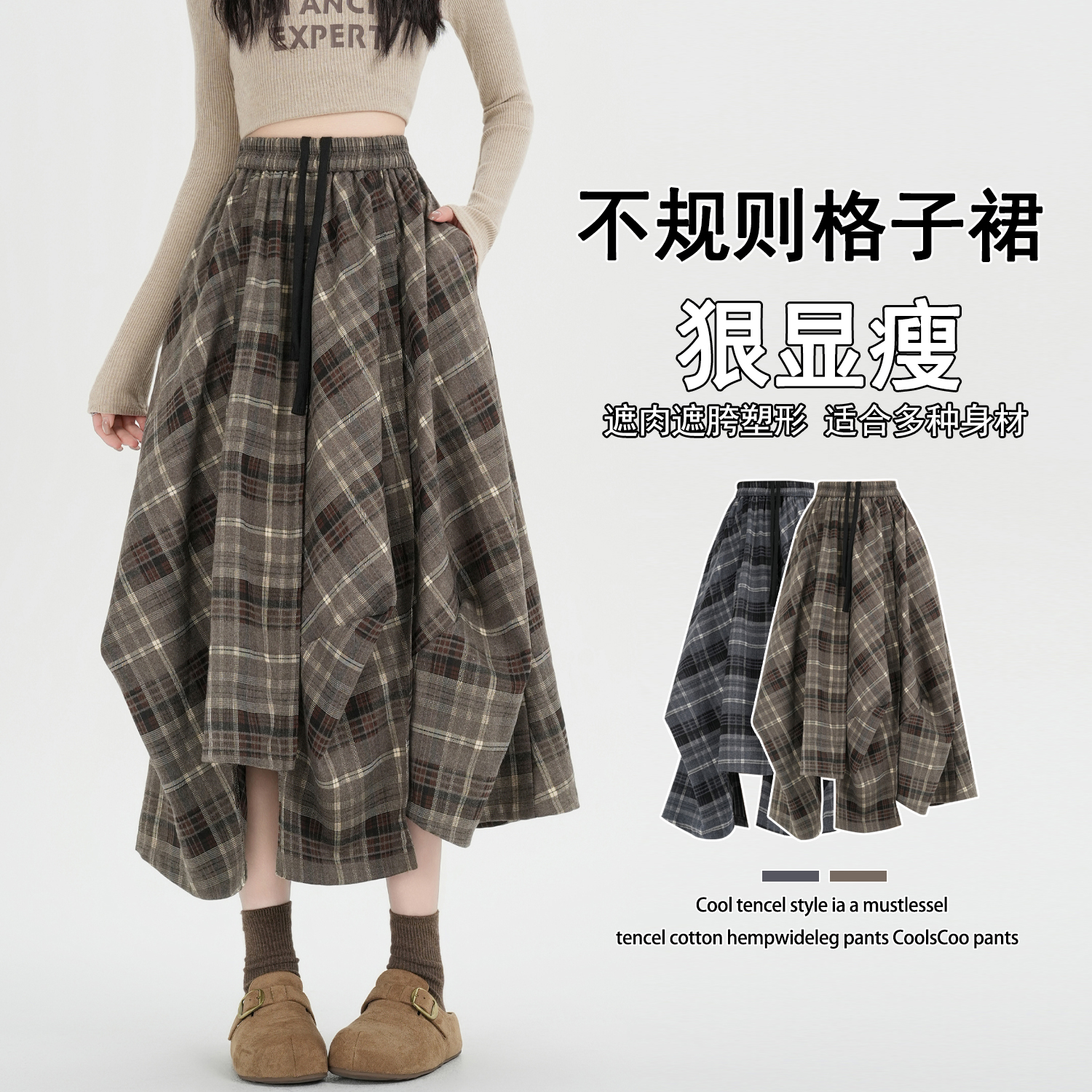 FA53490# 早春新款设计感不规则格子半身长裙复古松紧腰抽绳大摆伞裙
