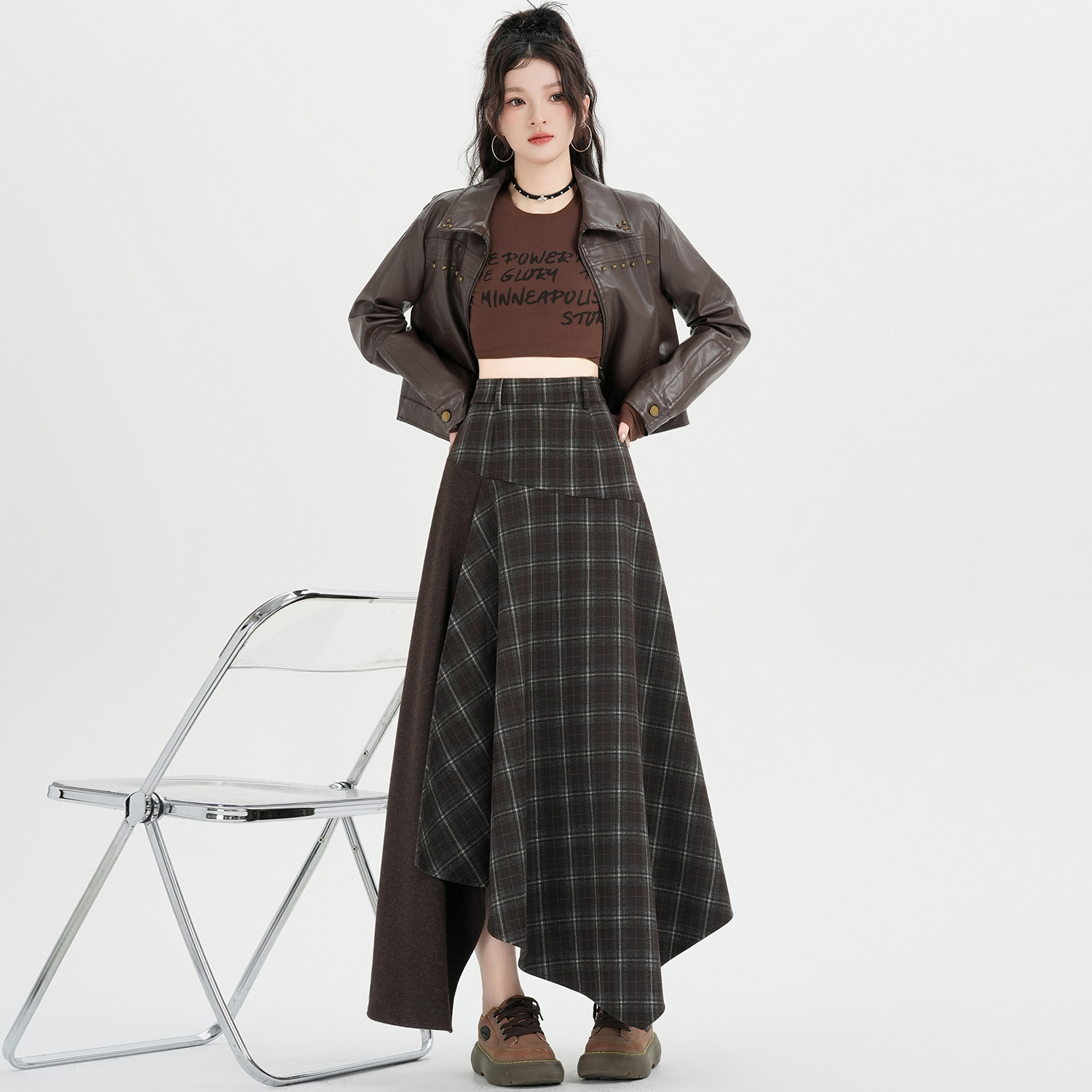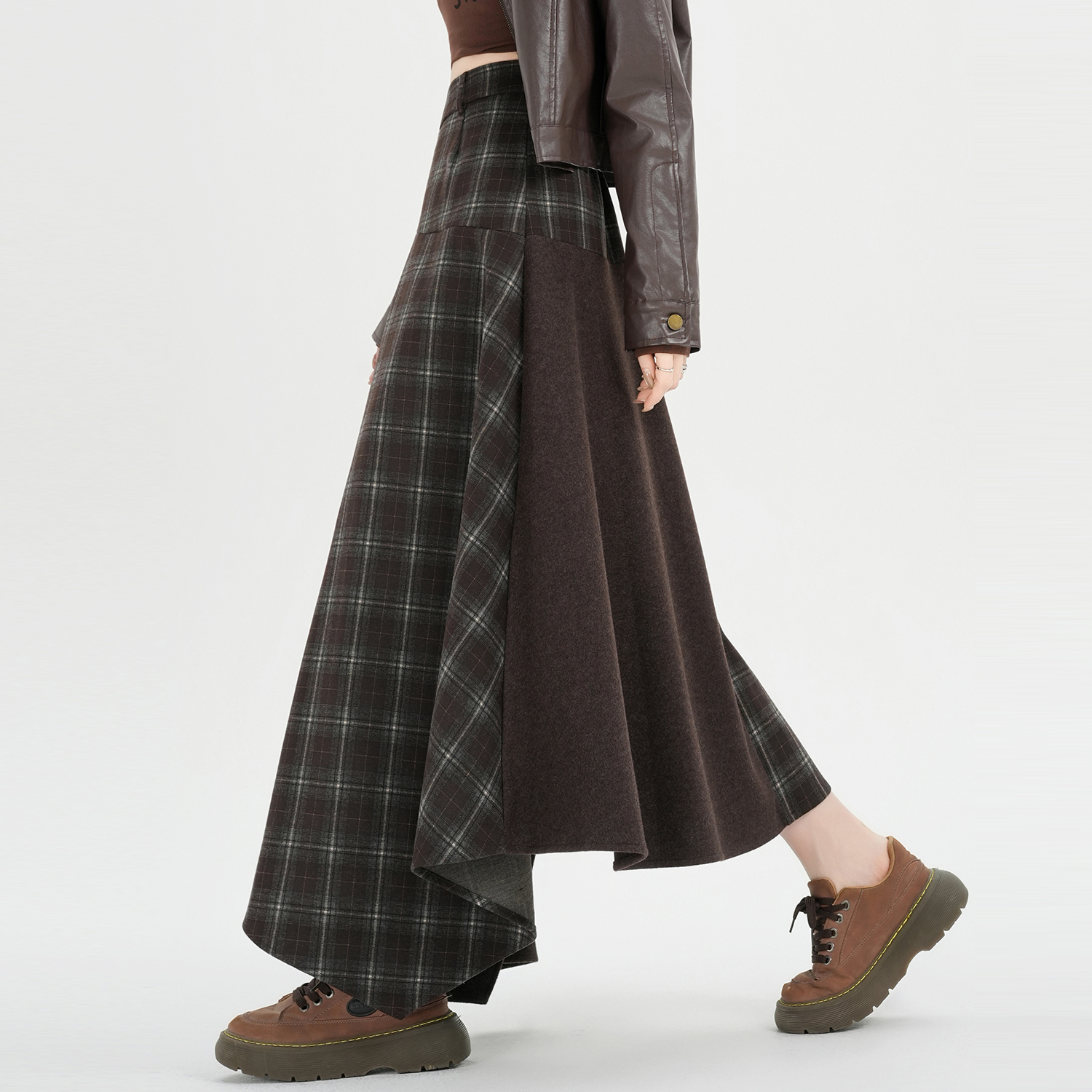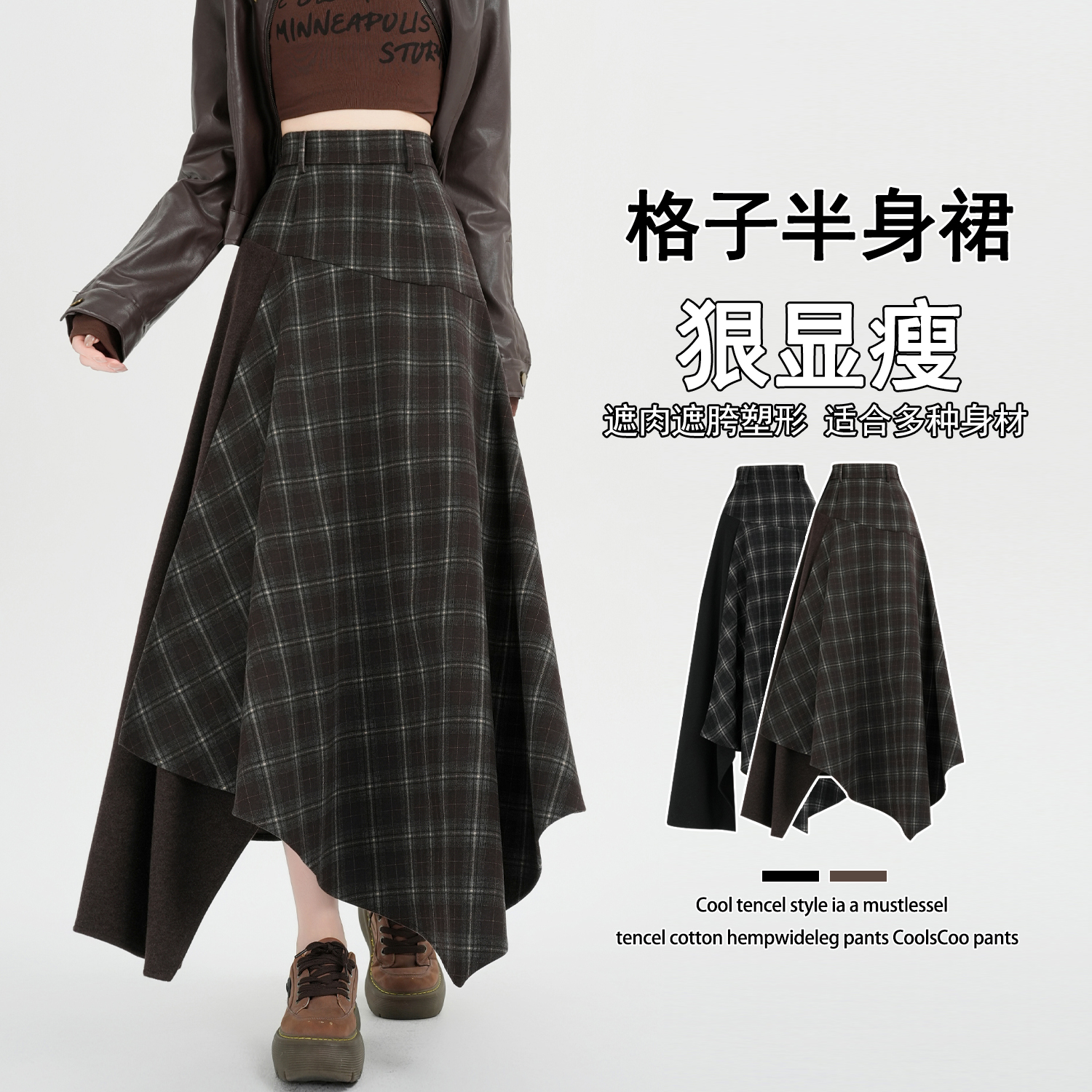 FA53495# 设计感不规则格子拼接半身裙秋冬高腰复古假两件A字长裙