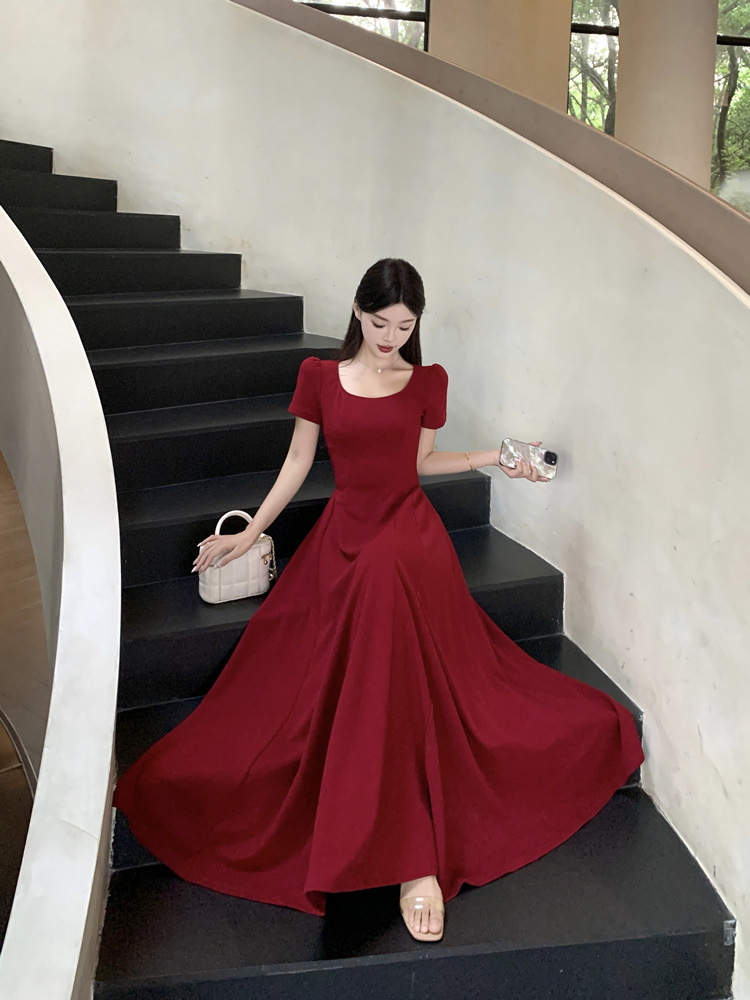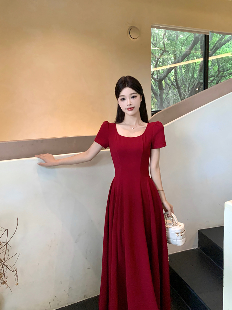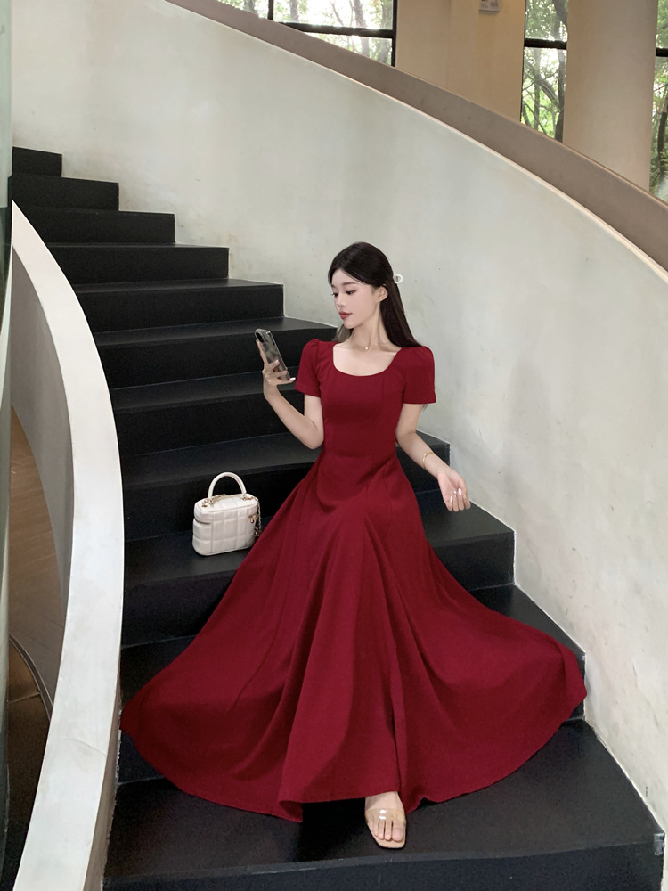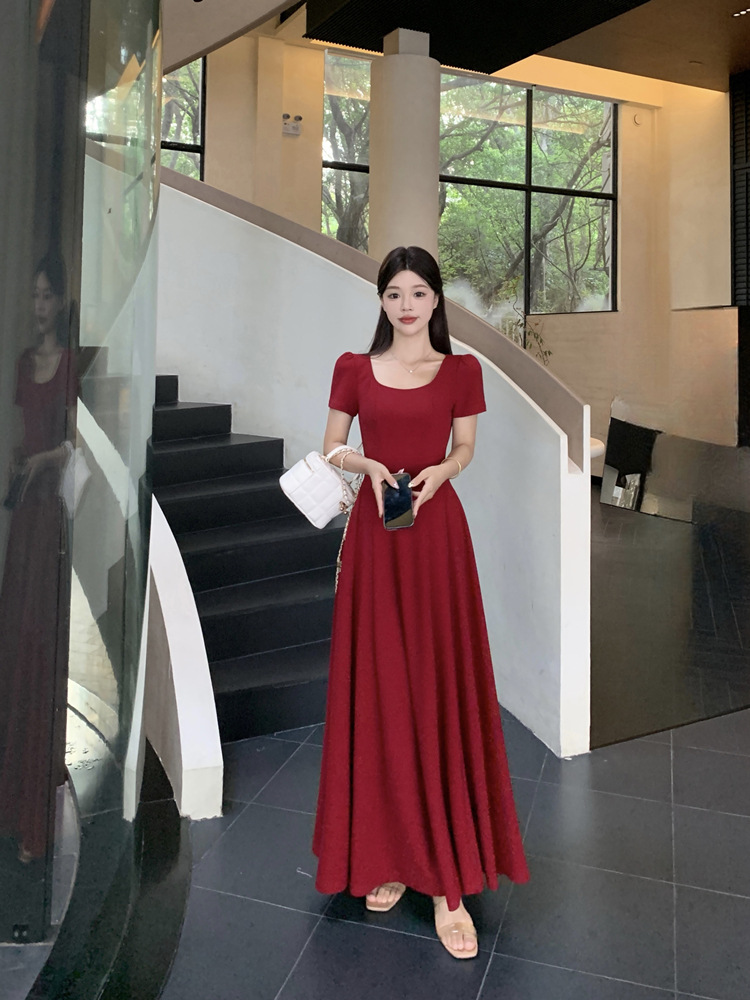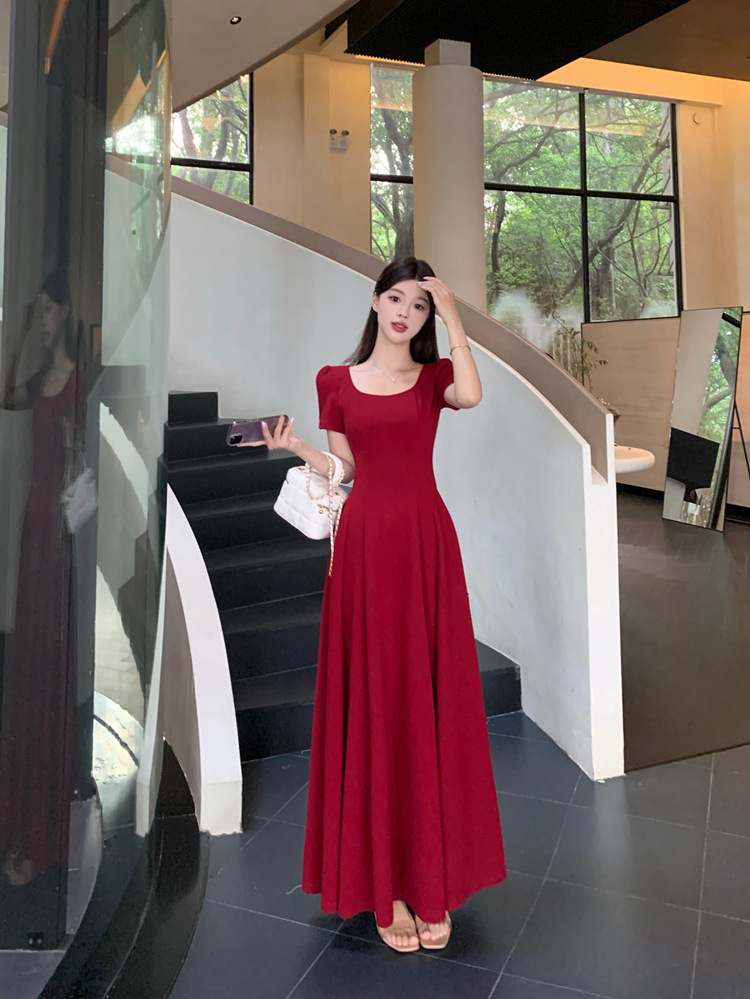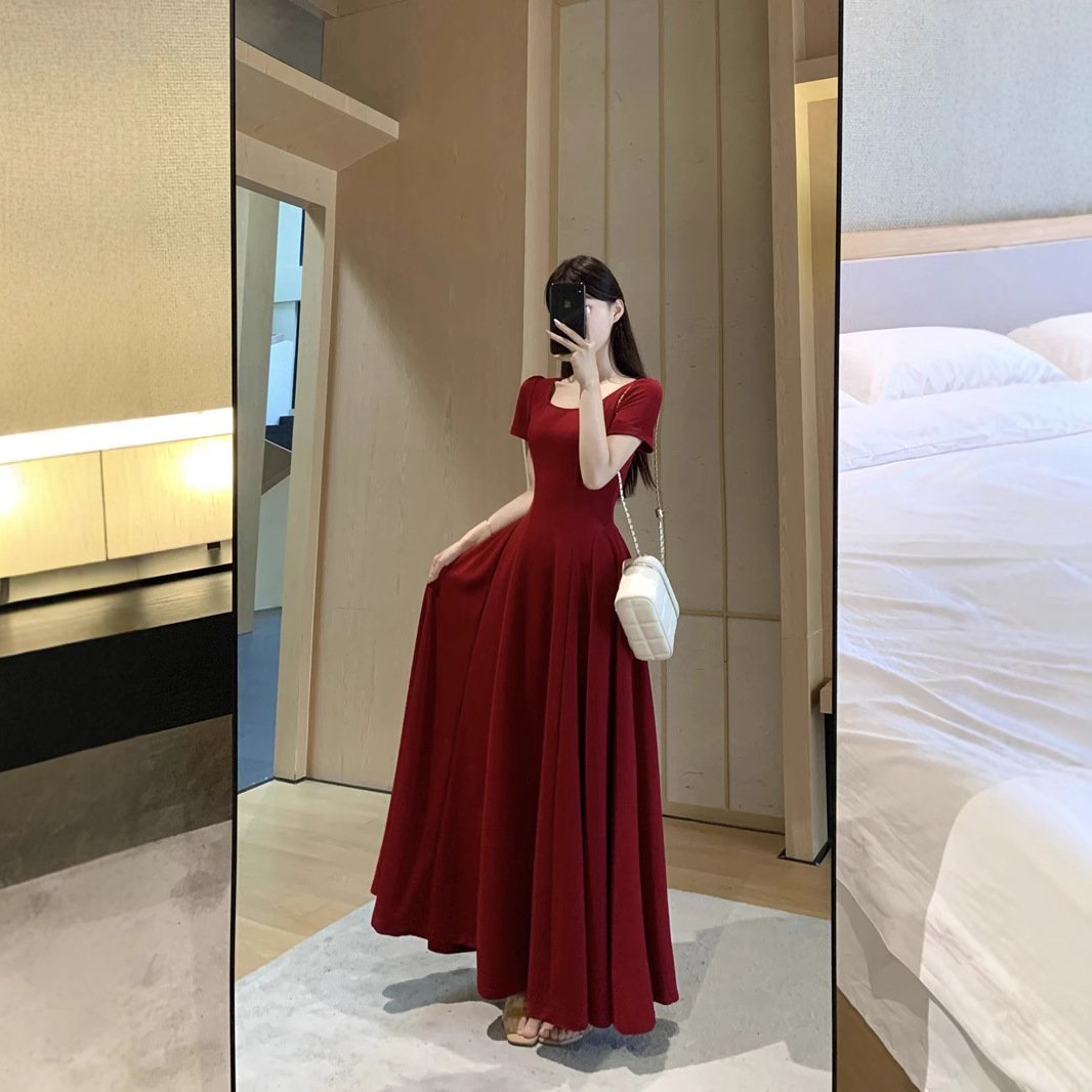 LN76422# 红色方领短袖连衣裙女2025夏优雅气质法式收腰A字大摆裙高腰长裙