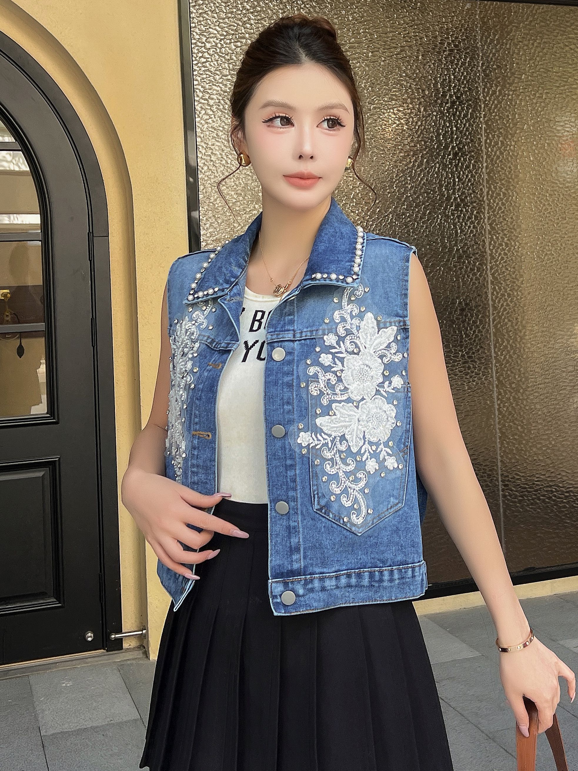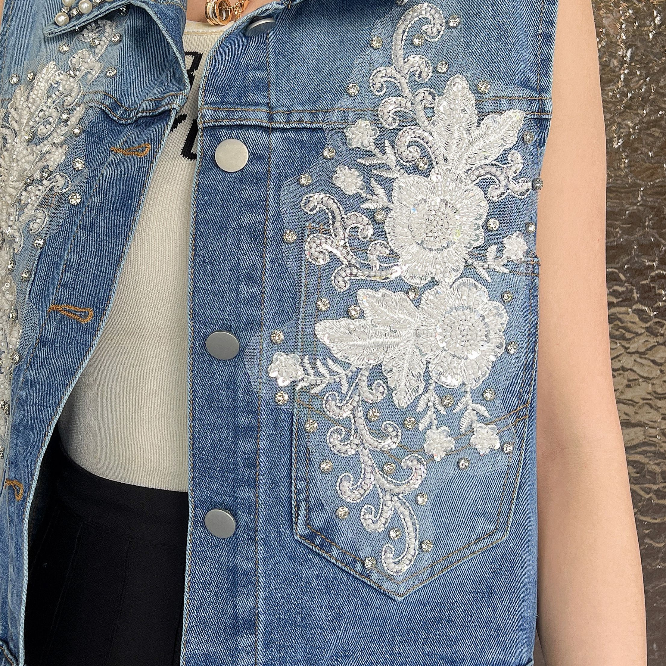 FA53781# 春夏爆款钉珠重工流苏牛仔短外套时尚绣花工艺肩花 服裝批發女裝批發服飾貨源