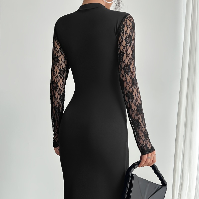 FA54089# 欧美跨境外贸春季新款女士纯色撞色蕾丝开衩性感紧身连衣裙 服裝批發女裝批發服飾貨源