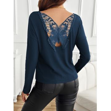 FA54100# 欧美跨境外贸女式纯色后背拼接蝴蝶花罗纹长袖T恤上衣女装 服裝批發女裝批發服飾貨源