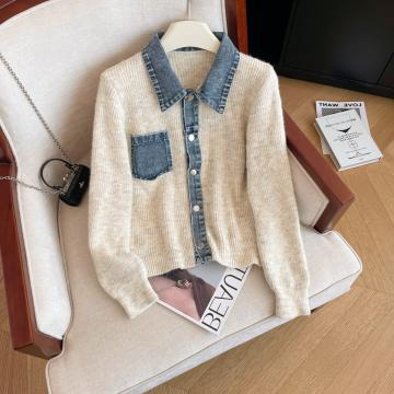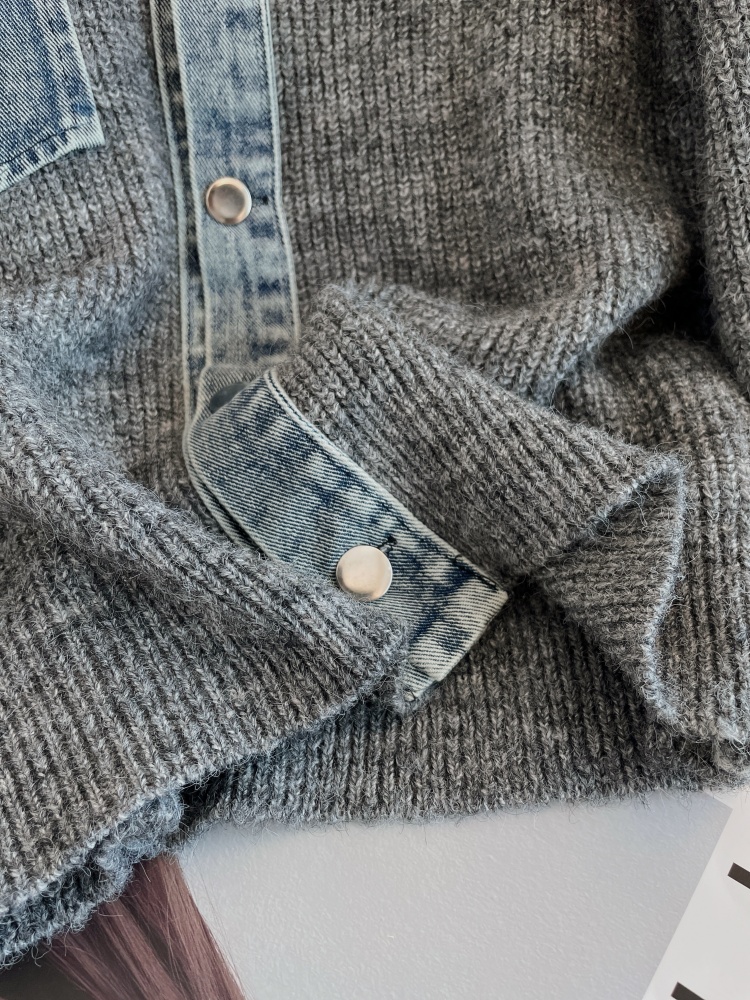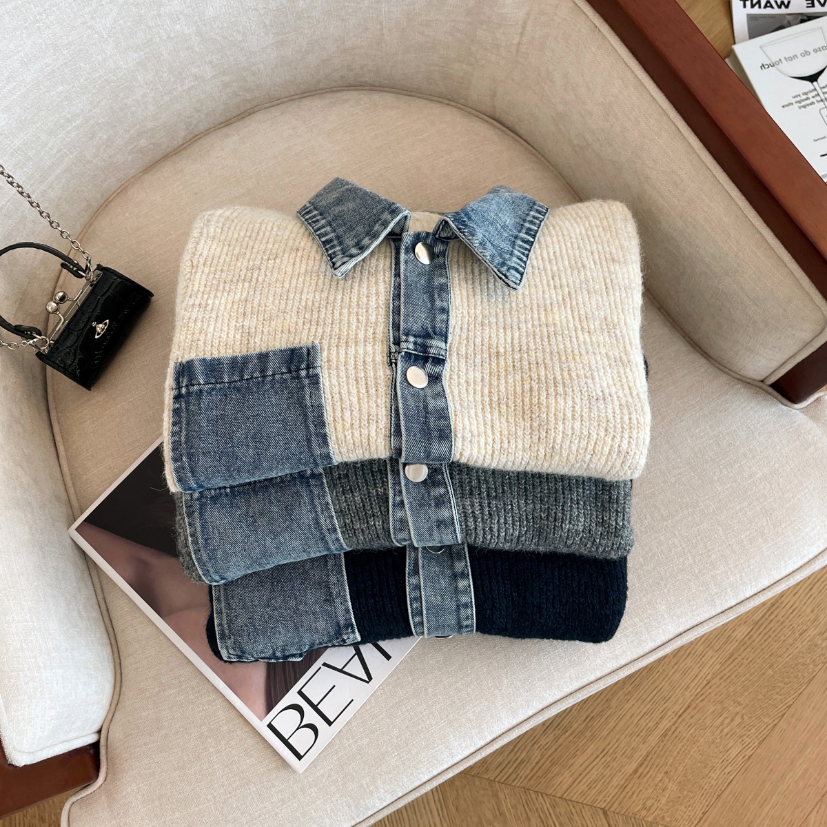 FA54107# 冬季新款设计感牛仔拼接毛衣开衫女洋气小众外穿显瘦假两件 服裝批發女裝批發服飾貨源