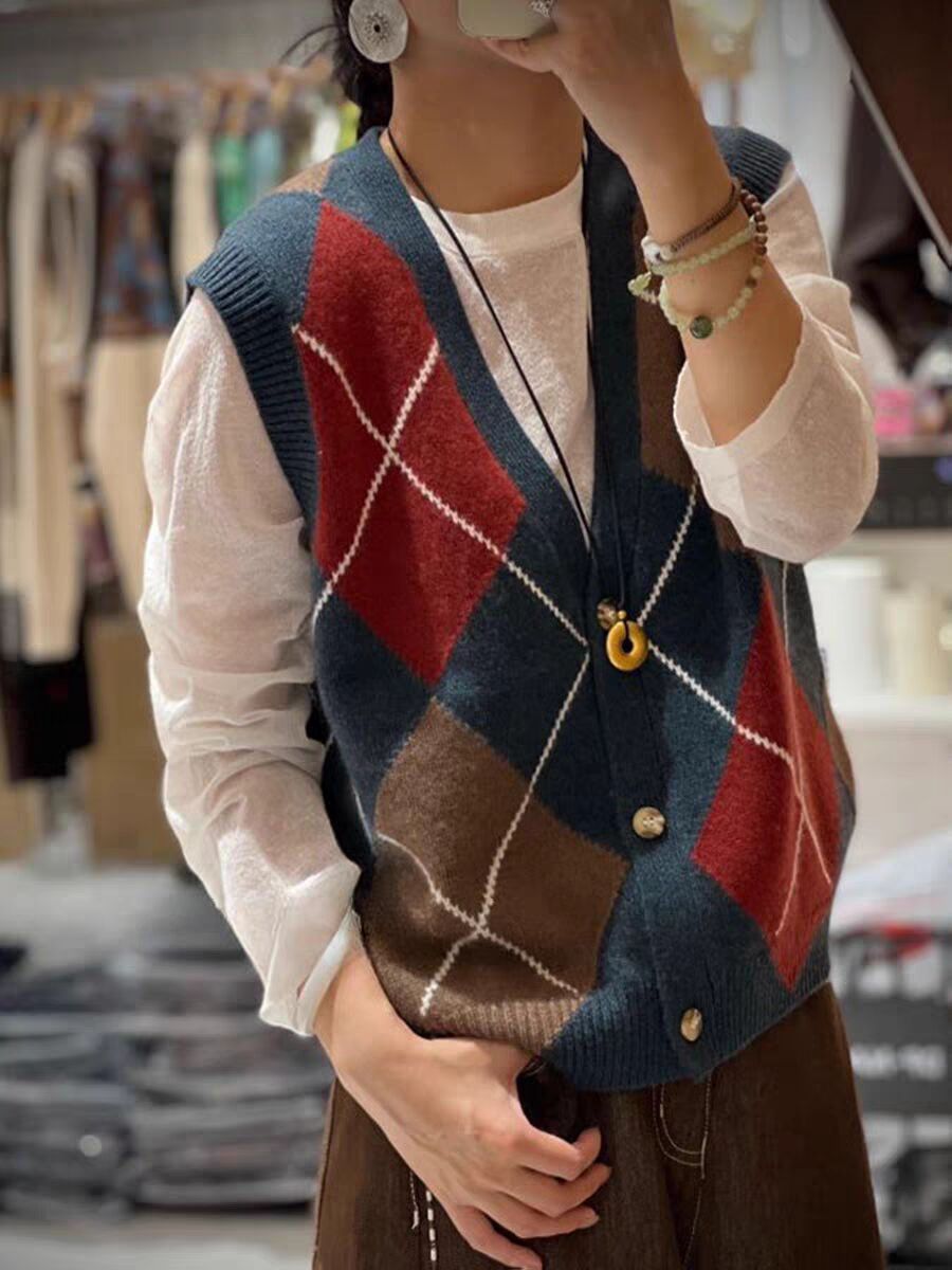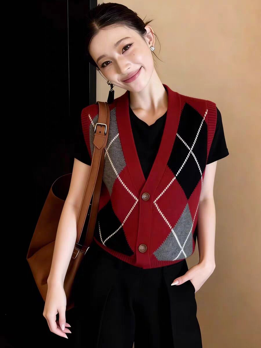 FA54121# 高级感菱形V领无袖坎肩百搭洋气舒适马甲针织衫设计感韩系复古女 服裝批發女裝批發服飾貨源