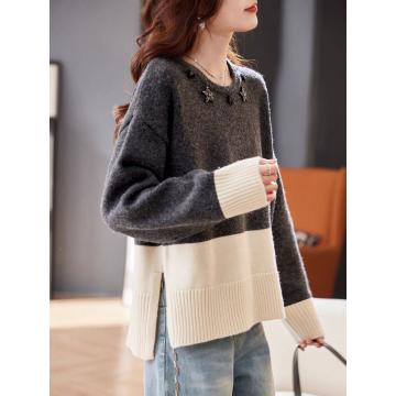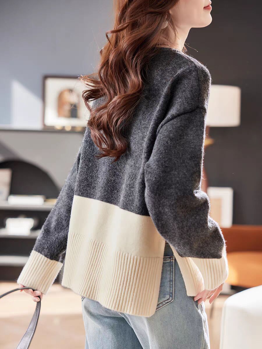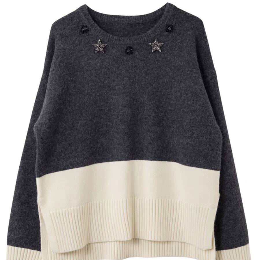 FA54123# 圆领手工钉钻拼接加厚毛衣秋冬洋气撞色宽松慵懒百搭针织上衣 服裝批發女裝批發服飾貨源