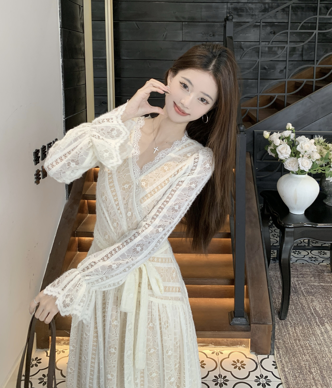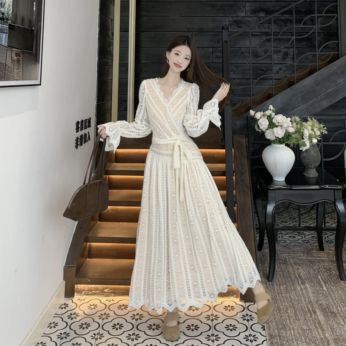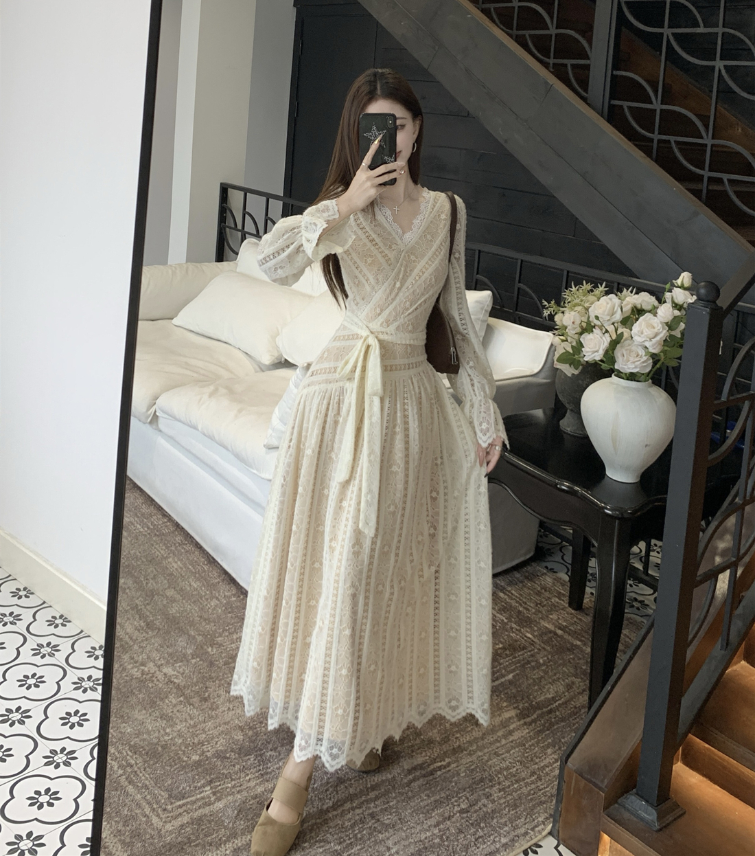 FA54125# 春季胖MM法式复古蕾丝长袖收腰绑带连衣裙女显瘦气质a字长裙 服裝批發女裝批發服飾貨源