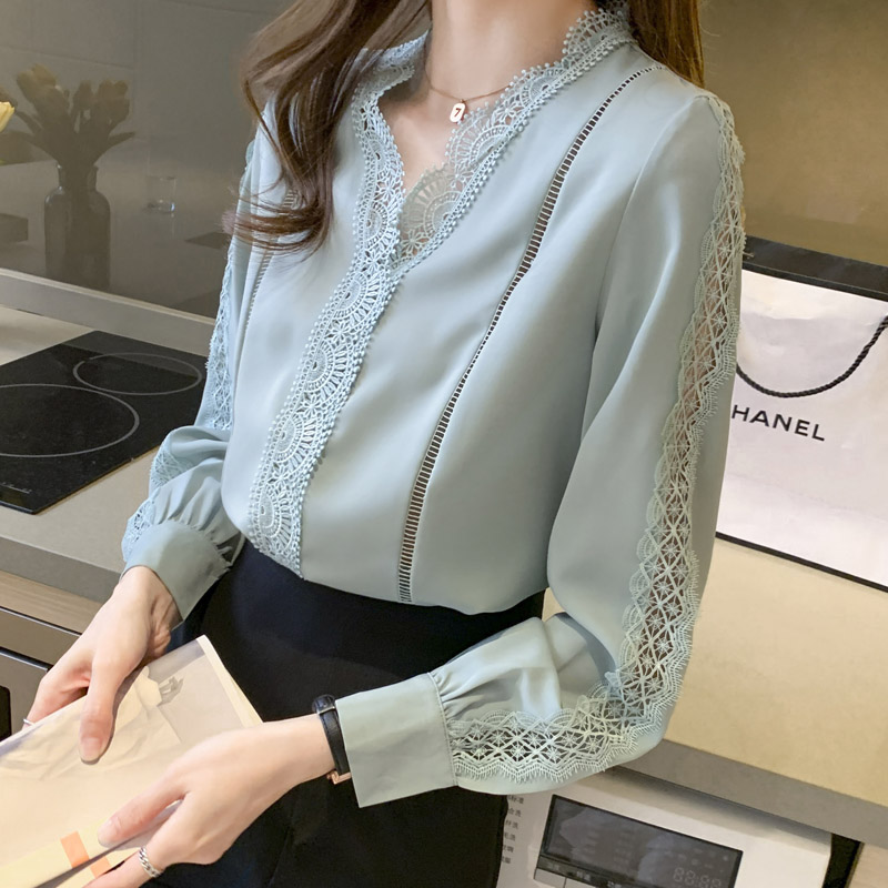 FA54291# 洋气春秋季新女装纯色休闲花边雪纺衫显瘦长袖套头衬衫打底衫 服裝批發女裝批發服飾貨源