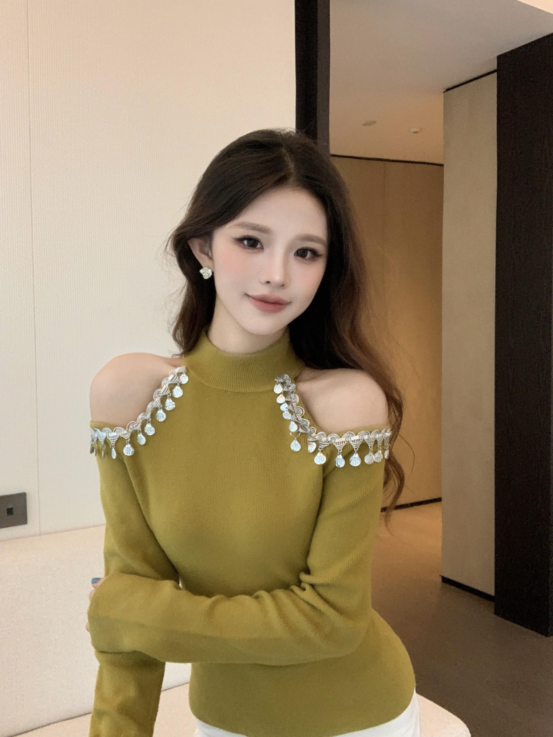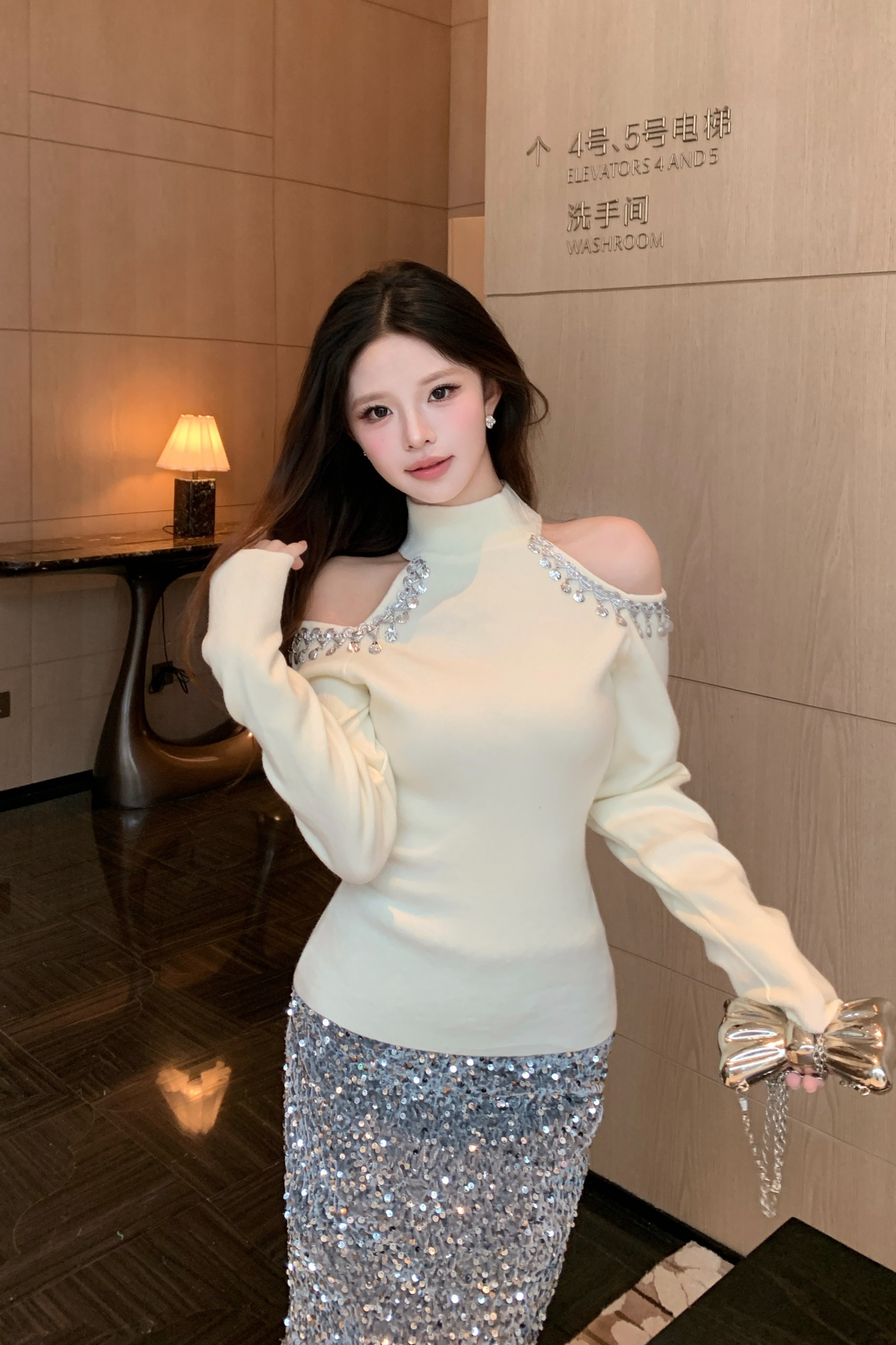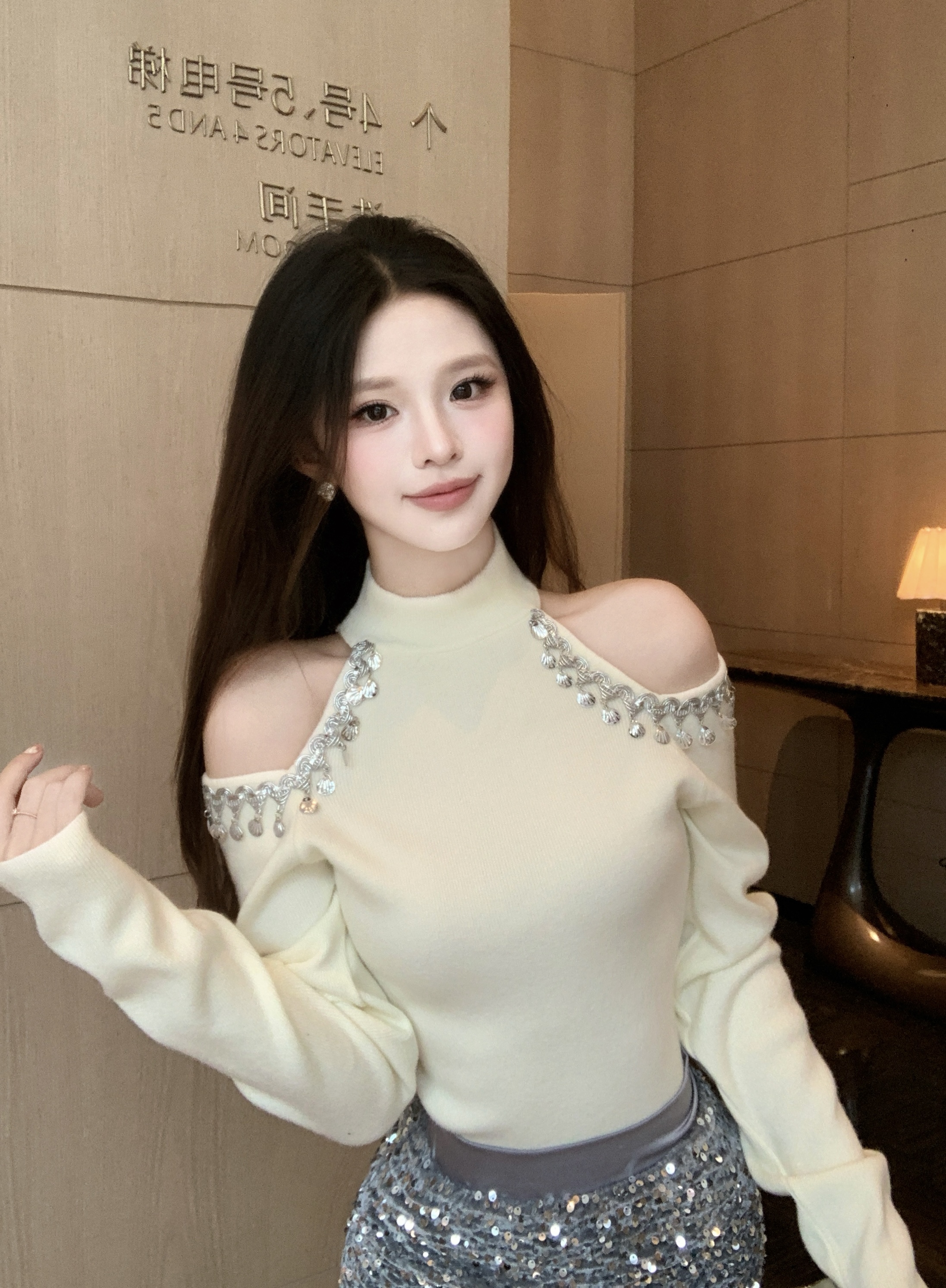 FA54298# 小众设计感春秋季新款重工水钻露肩针织衫女内搭打底衫 服裝批發女裝批發服飾貨源