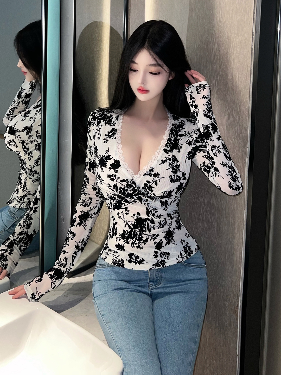 FA54319# 新中式网纱复古印花V领修身T恤女纯欲性感紧身内搭上衣 服裝批發女裝批發服飾貨源