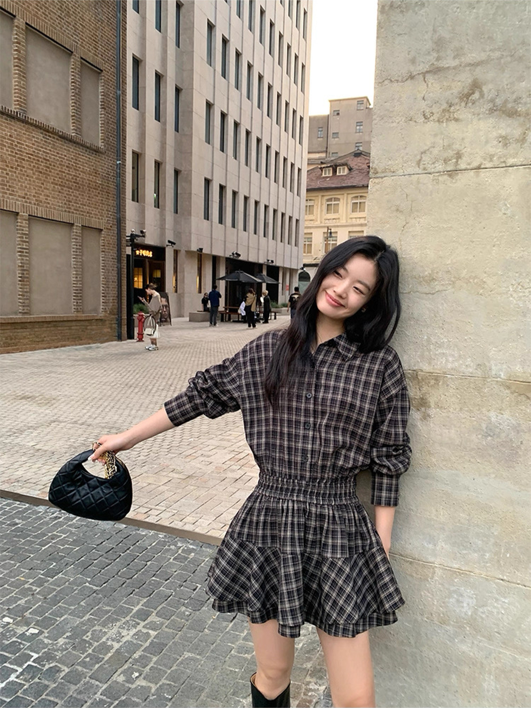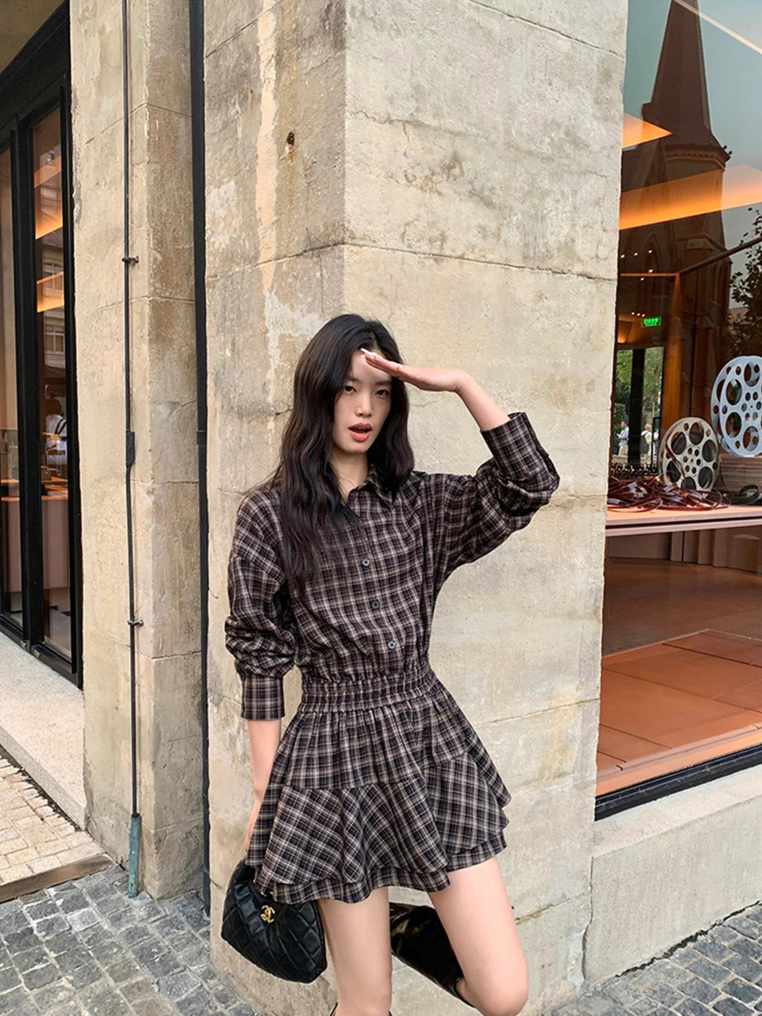 Home > 夜店裙、长袖连衣裙 > FA54321# 辣妹复古格子衬衣裙收腰连衣裙女设计感小众气质显瘦百搭A字短裙 服裝批發女裝批發服飾貨源