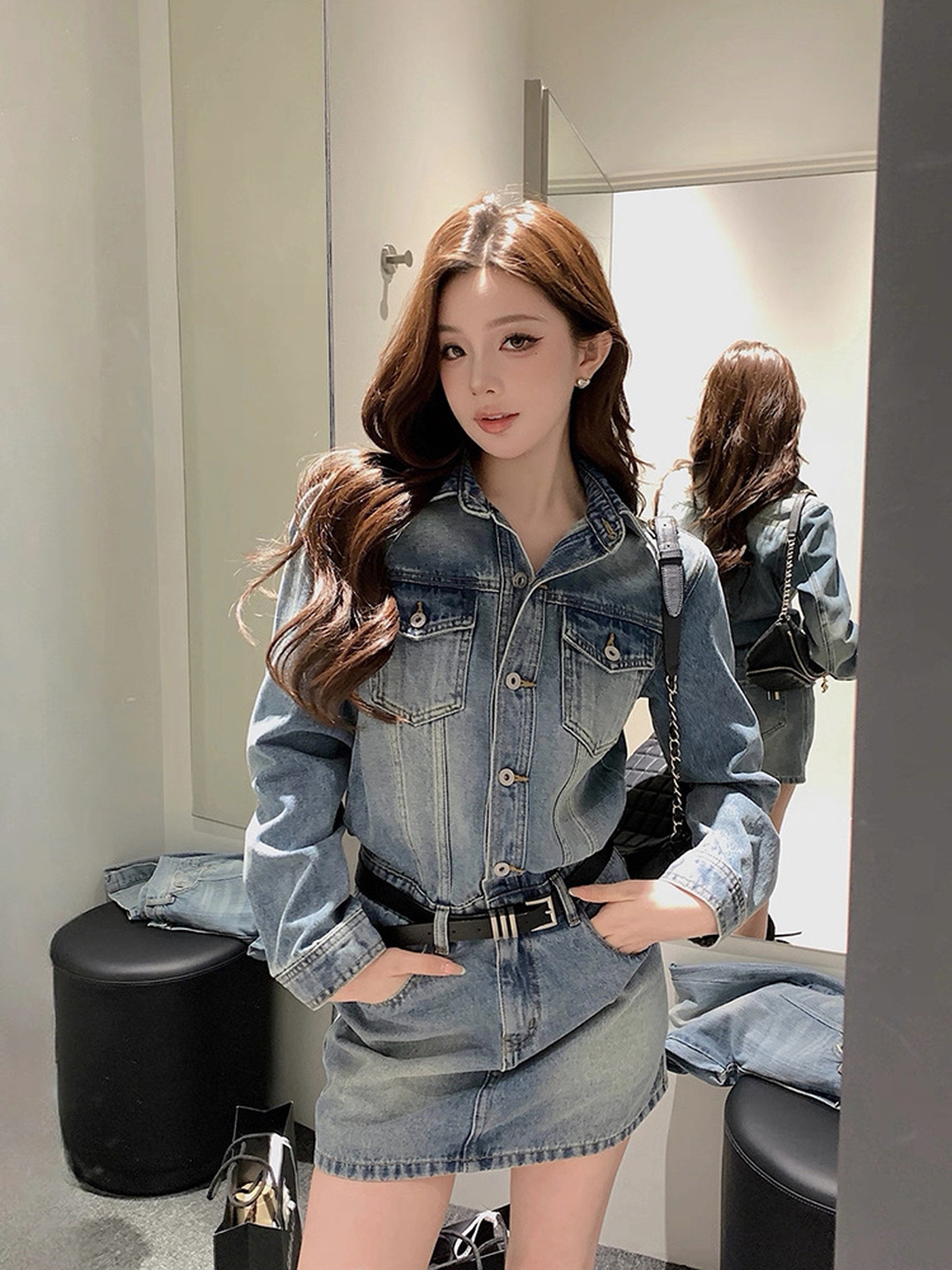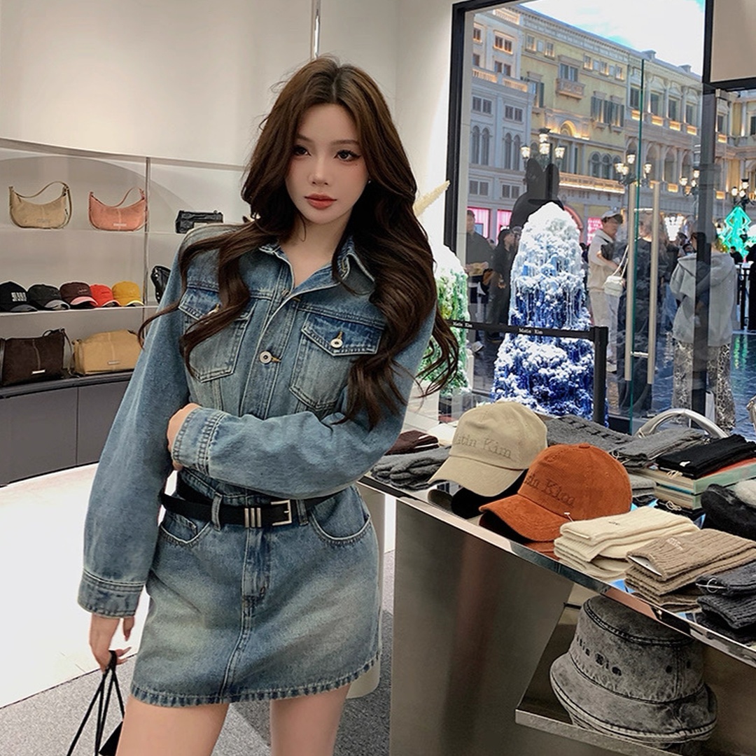 FA54323# 纯欲复古御姐风翻领牛仔连衣裙女辣妹新款长袖显瘦气质包臀短裙子 服裝批發女裝批發服飾貨源