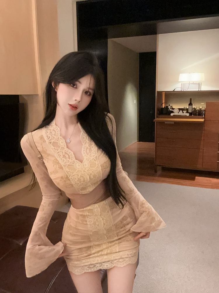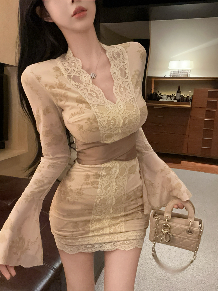 FA54327# 纯欲蕾丝喇叭袖V领绑带连衣裙女收腰显瘦性感辣妹包臀裙 服裝批發女裝批發服飾貨源