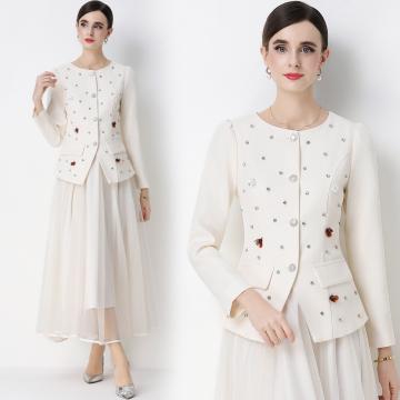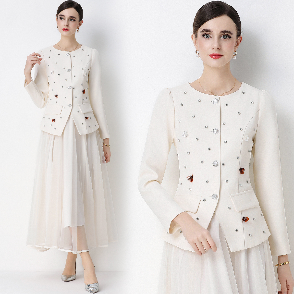 FA54339# 小香风优雅气质镶钻圆领西装外套网纱半身裙套装裙 服裝批發女裝批發服飾貨源