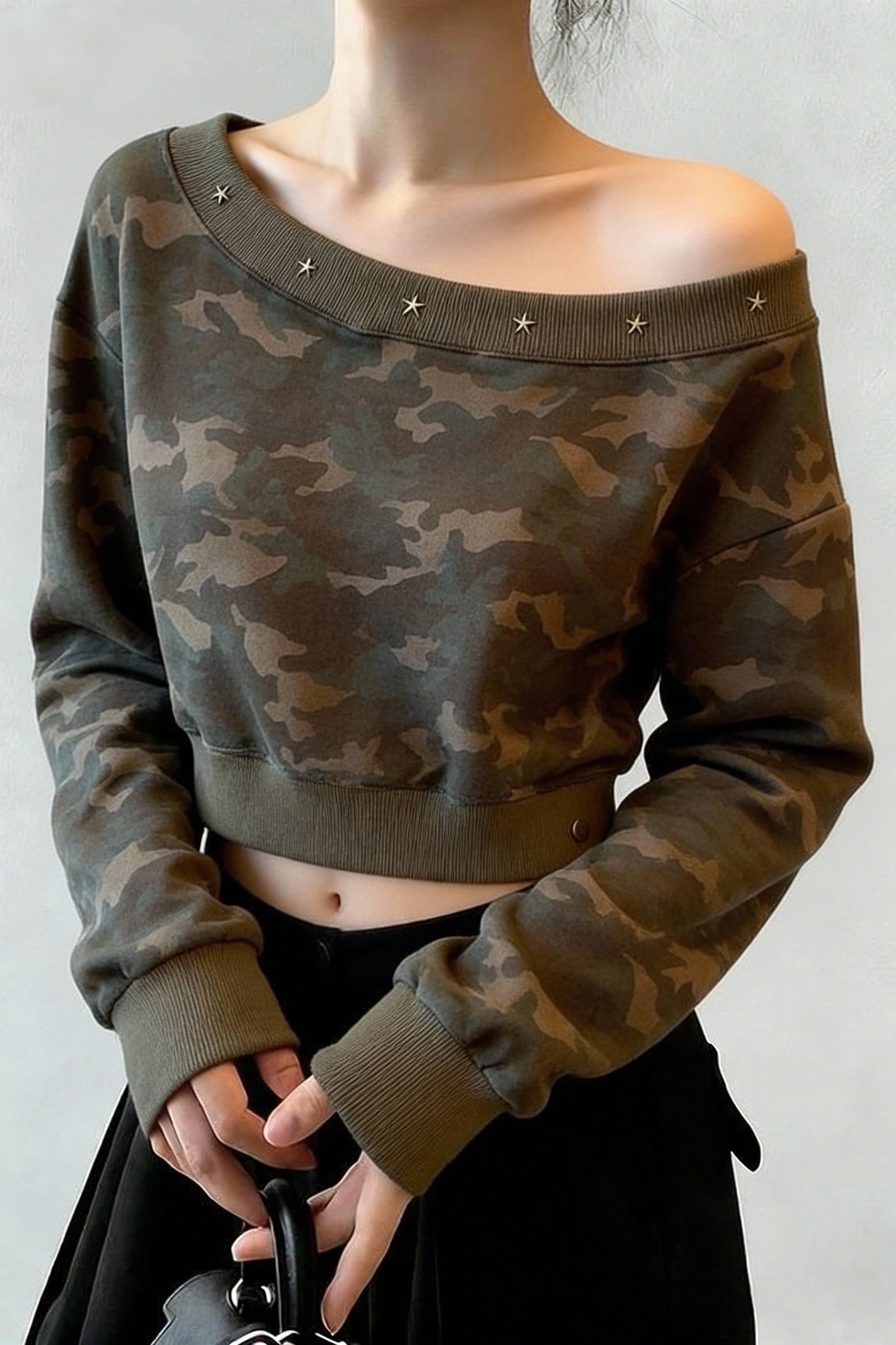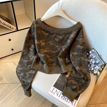 FA54462# 美式复古水洗短款卫衣百搭字母斜肩卫衣迷彩上衣 服裝批發女裝批發服飾貨源