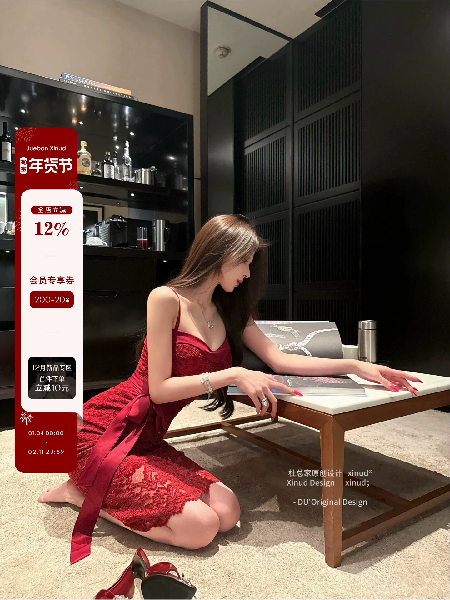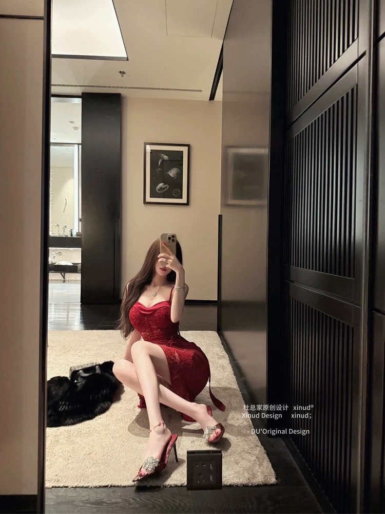 FA54623# 杜总家红玫瑰*女人味红色雪尼尔蕾丝性感纯欲气质吊带连衣长裙 服裝批發女裝批發服飾貨源