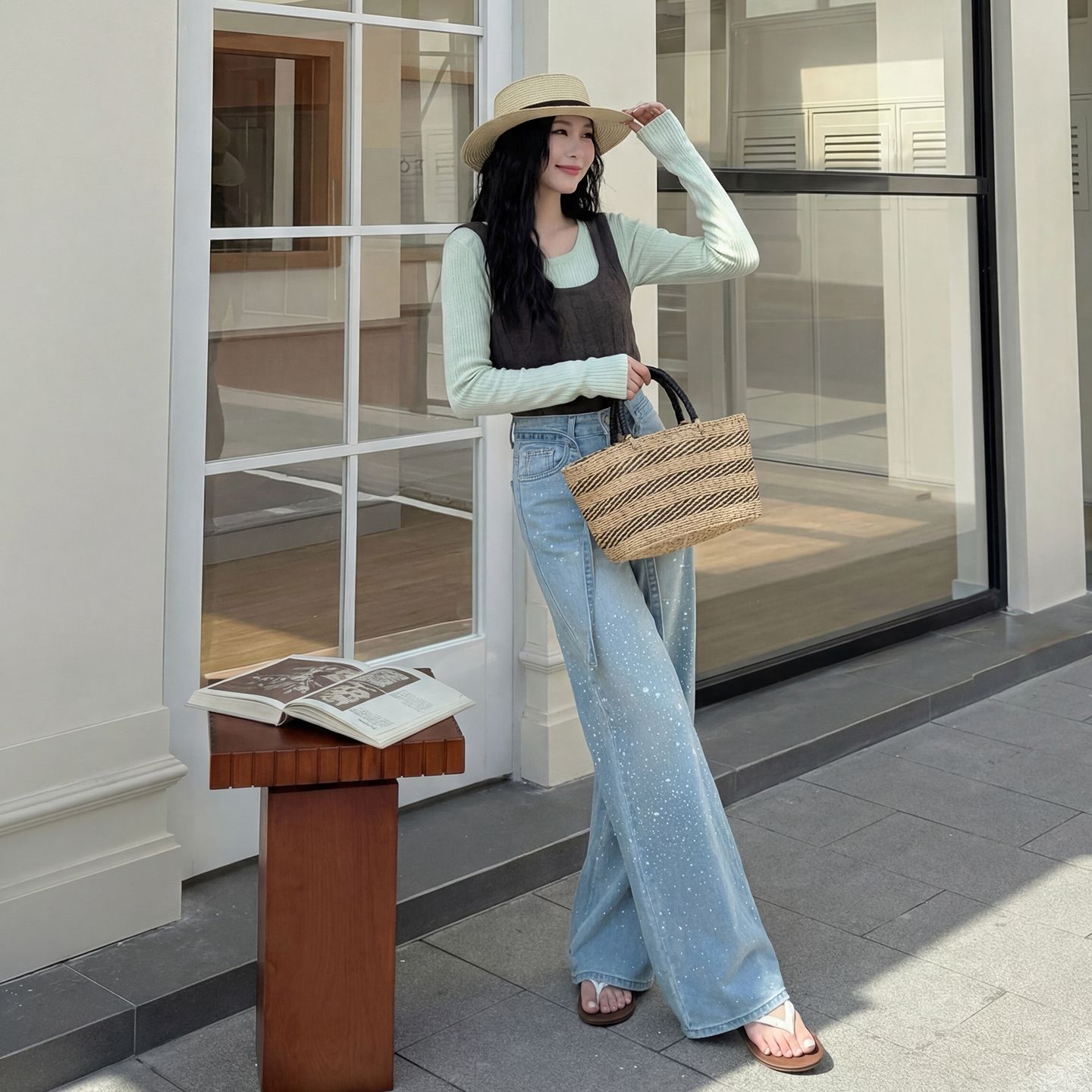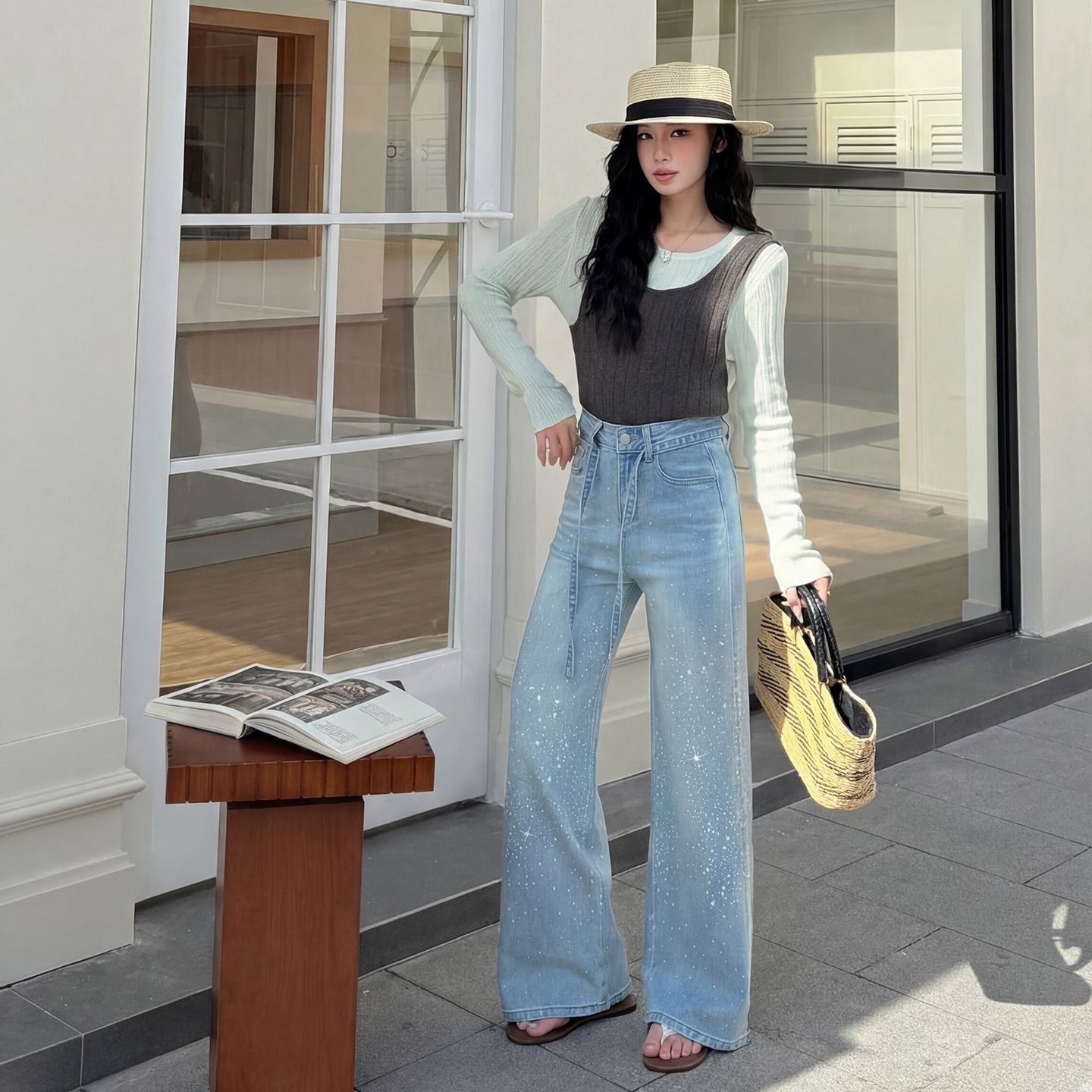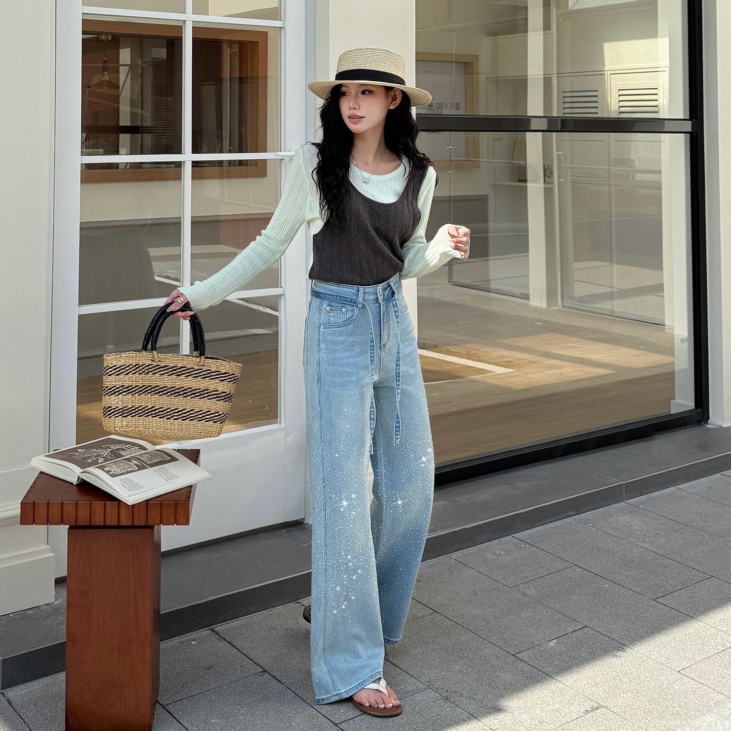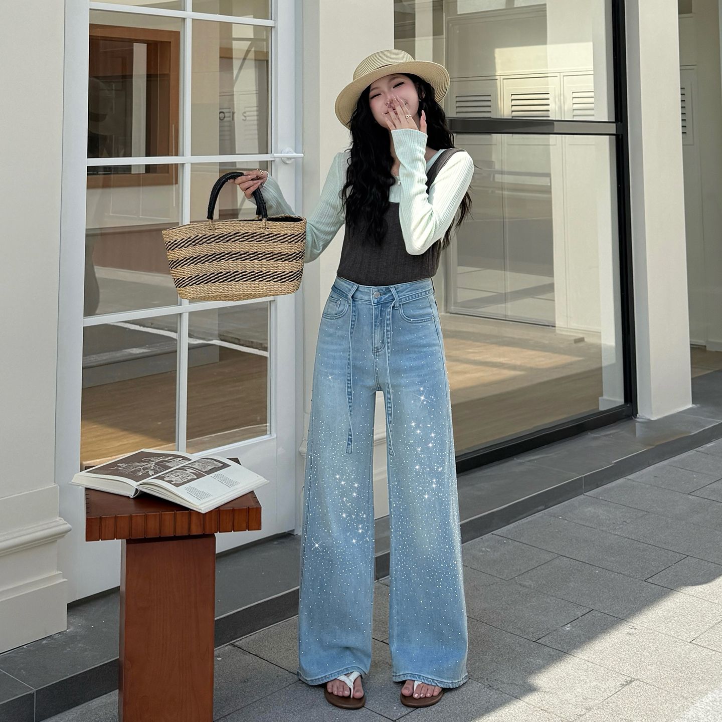 FA54624# 欧货烫钻亮闪闪直筒牛仔裤女春季新款时尚重工高级感阔腿裤 服裝批發女裝批發服飾貨源