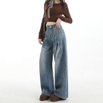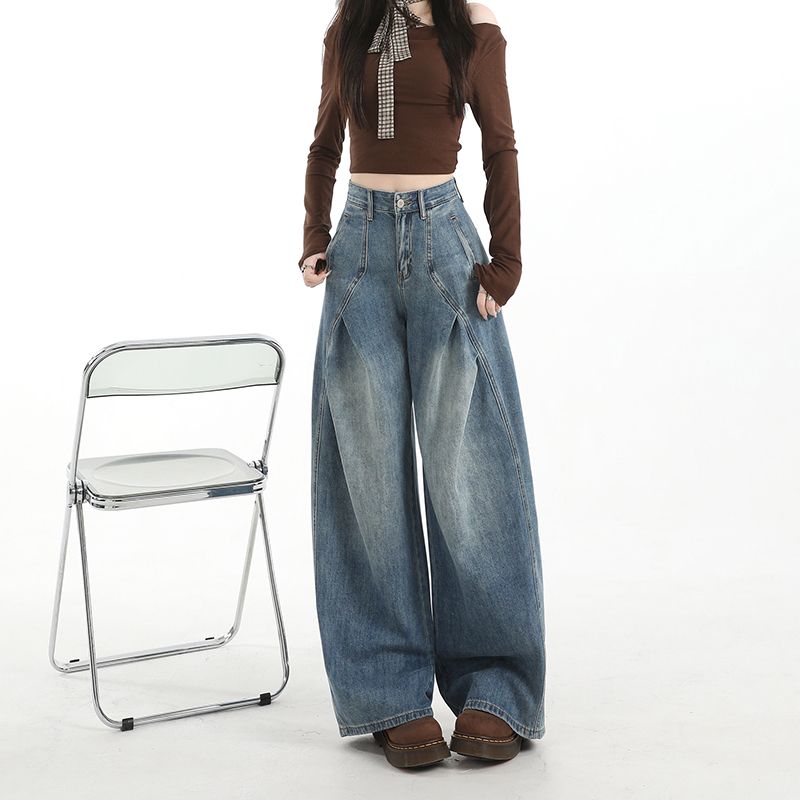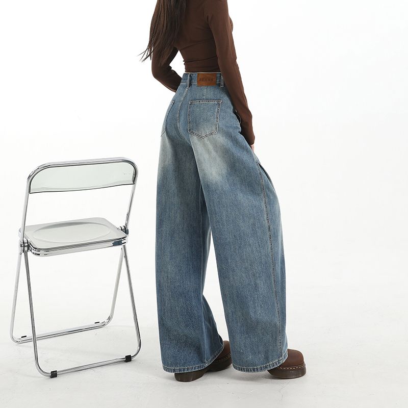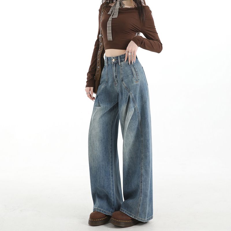 FA54625# 美式复古褶皱牛仔裤女高街直筒阔腿裤宽松解构长裤子 服裝批發女裝批發服飾貨源