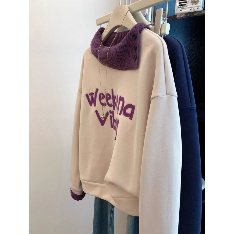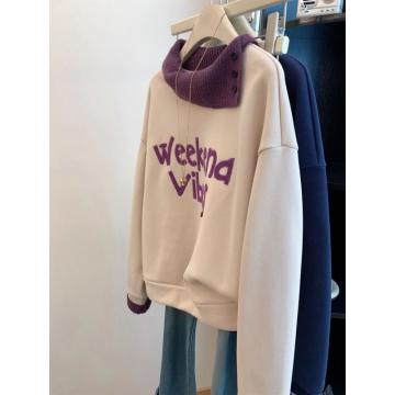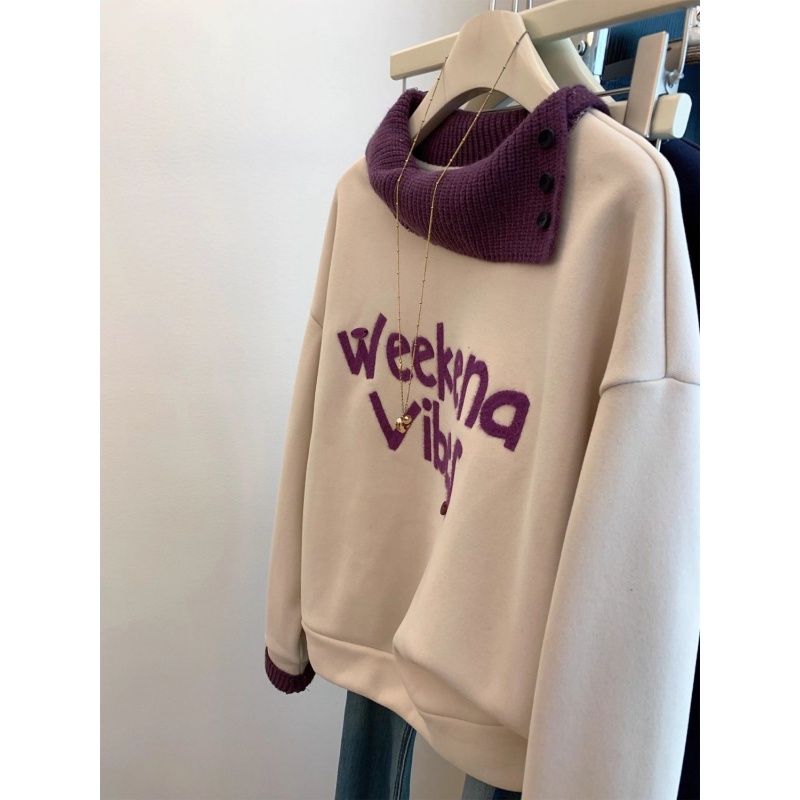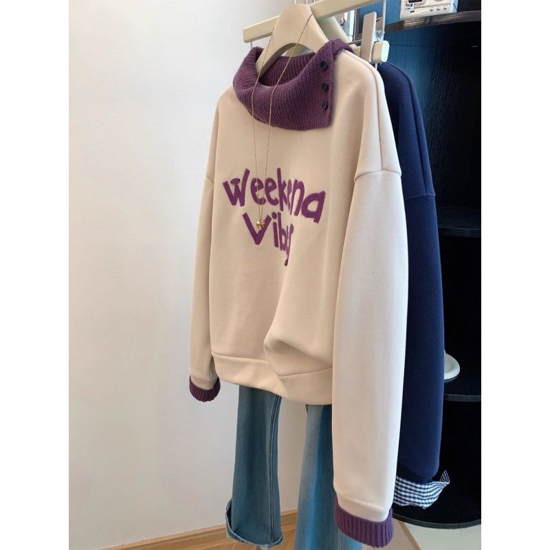 FA54766# 原版韩系植绒字母拼接针织假两件落肩袖加绒卫衣女秋冬宽松上衣潮 服裝批發女裝批發服飾貨源