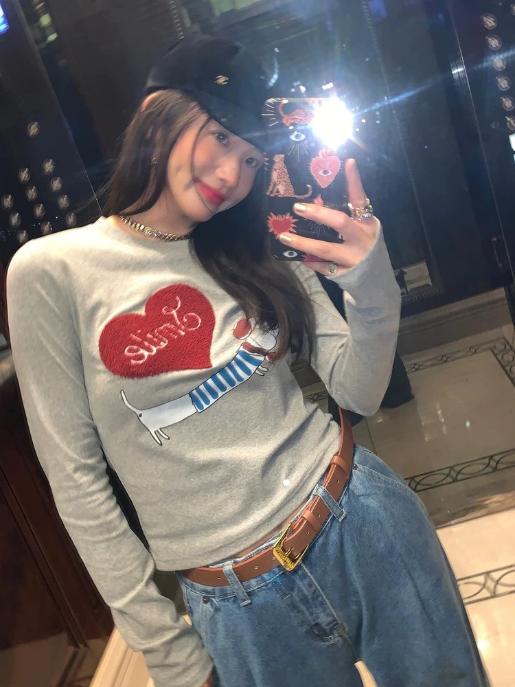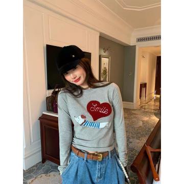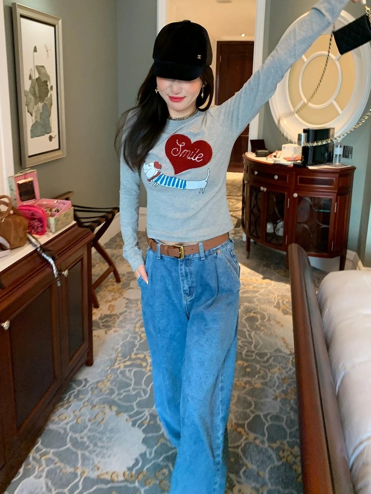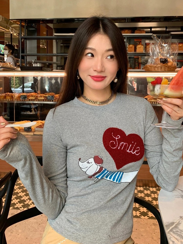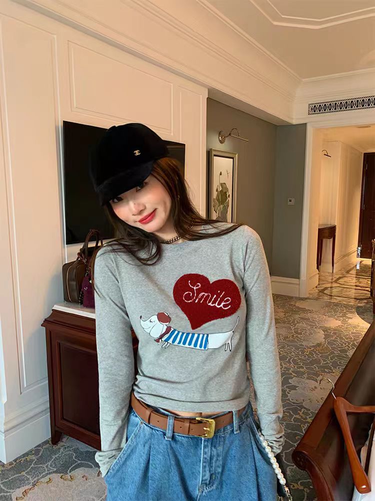 FA54791# 韩系正肩小狗爱心长袖T恤女春秋新款修身显瘦减龄收腰打底衫上衣 服裝批發女裝批發服飾貨源