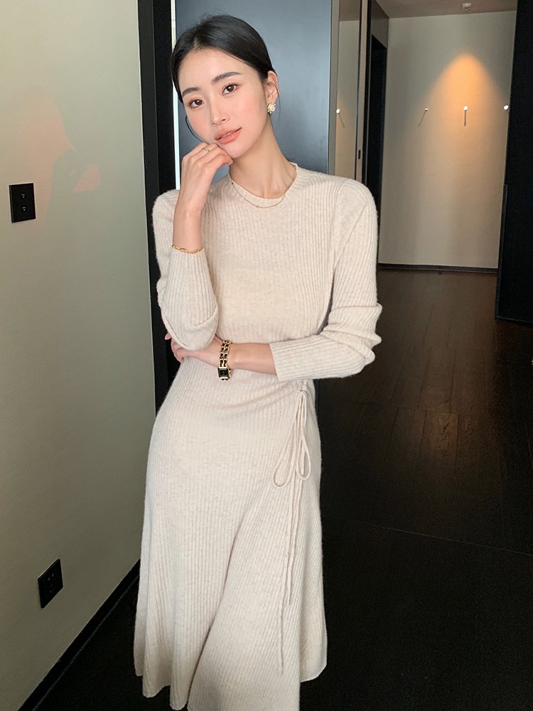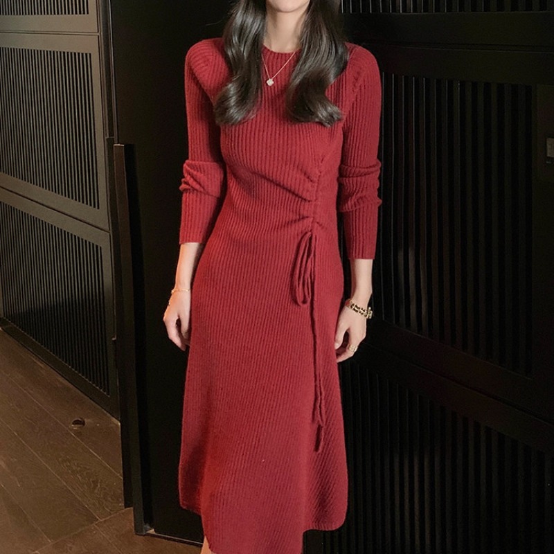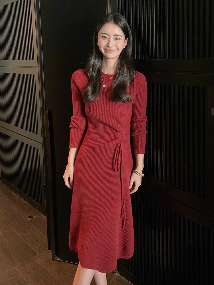 FA54932# 韩国春装新年红色连衣裙女中长款收腰显瘦过膝长裙针织打底毛衣裙 服裝批發女裝批發服飾貨源