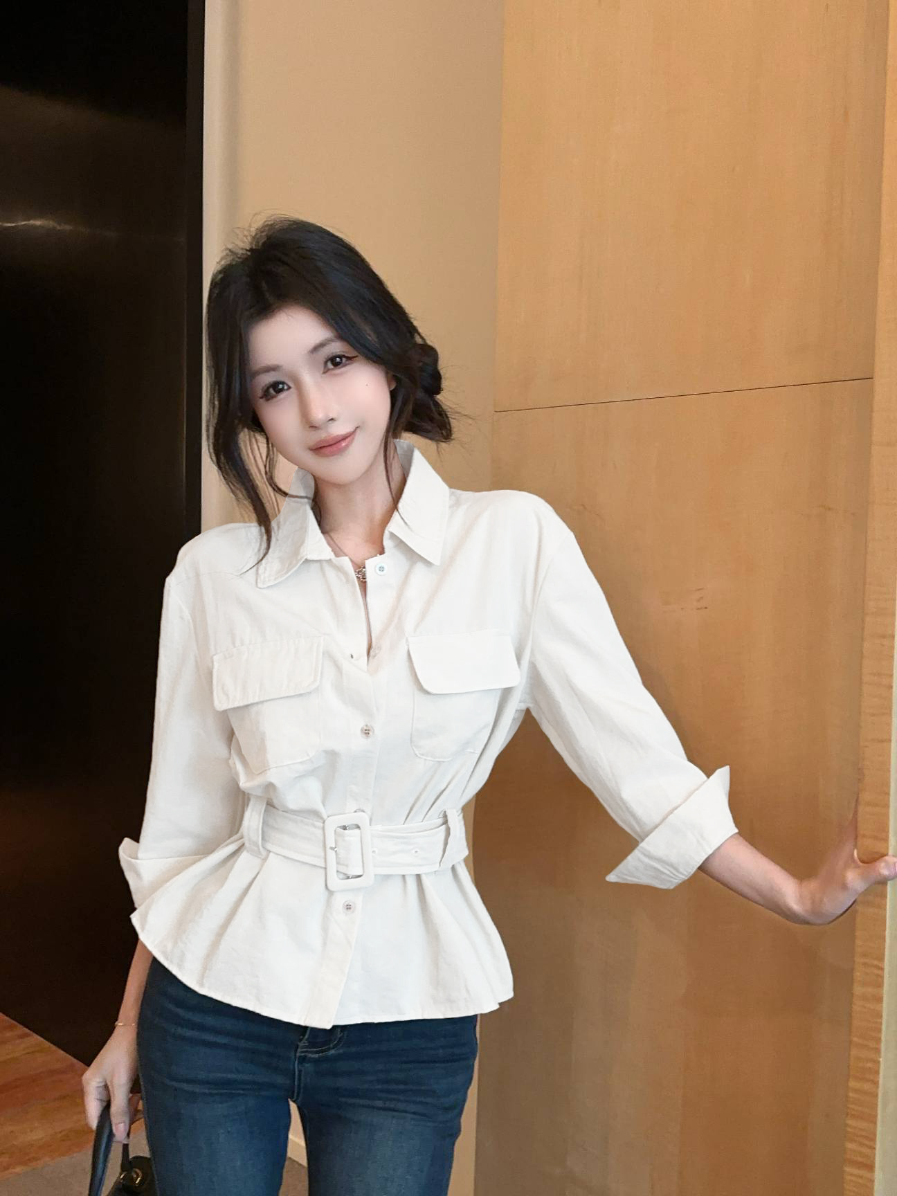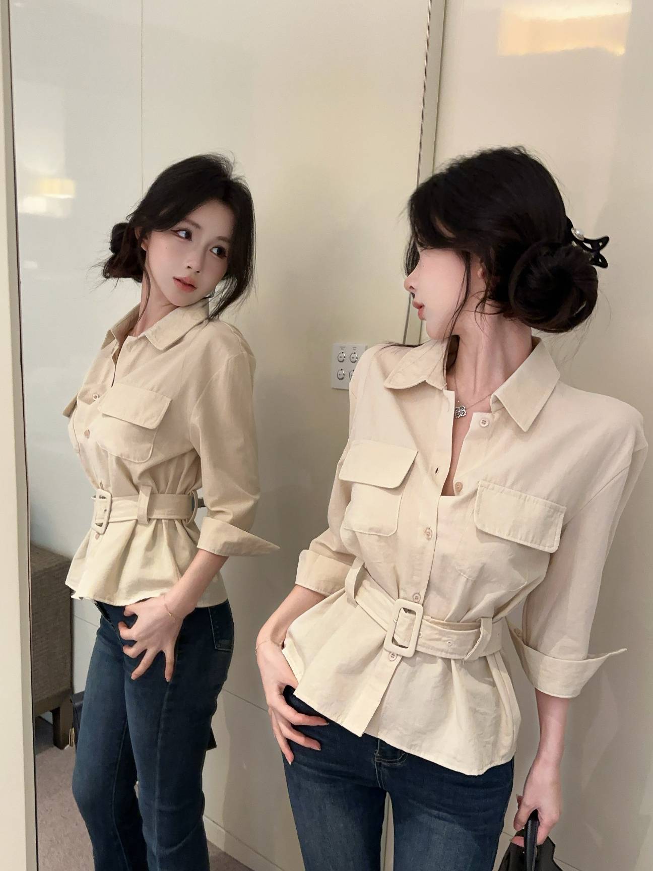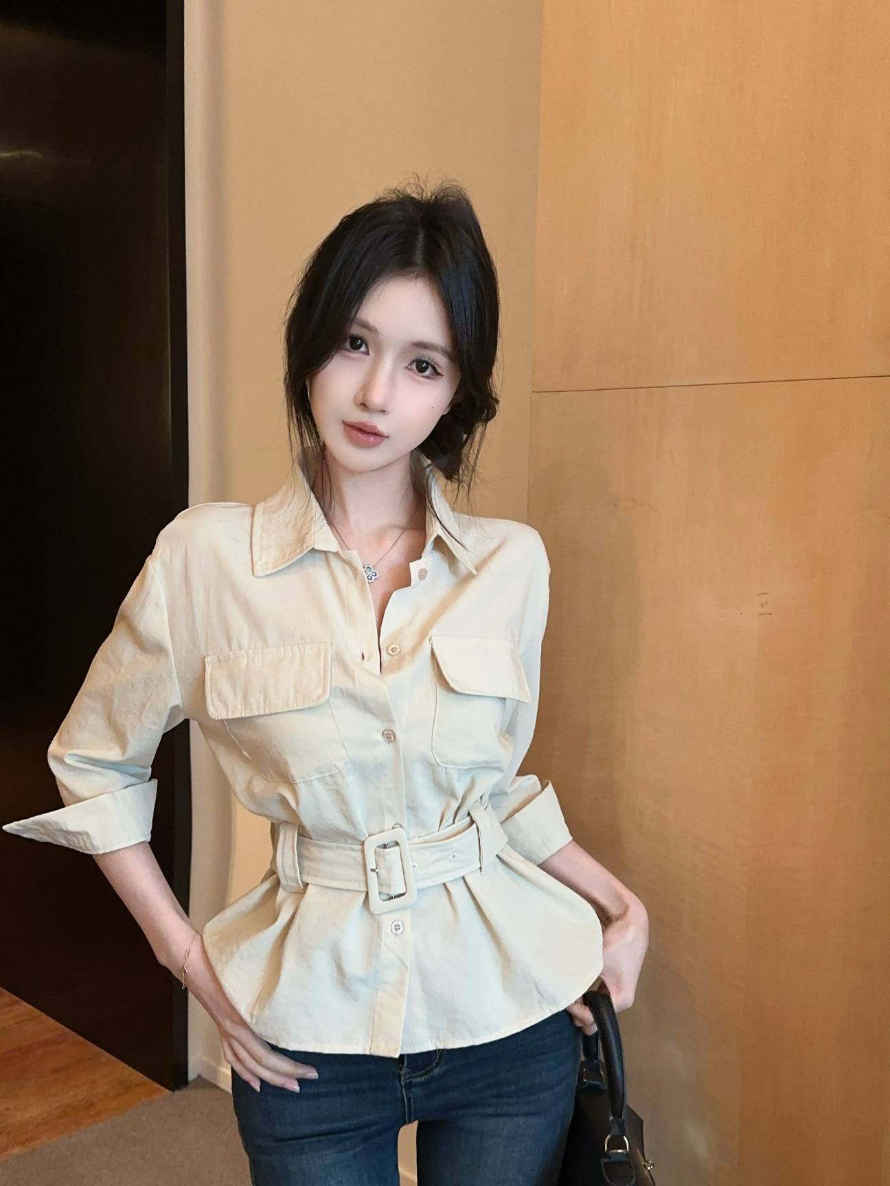 FA54983# 春款纯欲辣妹重工设计感双口袋饰衬衫女,配腰带 服裝批發女裝批發服飾貨源