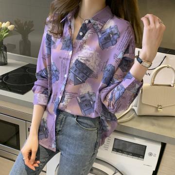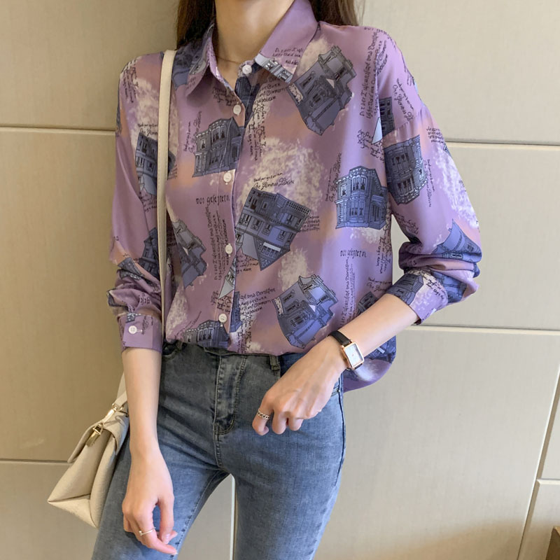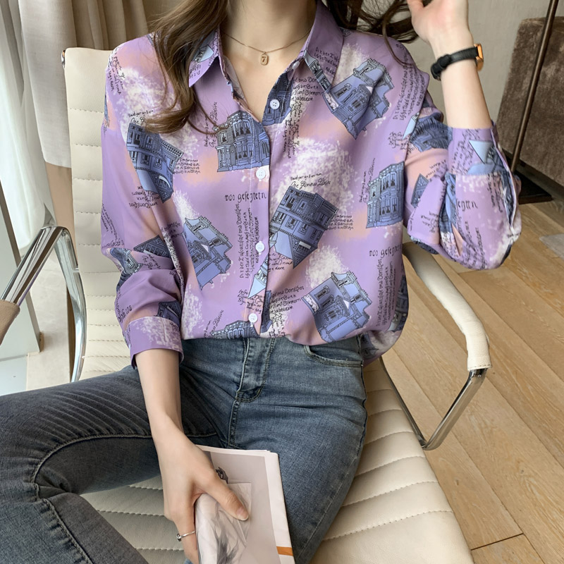 FA55004# 洋气休闲春秋新款女装翻领紫色雪纺衫上衣开衫衬衫打底衫衬衣 服裝批發女裝批發服飾貨源