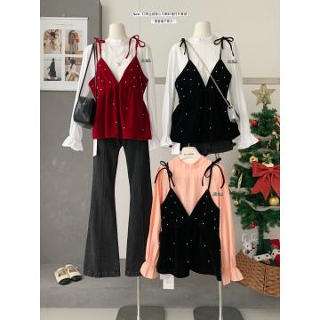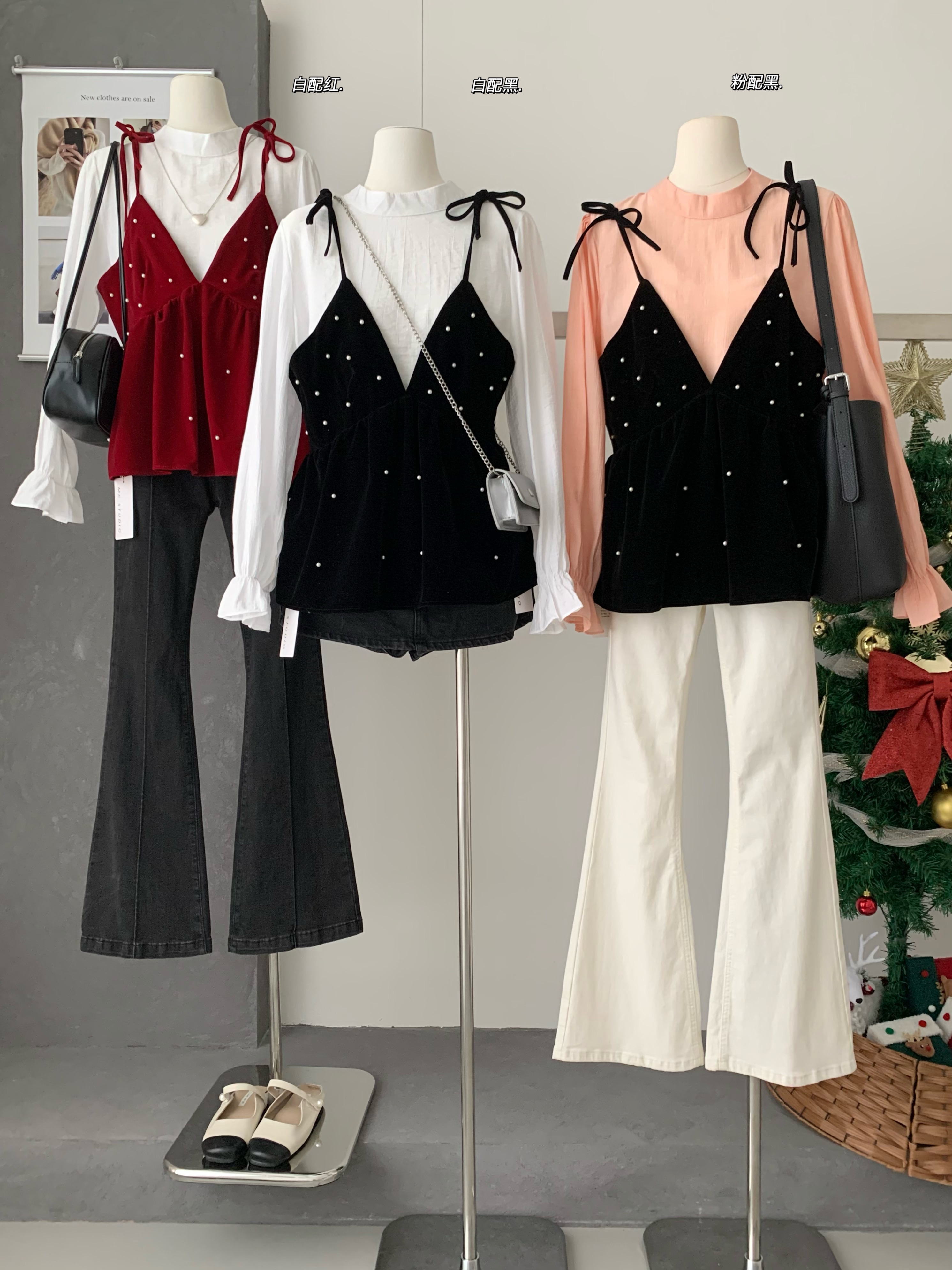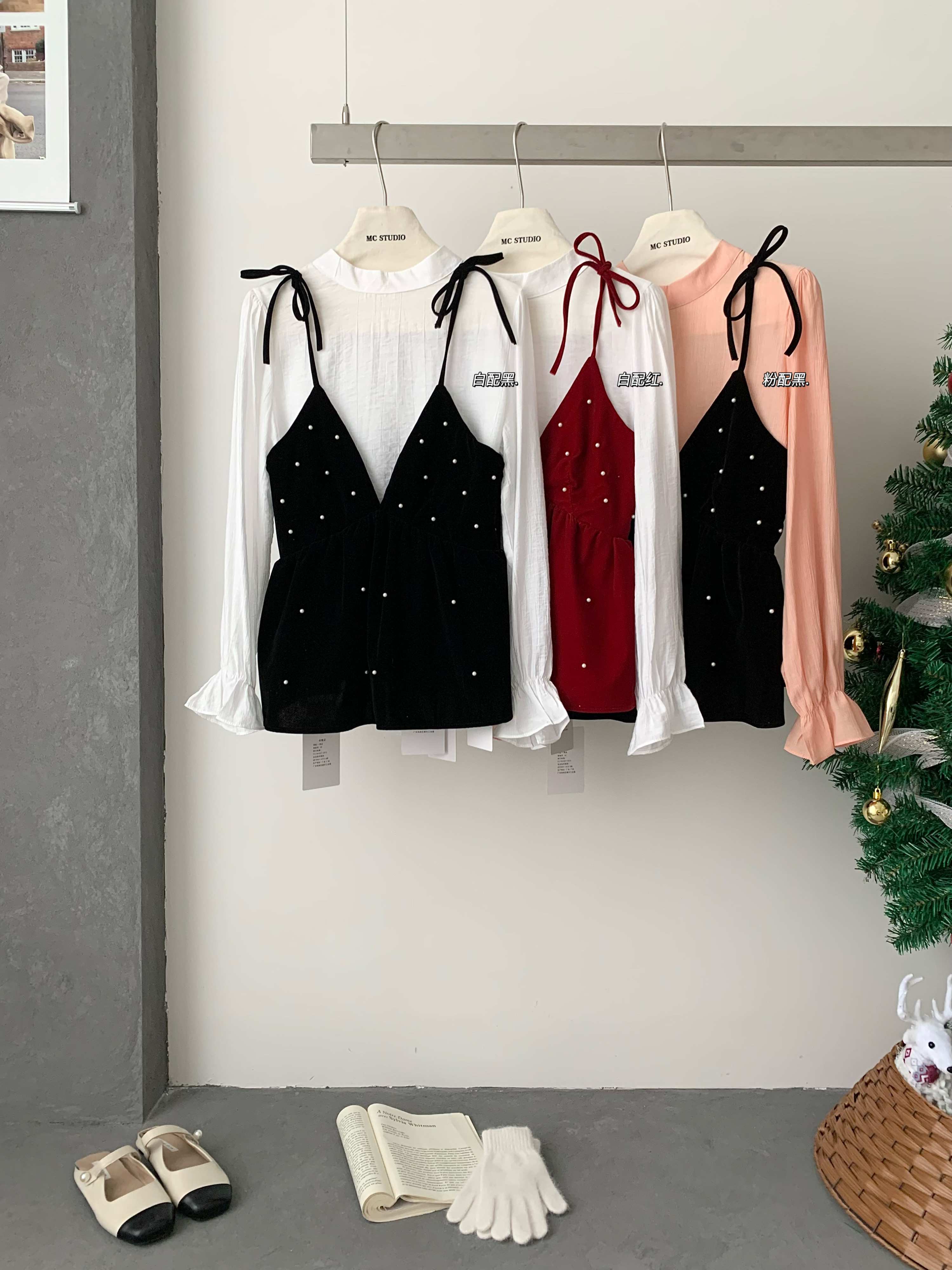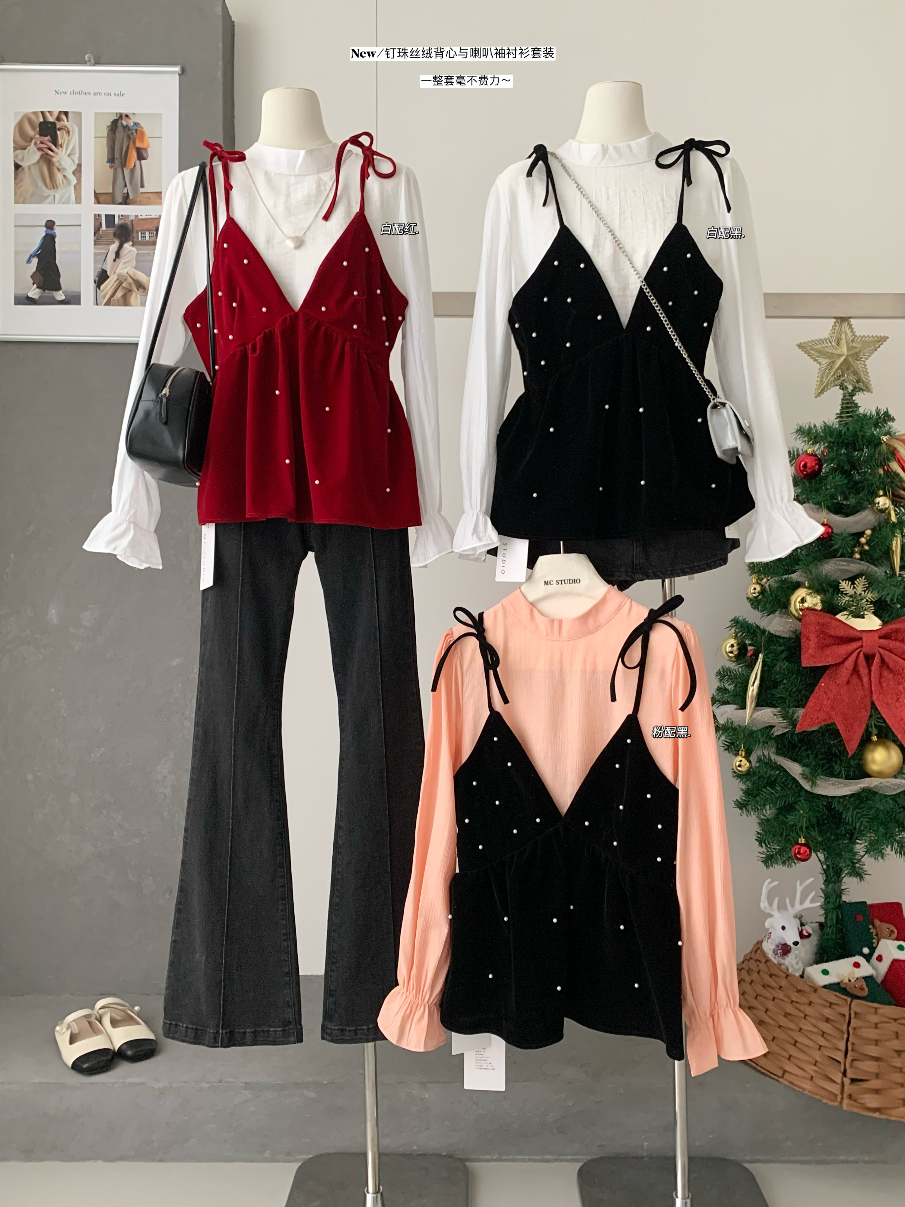 FA55014# 韩系气质法式喇叭袖衬衫+钉珠丝绒吊带背心上衣两件套装 服裝批發女裝批發服飾貨源